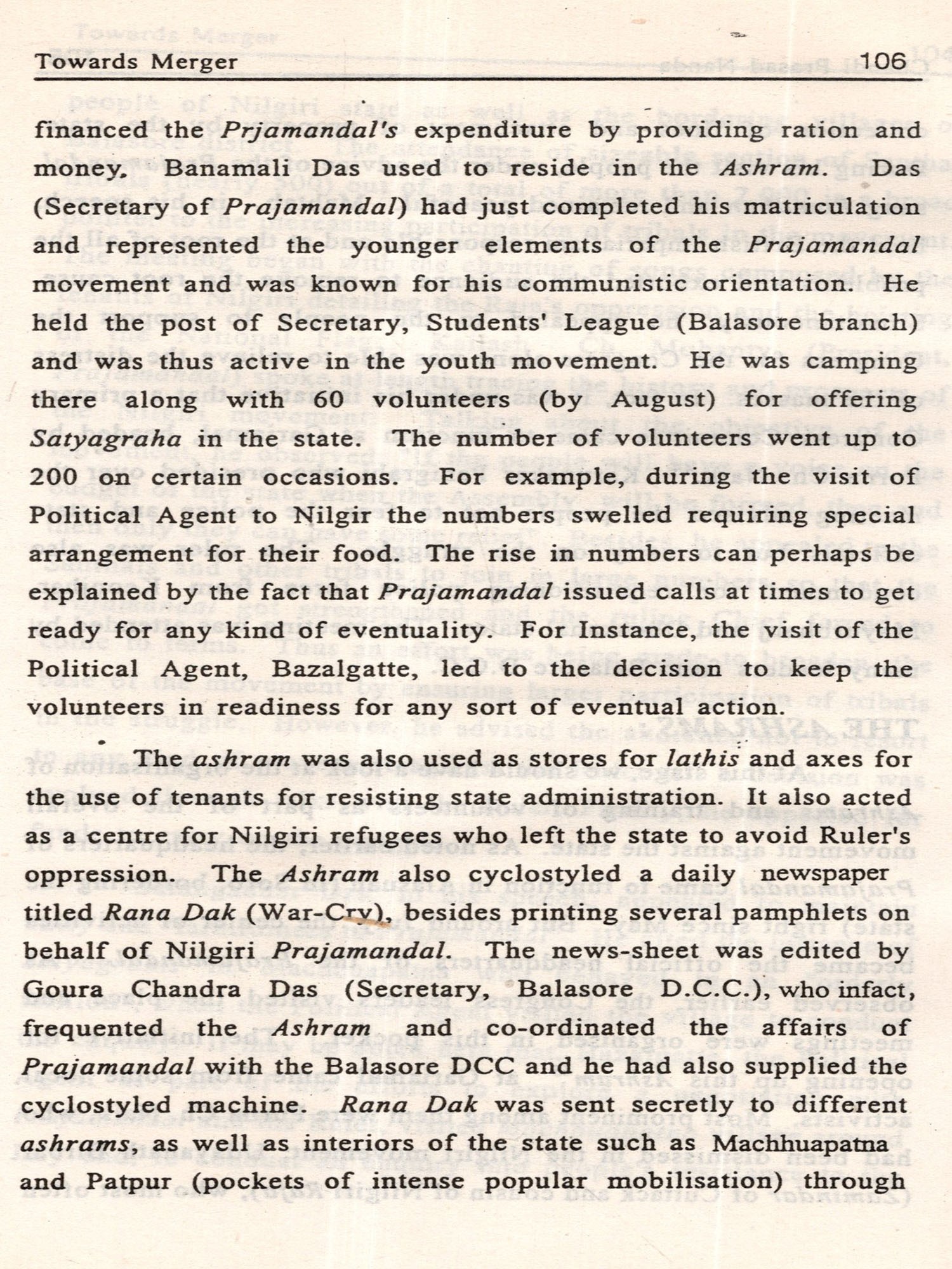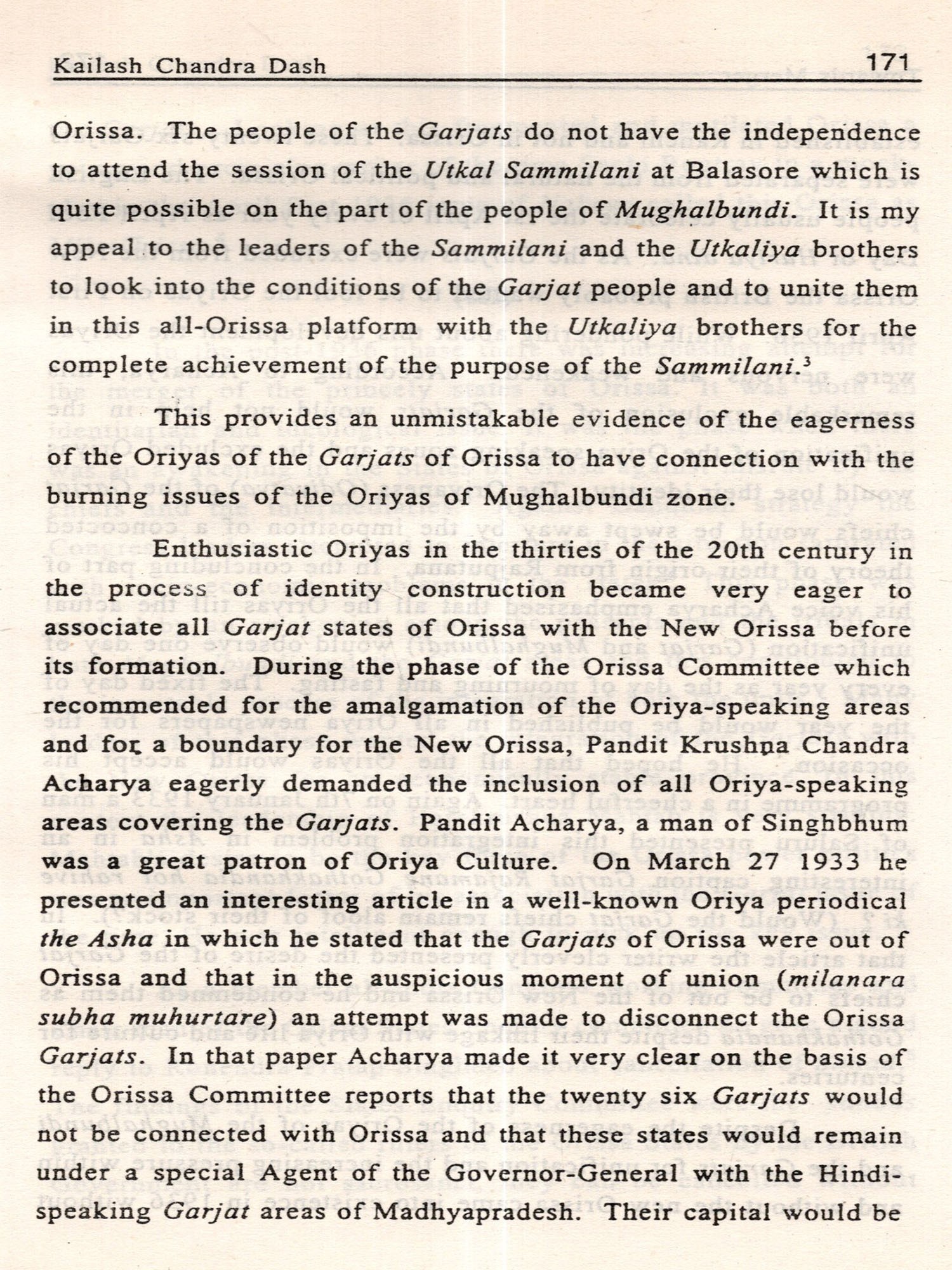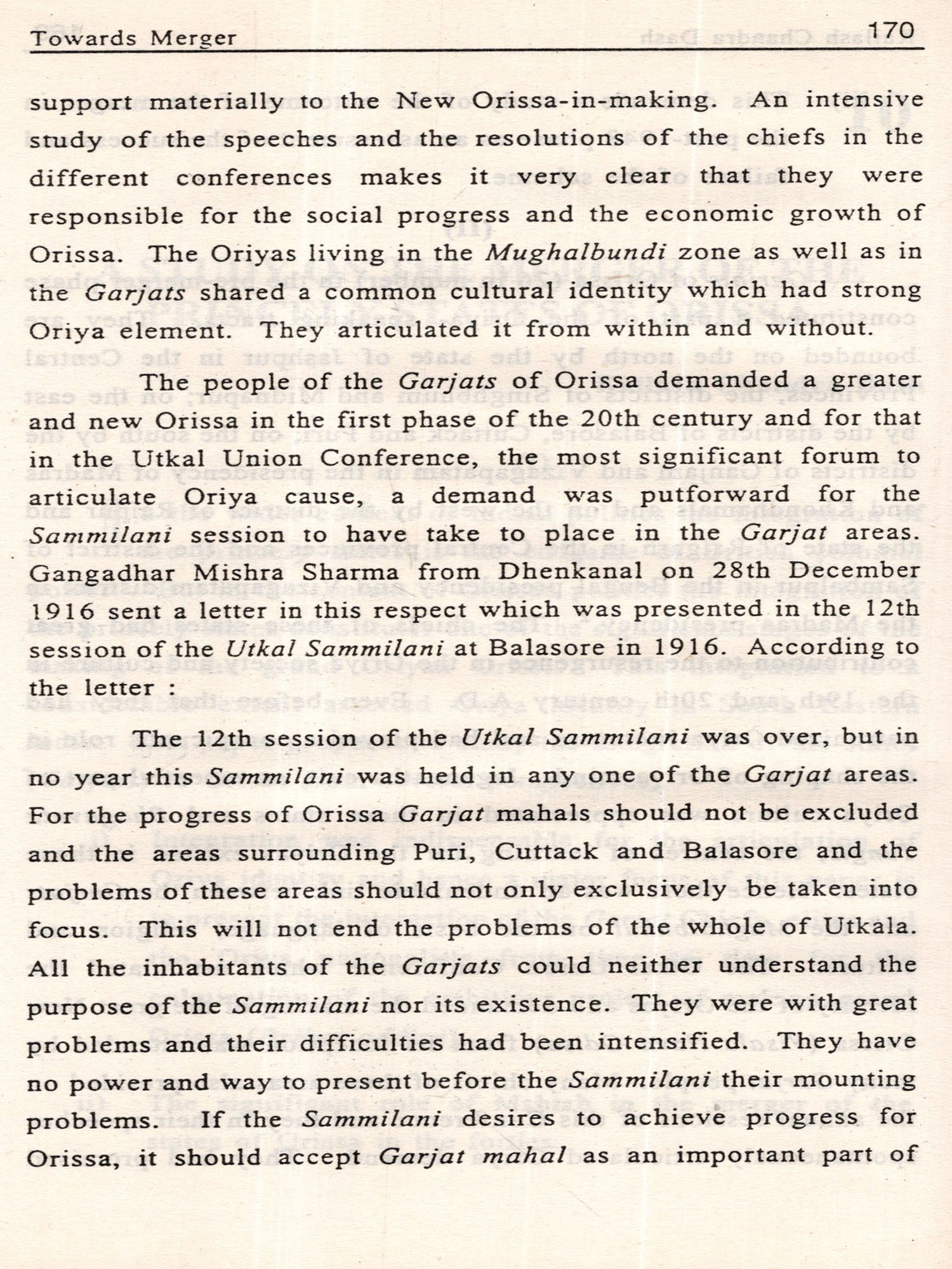 The integration of the Garjats with Orissa culminated after a prolonged process. It passed through many hazy steps. In the first phase of the 20th century many new leaders provided potent source of inspiration to this move, by their speeches (as reported in the periodicals). The consciousness of the tribals and the peasants in both the zones, awakening in the Garjats against the tyrannical and authoritative rule of the chiefs and awakening in the coastal belt in Orissa against colonialism lent support to merger. Many people in both the zones articulated a common cultural identity which would only take shape by merger. Politically and economically the merger was indispensable for a stable new Orissa. It is true that many of the Garjat Chiefs eagerly wanted the formation of the Eastern States' Union. But leaders like Harekrushna Mahtab, Sarangadhar Das and many Prajamandal workers were determined for the merger of the two zones. They insisted on the merger for the establishment of an economically stable Orissa and for the preservation of Oriya culture and tradition. Despite decades of rapid and radical political change in India and Orissa, diplomacy of the princes, strategic thinking of the Garjat leaders, darbari administrative rationalization and Constitutional reforms, merger was accepted as the only possible solution of the problem.