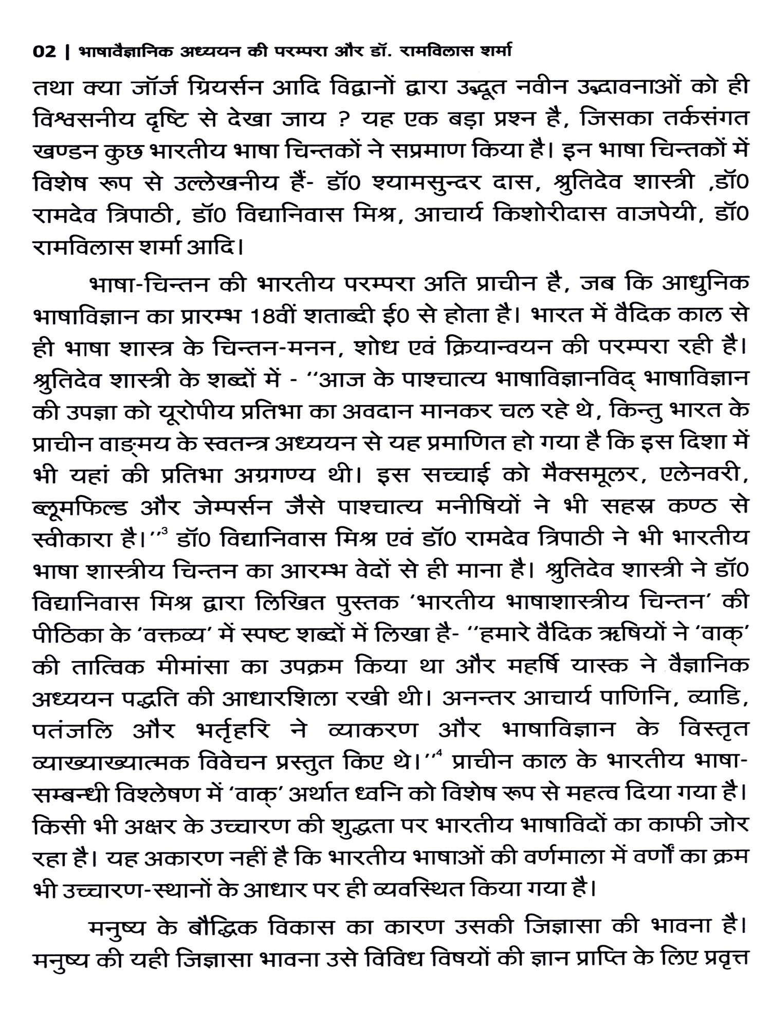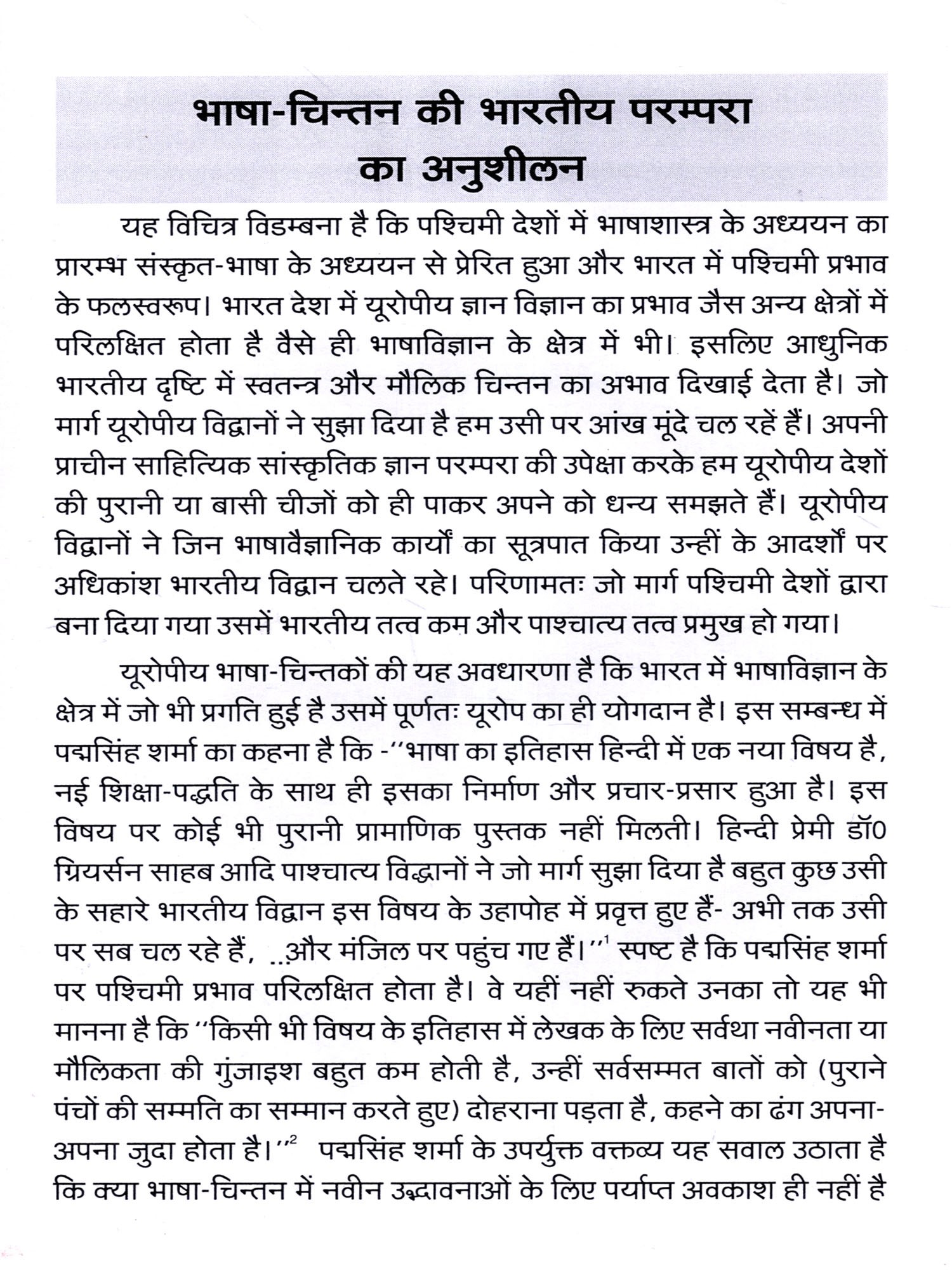 प्रथम अध्याय के अन्तर्गत भाषा-चिंतन की समूची भारतीय परम्परा पर विचार किया गया है। इसमें मुख्य रूप से इस तथ्य को उद्घाटित करने का प्रयत्न किया गया है कि हमारी भारतीय भाषा की चिन्तन धारा कितनी समृद्ध है और जिसकी पाश्चात्य और भारतीय भाषा चिन्तकों द्वारा घोर उपेक्षा की गई। डॉ. शर्मा ने किस प्रकार अपने गम्भीर अध्ययन और सूक्ष्म अन्वेषण से भारतीय भाषा-चिन्तन की परम्परा के महत्व को न केवल उद्घाटित करने का प्रयत्न किया है बल्कि सामाजिक विकास के परिप्रेक्ष्य में उसका अध्ययन करते हुए कई मौलिक स्थापानाएं भी दीं हैं, इसकी सुचिन्तित विवेचना की गई है।