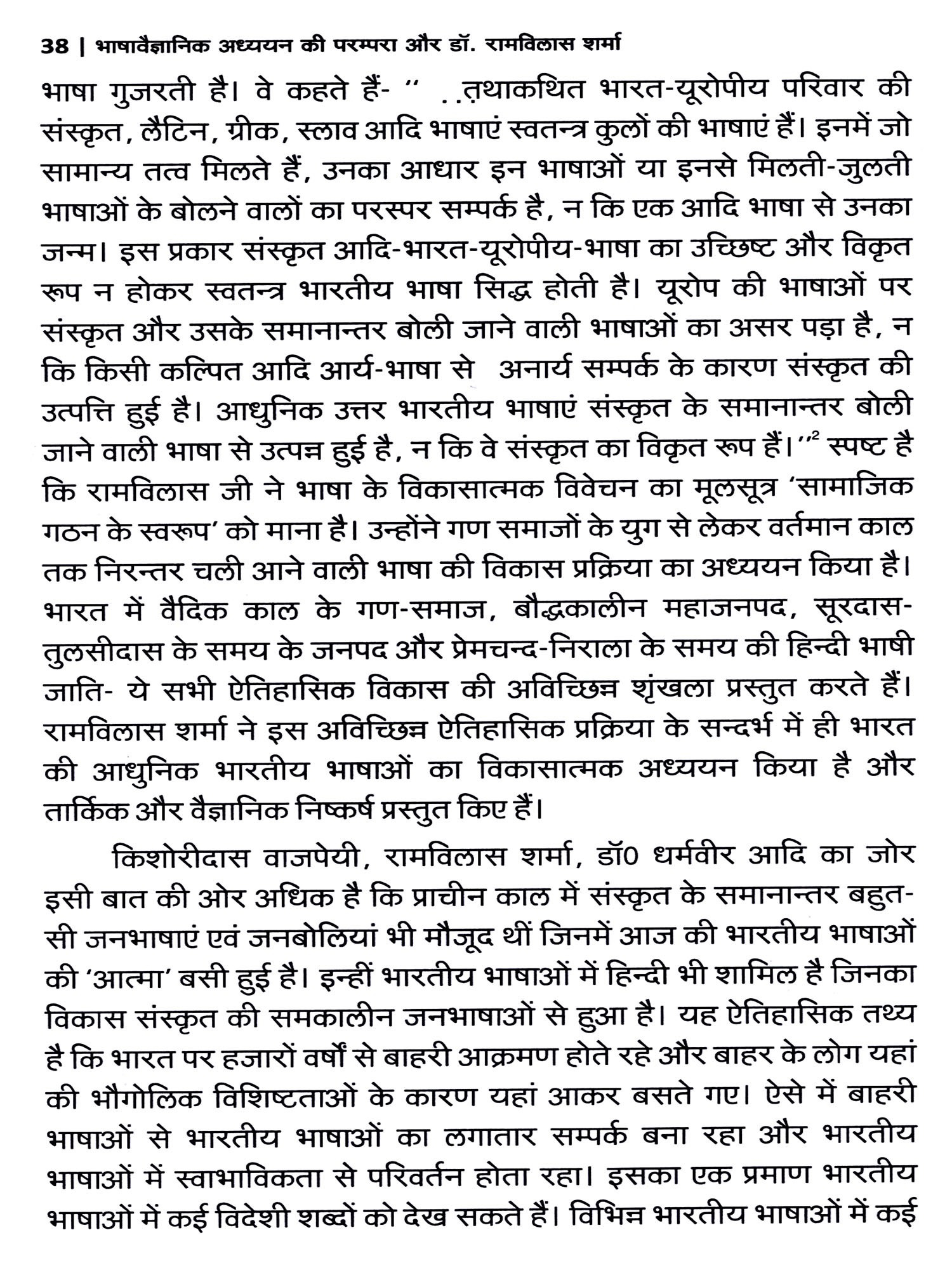 रामविलास जी विश्व के उन विशिष्ट भाषा-चिन्तकों में हैं, जिन्होंने भाषाविज्ञान के क्षेत्र में अपनी नवीन स्थापनाओं द्वारा भाषाविज्ञान को नई दिशा प्रदान की है। उनका मानना है कि भारतीय संस्कृति के विकास में हिंदी भाषा का महत्वपूर्ण योगदान है। इसीलिए वे हिंदी भाषा, हिंदी जाति और इसकी सामाजिक, सांस्कृतिक और ऐतिहासिक पृष्ठभूमि के गहन अध्ययन की ओर प्रवृत्त होते हैं। उन्होंने भाषा और समाज का घनिष्ठ संबंध स्वीकार करते हुए भारत की भाषा समस्याओं पर गहन विचार किया है। रामविलास शर्मा आधुनिक भारतीय भाषाओं के विकास को सामन्ती व्यवस्था के पतन के साथ जोड़ते हैं। इसी सन्दर्भ में वे खड़ी बोली के विकास का उल्लेख करते हुए उसे हिन्दी जातीयता के साथ जोड़ते हैं। हिन्दी जातीयता की चर्चा करते हुए वे हिन्दी क्षेत्र की विभिन्न बोलियों और हिन्दी-उर्दू सम्बन्धों पर भी विचार करते हैं। वे भाषा के आधार पर राज्यों के पुनर्गठन का समर्थन करते हुए हिन्दी को विभिन्न राज्यों में बांटे जाने के विचार का विरोध करते हैं। वे इस बात का भी समर्थन नहीं करते कि शासन की सुविधा के लिए छोटे राज्य बनाए जाने चाहिए। भारत का विकास उसकी विभिन्न जातियों के विकास से ही संभव है।
