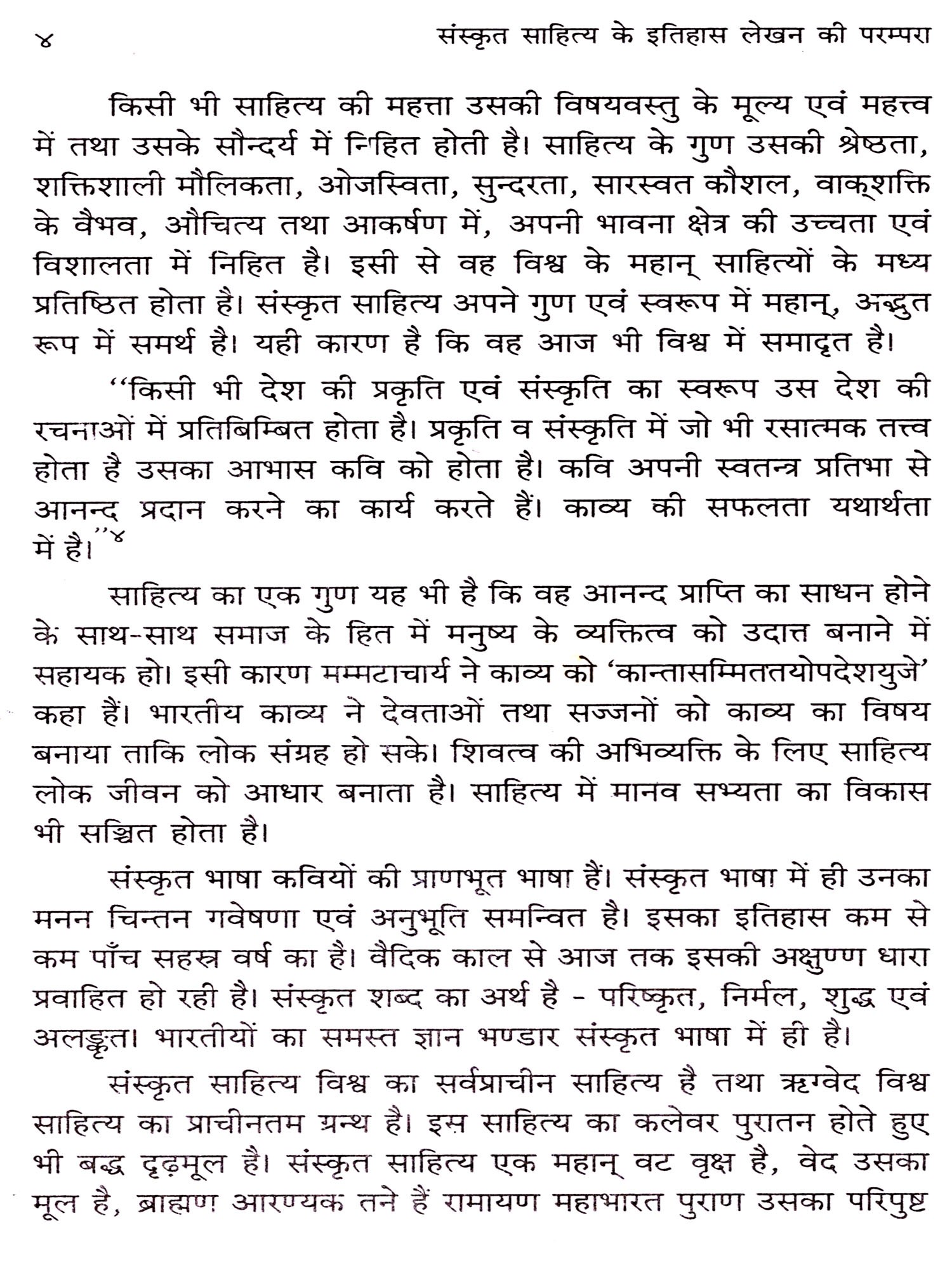 राजशेखर के अनुसार 'पञ्चमी साहित्यविद्येतियायावरीयः। शब्दार्थयोर्यथा-वत्सहभावेन विद्या साहित्यविद्या'। साहित्य किसी देश की राष्ट्रीय, सांस्कृतिक तथा जातीय भावनाओं का प्रतीक होता है। संस्कृत साहित्य भारत का राष्ट्रीय गौरव है। प्रत्येक देश के साहित्य में उस देश के निजी गुणदोष प्रतिबिम्बित होते हैं। संस्कृत साहित्य सम्बन्धी उन आदशों, मान्यताओं एवं विशेषताओं का ज्ञान आवश्यक है, जिसके माध्यम से इस साहित्य ने भारत को आत्मबल प्रदान कर उच्च स्थान पर प्रतिष्ठित किया। एम० विलियम ने संस्कृत साहित्य की समृद्धि की प्रशंसा करते हुए कहा है-