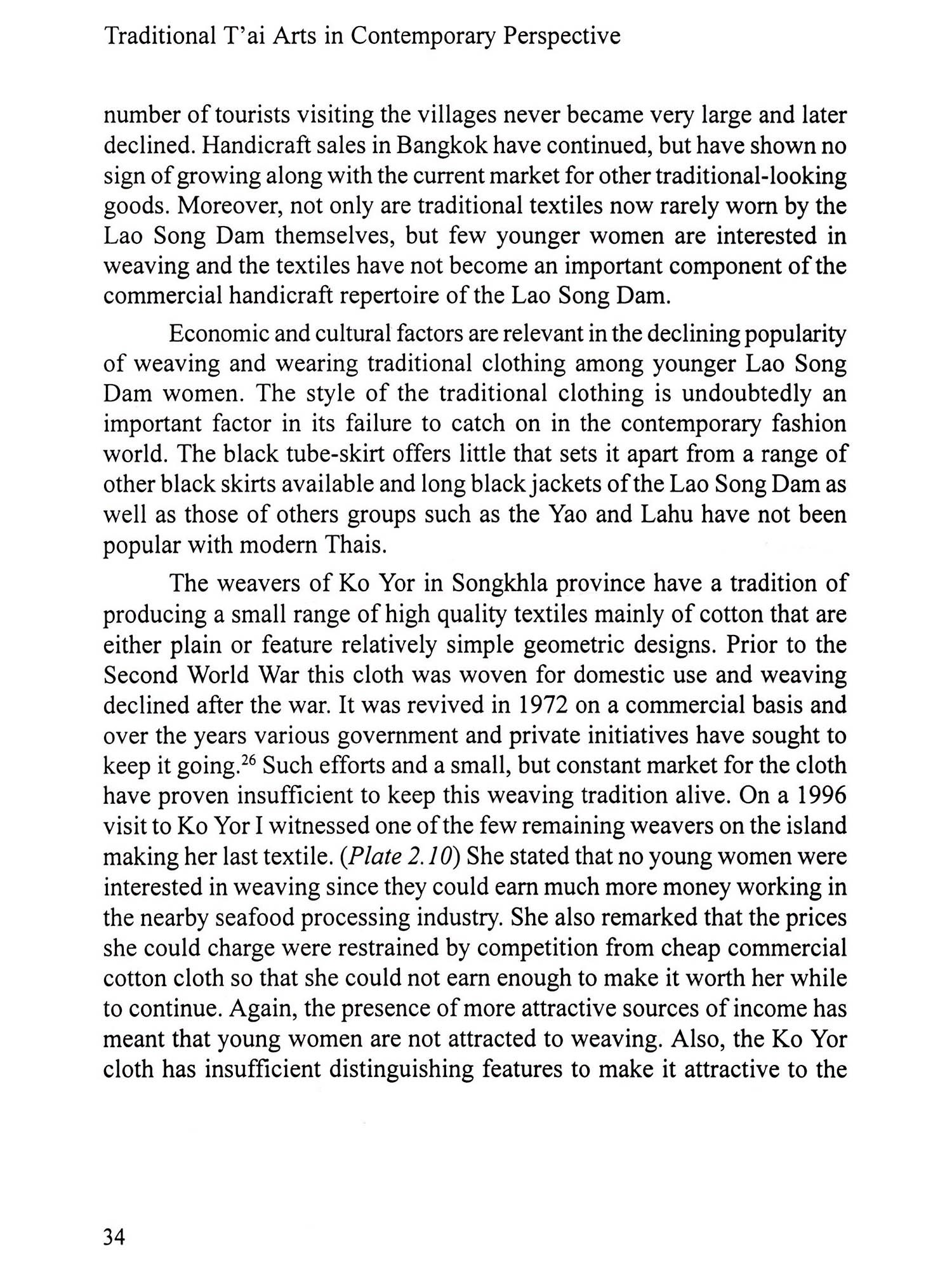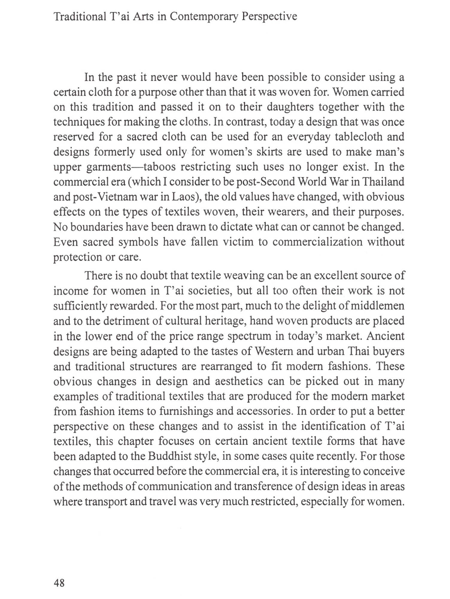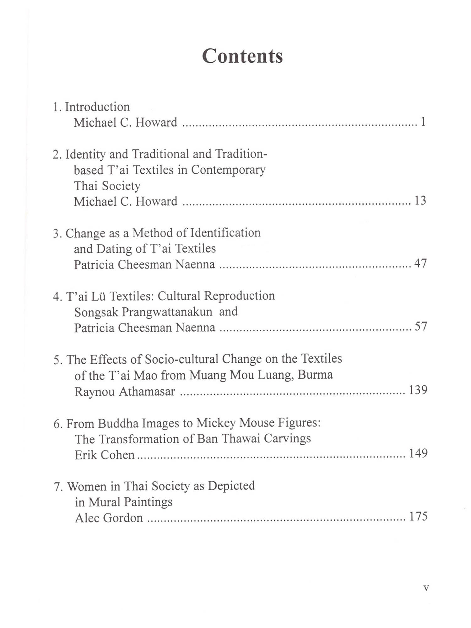 The collection of chapters included in the present volume examine contemporary developments in T'ai arts as well as offering contemporary views of T'ai arts from the past. The focus is on the arts of T'ai peoples in Thailand, but attention is also paid to T'ais in the neighboring countries of Laos, Burma, China, and Vietnam as well. Such a geographical spread reflects a growing interest in the comparative study of T'ai-speaking peoples living in different political and social settings in an effort to better understand common themes in T'ai culture as well as how it has evolved and manifested itself throughout the region. In addition to having a geographically diverse coverage, the chapters examine a variety of forms of artistic expression, including weaving, carving, painting, dancing, and boxing. The inclusion of such an array of topics elicits definitional questions, especially in regard to distinctions that are commonly drawn between arts and crafts. It is not my intent here to engage in a definitional debate about what is and what is not art, but rather simply to employ a broad and widely accepted definition linking artistic expression with the production or performance of something that is judged to have a special aesthetic quality to it either by members of a particular society or cross-culturally. Accordingly, crafts have the potential to be works of art, but not all crafts are viewed as such. In this regard, the intent of the producer is not always a guideline, although it often is since within most cultures standards exist that set the exceptional bowl, basket, or dress apart from the everyday. Perhaps nowhere is the difficulty in establishing a hard and fast rule about what is art and what is not more apparent than in the case of martial arts. It is undoubtedly easier to gain consensus regarding the artistic merit of almost any type of dance than it is to gain artistic respectability for even the most ritualized form of combat. Thus, the presence of a chapter on Thai boxing as a form of martial art may raise a few eyebrows. My own view is that, especially within the context of T'ai culture, such a martial art is a very important form of artistic expression and one that is, in fact, closely associated with dance in T'ai culture. This is not to say that all boxing is art any more than that all dance is art, but that both types of performance have the potential to be elevated to a form of artistic expression and that in T'ai culture some forms of martial combat have achieved this designation. There are several themes that are especially important in contemporary analyses of T'ai artistic expression. One overall theme is the evolution of the practice and perception of traditional T'ai arts in the face of rapid change and unprecedented global influences. The T'ai have always drawn on outside influences in their arts, but have modified such influences in such a way as to maintain a distinctly T'ai character. Moreover, T'ai arts have never been static and have always shown an interesting blend of innovation and conservatism. However, the extent of external influences and pressures to change today are unprecedented and lead to questions about the ability of the T'ai people in the modern globalized world to continue to assimilate things from outside and to incorporate them into the creation of distinctly T'ai forms of artistic expression. Many past art forms and traditional motifs are local versions that differ only slightly from those found elsewhere.