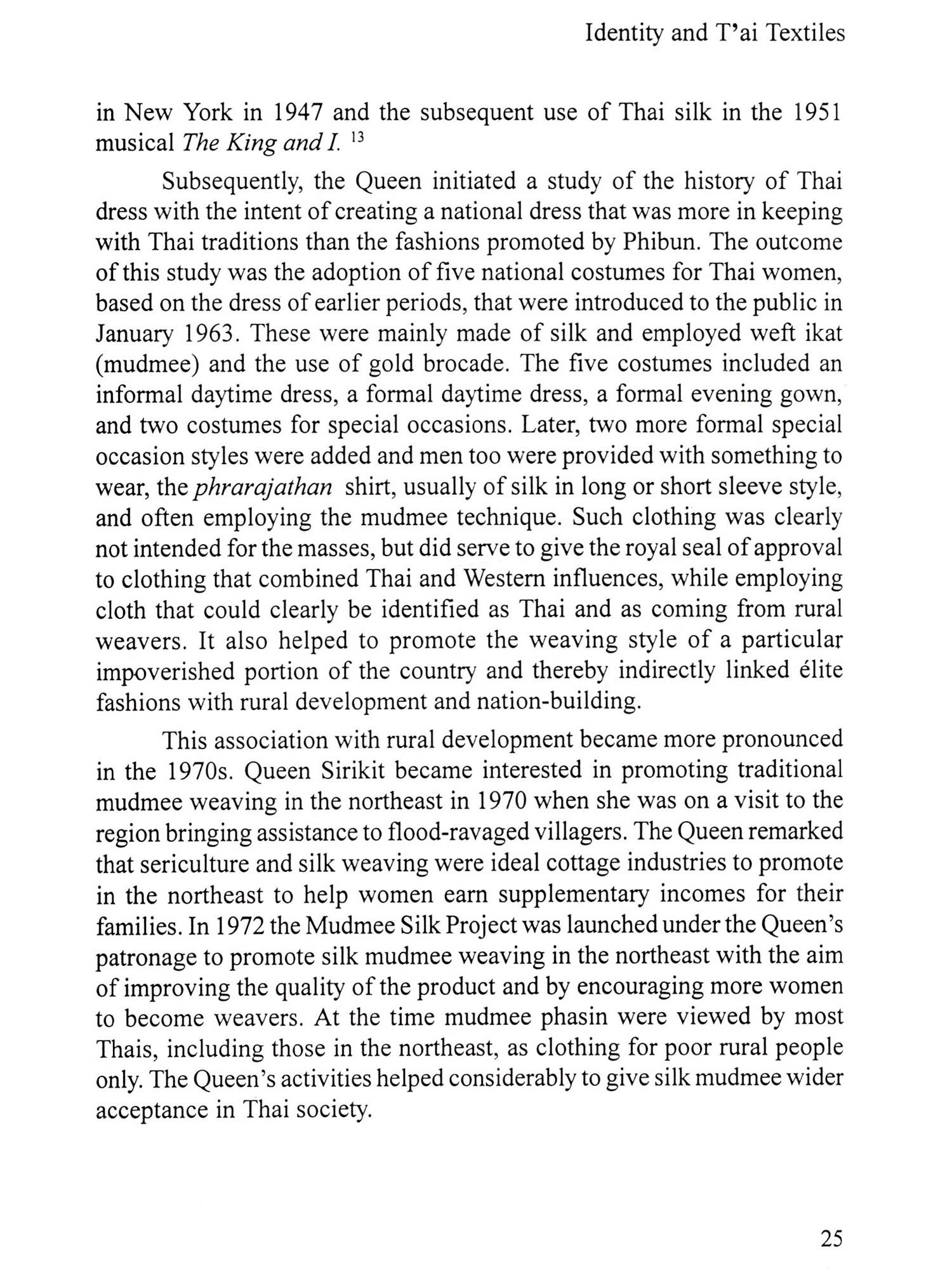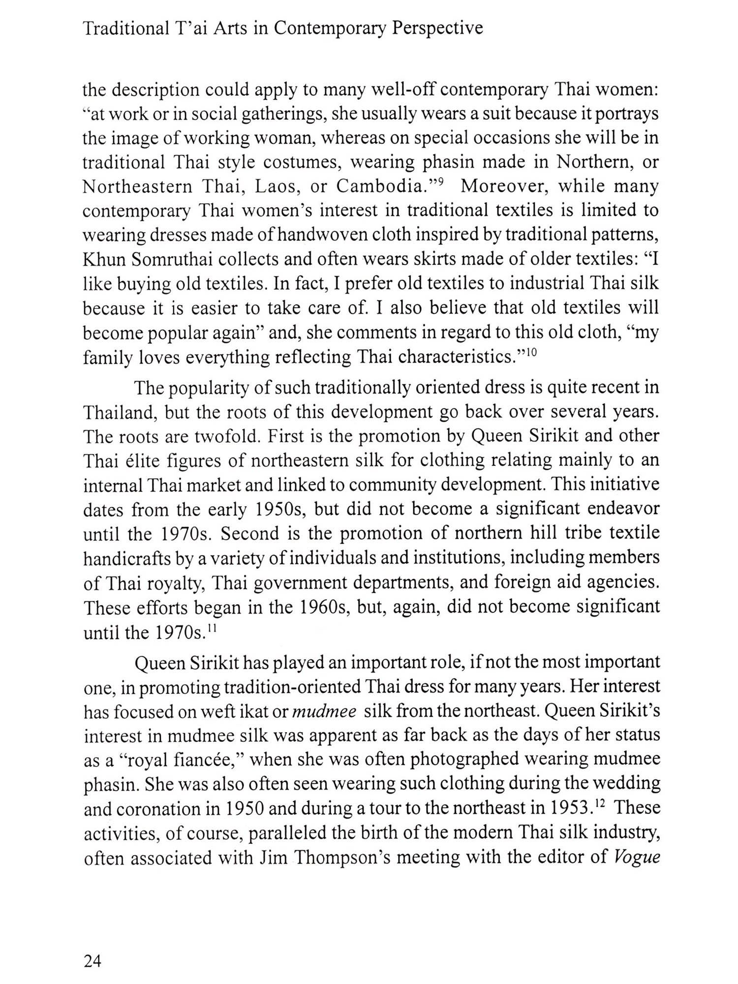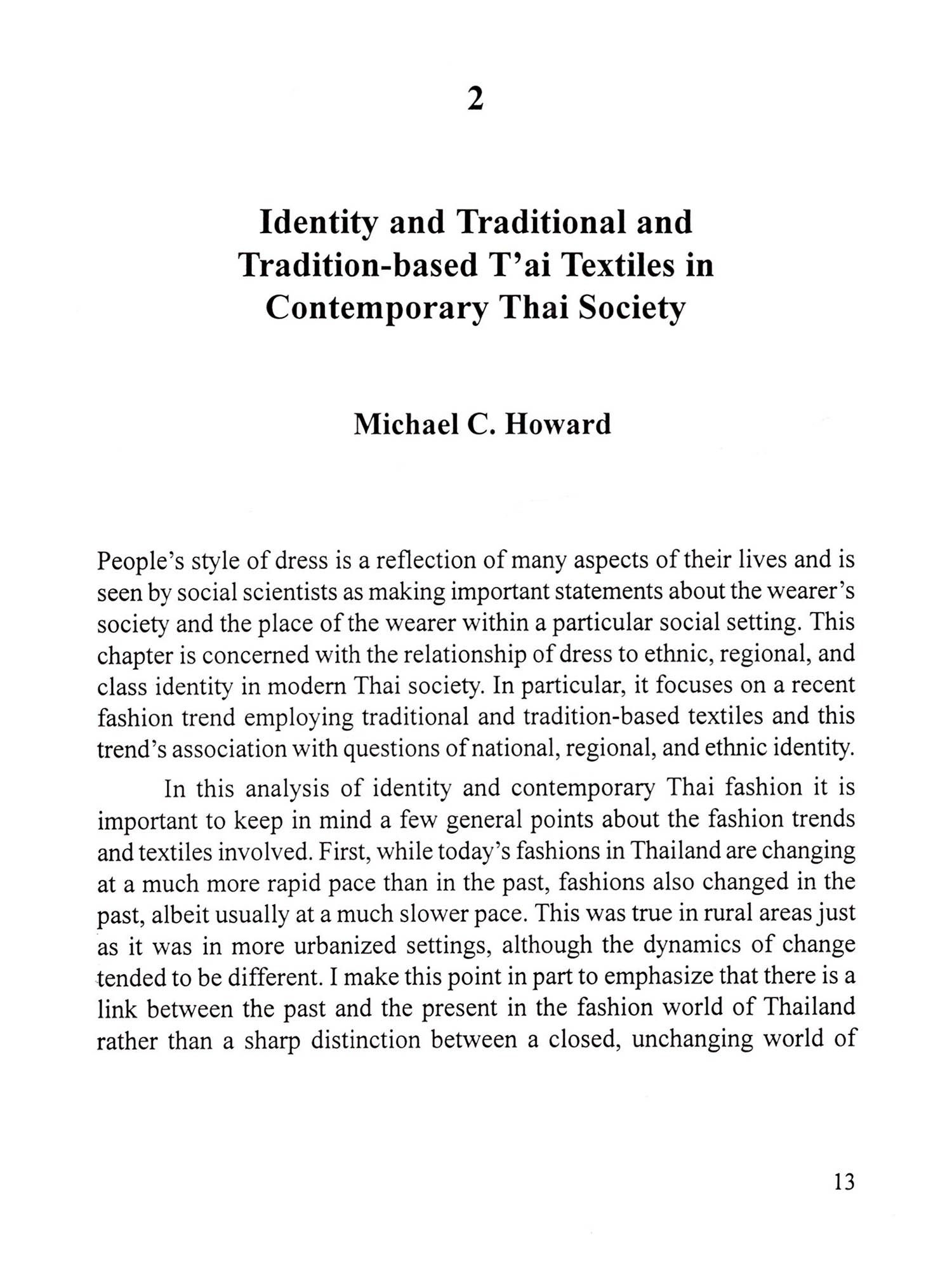 The collection of chapters included in the present volume examine contemporary developments in T'ai arts as well as offering contemporary views of T'ai arts from the past. The focus is on the arts of T'ai peoples in Thailand, but attention is also paid to T'ais in the neighboring countries of Laos, Burma, China, and Vietnam as well. Such a geographical spread reflects a growing interest in the comparative study of T'ai-speaking peoples living in different political and social settings in an effort to better understand common themes in T'ai culture as well as how it has evolved and manifested itself throughout the region. In addition to having a geographically diverse coverage, the chapters examine a variety of forms of artistic expression, including weaving, carving, painting, dancing, and boxing. The inclusion of such an array of topics elicits definitional questions, especially in regard to distinctions that are commonly drawn between arts and crafts. It is not my intent here to engage in a definitional debate about what is and what is not art, but rather simply to employ a broad and widely accepted definition linking artistic expression with the production or performance of something that is judged to have a special aesthetic quality to it either by members of a particular society or cross-culturally. Accordingly, crafts have the potential to be works of art, but not all crafts are viewed as such. In this regard, the intent of the producer is not always a guideline, although it often is since within most cultures standards exist that set the exceptional bowl, basket, or dress apart from the everyday. Perhaps nowhere is the difficulty in establishing a hard and fast rule about what is art and what is not more apparent than in the case of martial arts. It is undoubtedly easier to gain consensus regarding the artistic merit of almost any type of dance than it is to gain artistic respectability for even the most ritualized form of combat. Thus, the presence of a chapter on Thai boxing as a form of martial art may raise a few eyebrows. My own view is that, especially within the context of T'ai culture, such a martial art is a very important form of artistic expression and one that is, in fact, closely associated with dance in T'ai culture. This is not to say that all boxing is art any more than that all dance is art, but that both types of performance have the potential to be elevated to a form of artistic expression and that in T'ai culture some forms of martial combat have achieved this designation. There are several themes that are especially important in contemporary analyses of T'ai artistic expression. One overall theme is the evolution of the practice and perception of traditional T'ai arts in the face of rapid change and unprecedented global influences. The T'ai have always drawn on outside influences in their arts, but have modified such influences in such a way as to maintain a distinctly T'ai character. Moreover, T'ai arts have never been static and have always shown an interesting blend of innovation and conservatism. However, the extent of external influences and pressures to change today are unprecedented and lead to questions about the ability of the T'ai people in the modern globalized world to continue to assimilate things from outside and to incorporate them into the creation of distinctly T'ai forms of artistic expression. Many past art forms and traditional motifs are local versions that differ only slightly from those found elsewhere.