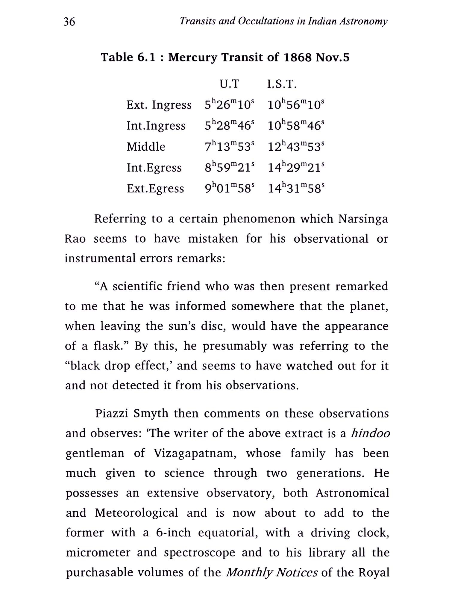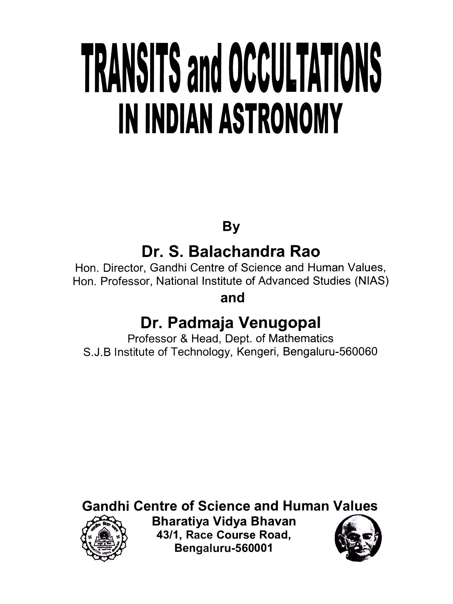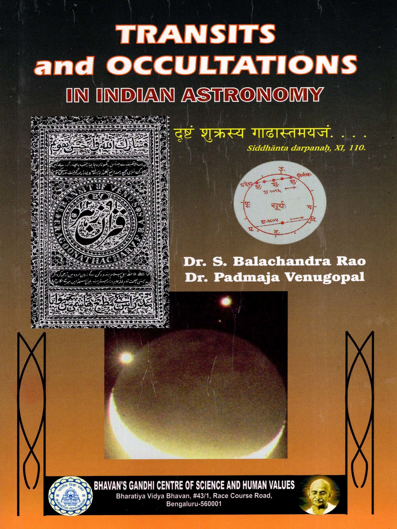During this International Year of Astronomy (IYA-2009), authors Dr. S.Balachandra Rao and Dr. Padmaja Venugopal have brought out their second title, "TRANSITS OCCULTATIONS in Indian Astronomy". In fact, this book is a sequel to their recently published title, "ECLIPSES in Indian Astronomy." This book is designed to provide an insight into the contributions of classical Indian astronomers through the ages. The authors have evolved and presented improved siddhantic procedures (ISP), for computation of Transits and Occulations, which yield results that compare well with those of modern procedures. The authors humbly acknowledge that their updated procedures for these phenomena are inspired by the valuable papers of the great savant of Indian astronomy, the late Prof. T.S.Kuppanna Sastry who was a veteran Sanskritist and a deep scholar in mathematical astronomy. In fact, the book is dedicated to the memory of Prof. Sastry. Besides procedures for computations, described in a simple style intelligible to the present day students, the authors have discussed interesting topics like, "From the yellowed pages", "Venus transits of 1874 and 1872", "Narasinga Rao's observations of 1874 transit", "Samanta Chandrasekhara Simha on 1874 transit", "Legentil's expeditions to India for 1761 and 1769 transits" besides other chapters on classical and improved siddhantic procedures for transits and occulations. Further, highly informative Appendices provide lots of useful data on transits and occultations. These are bound to motivate students to pursue studies in astronomy with greater interest. I congratulate the authors for their thoughtful contribution of these twin titles to popularizing the great Indian astronomical heritage. I am glad that the recently published book "ECLIPSES in Indian Astronomy" has already received high appreciation from eminent scientists and scholars like Dr. Jayant Narlikar.