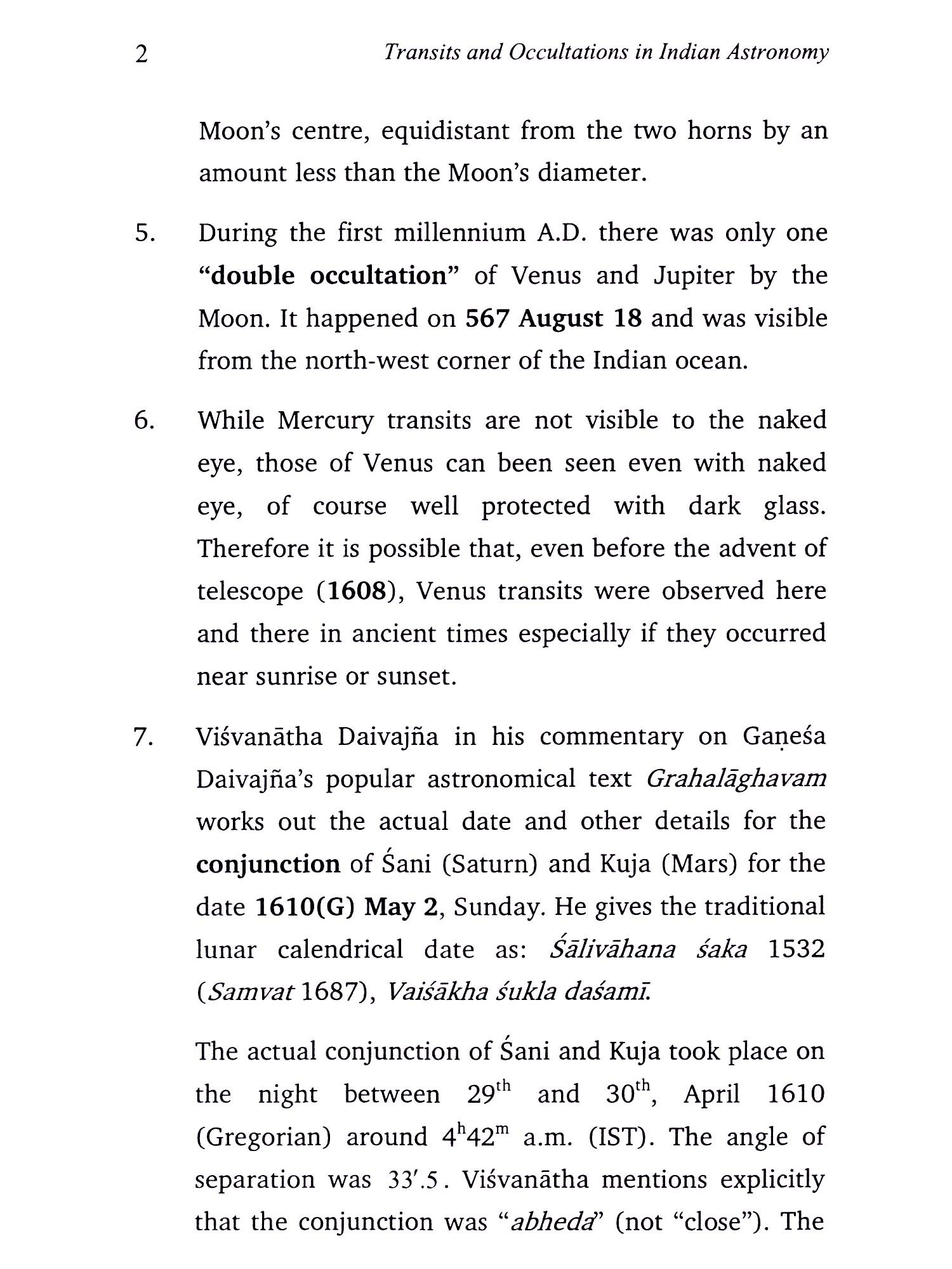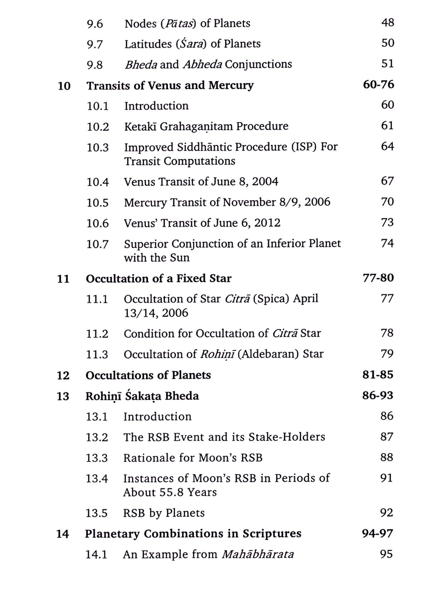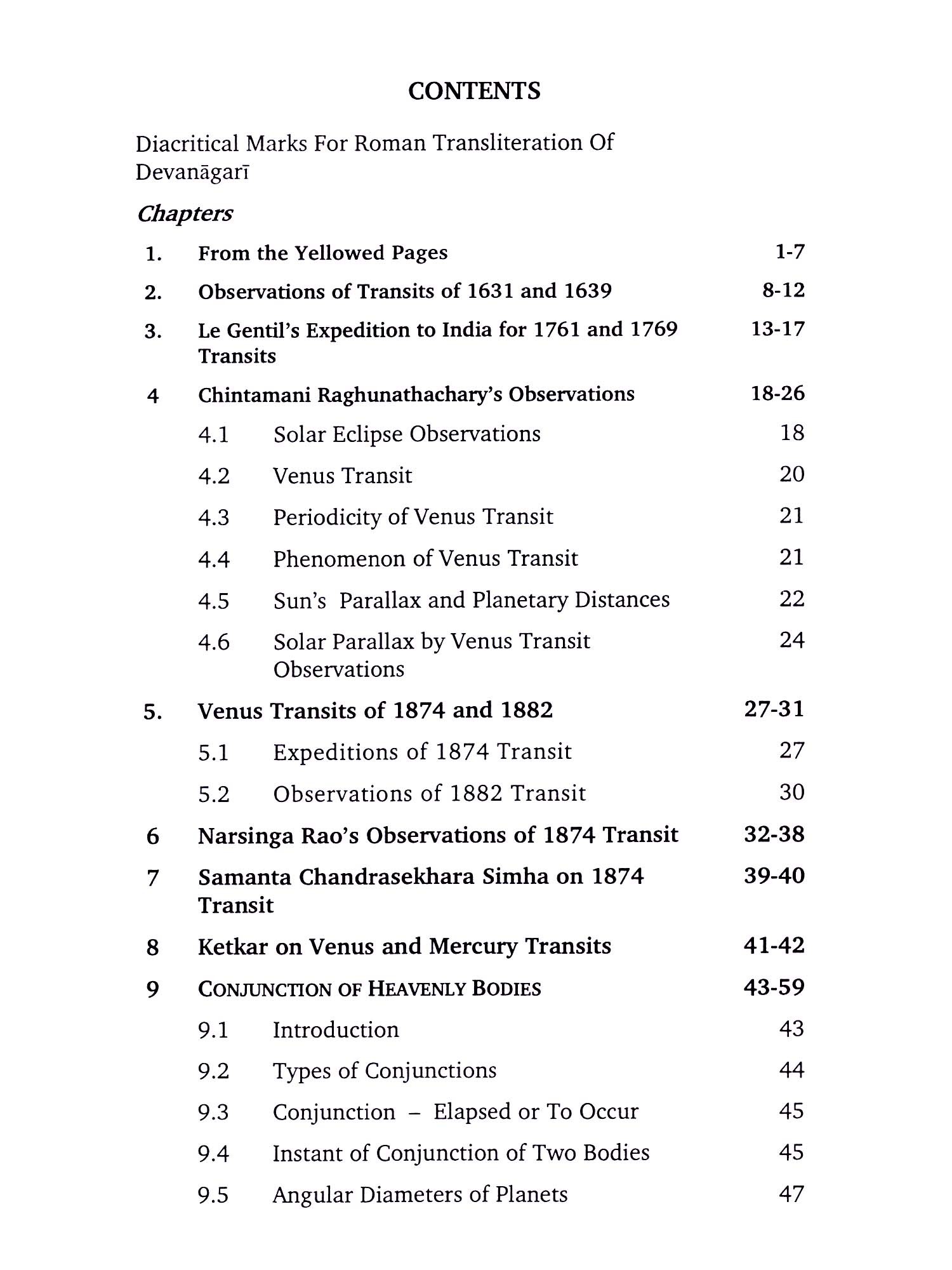 It gives us great pleasure in offering this new title, "TRANSITS AND OCCULATIONS in Indian Astronomy" to the student community as well as to the discerning readers interested in astronomy and the Indian contribution to the field. In fact this title is a sequel to our earlier book, "ECLIPSES in Indian Astronomy", This book is presented as our humble contribution in the context of 2009 being declared as the International Year of Astronomy. Among the various topics related to transits and occultations discussed in this book, the improved siddhantic procedures (ISP) provide results comparable to those based on modern astronomical procedures. For evolving these updated procedures our unique source of inspiration has been the dedicated contribution of the late Prof. T.S.Kuppana Sastry (1900-1982). We have great pleasure in dedicating our work, as a token of our deep gratitude, to the sacred memory of Prof. T.S.Kuppana Sastry. For the traditionally trained crudition of Prof.Sastry, his highly rational, objective and scientific approach is truly refreshing. The chapters on the transit expeditions of the French astronomer Le Gentil and the observations of our own Indian astronomers Sri Cintamani Ragoonatha Chary, Ankitam Narsinga Rao and Samanta Chandrasekhara Simha would surely inspire our modern students. In the International Year of Astronomy-2009, we sincerely hope that our discerning readers especially students will get inspired to pursue astronomy as also studies in the rich scientific heritage of our great nation vigorously with greater inquisitiveness and rightful national pride. We are highly grateful to Professor B.V.Sreekantan for blessing us with his encouraging Foreword. We are indebted to the members of the Executive Committee of the Gandhi Centre for their continuous support. We record our deep appreciation to Sri V.Ganesha and Sri S.Prasannakumar of the Gandhi Centre as also to the DTP specialist Sri C.Gangadhara and the printers for their sincere cooperation in bringing-out this book in record time.