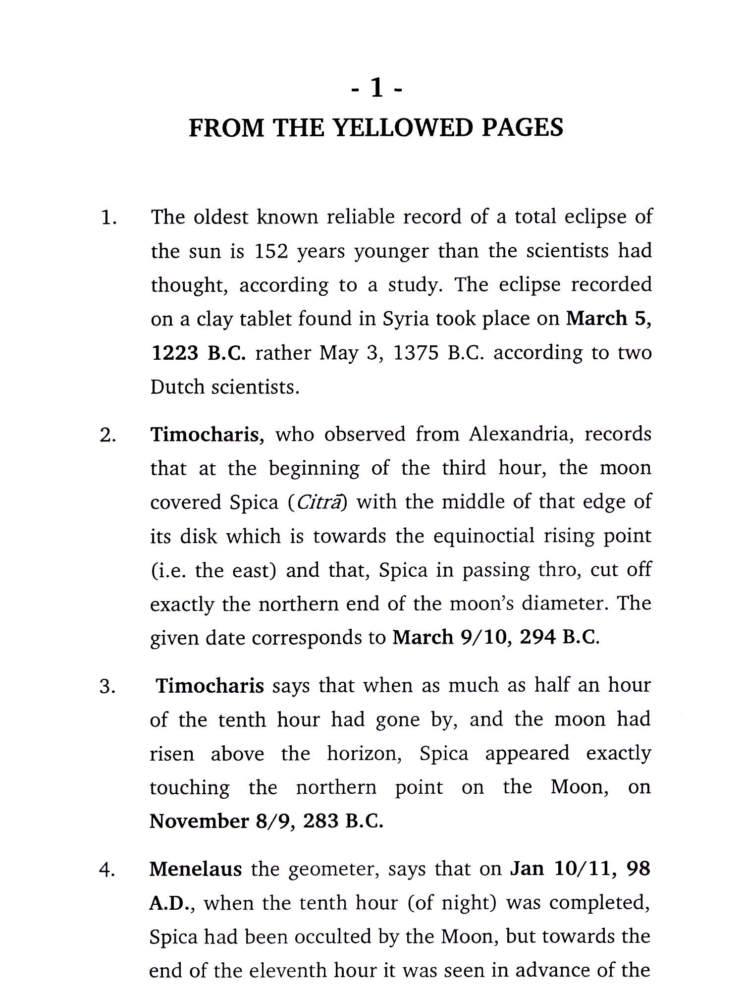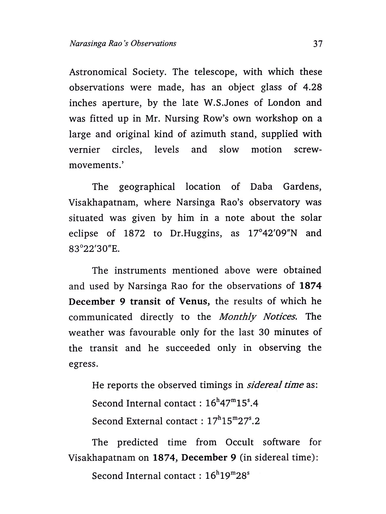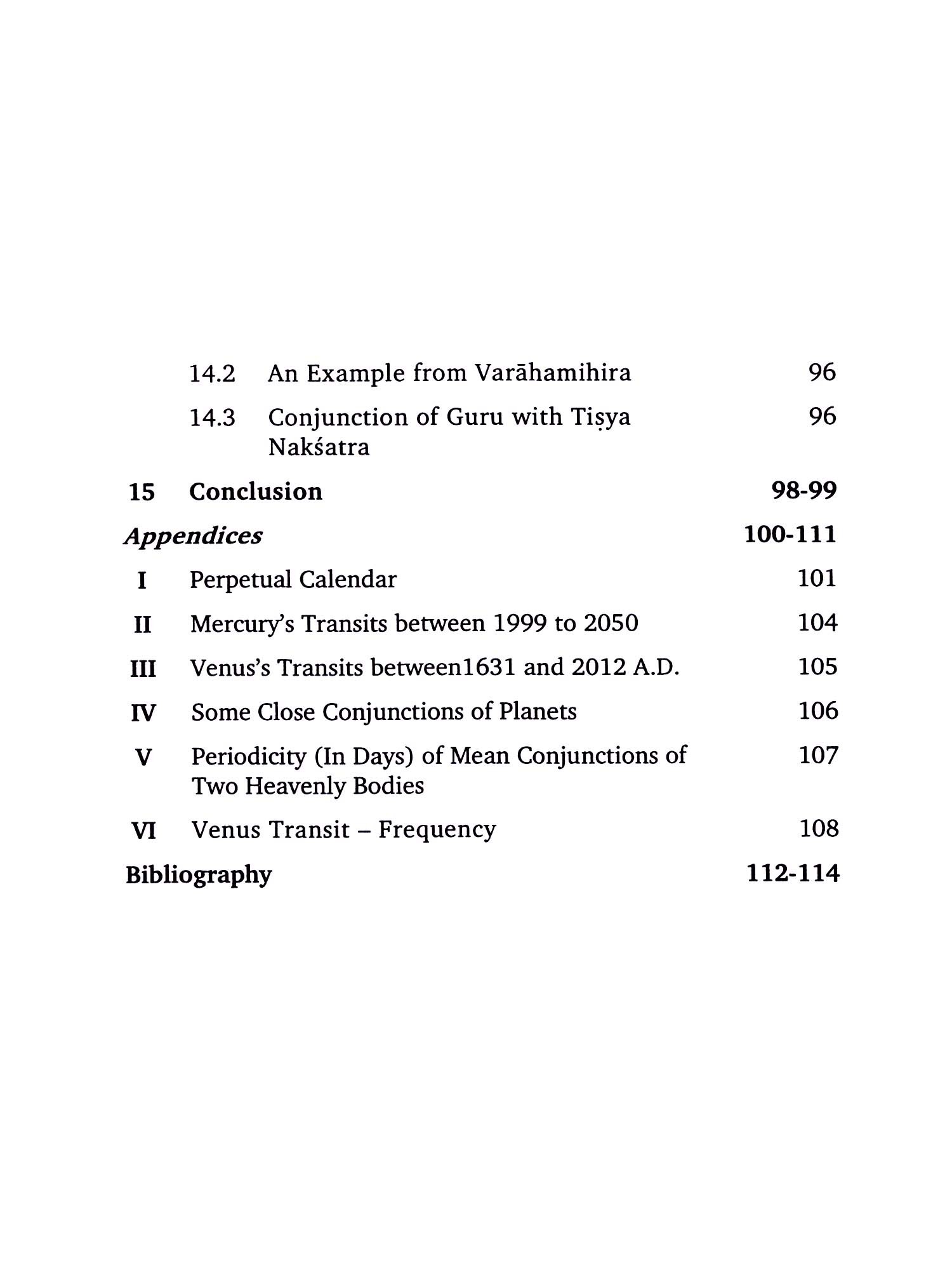 It gives us great pleasure in offering this new title, "TRANSITS AND OCCULATIONS in Indian Astronomy" to the student community as well as to the discerning readers interested in astronomy and the Indian contribution to the field. In fact this title is a sequel to our earlier book, "ECLIPSES in Indian Astronomy", This book is presented as our humble contribution in the context of 2009 being declared as the International Year of Astronomy. Among the various topics related to transits and occultations discussed in this book, the improved siddhantic procedures (ISP) provide results comparable to those based on modern astronomical procedures. For evolving these updated procedures our unique source of inspiration has been the dedicated contribution of the late Prof. T.S.Kuppana Sastry (1900-1982). We have great pleasure in dedicating our work, as a token of our deep gratitude, to the sacred memory of Prof. T.S.Kuppana Sastry. For the traditionally trained crudition of Prof.Sastry, his highly rational, objective and scientific approach is truly refreshing. The chapters on the transit expeditions of the French astronomer Le Gentil and the observations of our own Indian astronomers Sri Cintamani Ragoonatha Chary, Ankitam Narsinga Rao and Samanta Chandrasekhara Simha would surely inspire our modern students. In the International Year of Astronomy-2009, we sincerely hope that our discerning readers especially students will get inspired to pursue astronomy as also studies in the rich scientific heritage of our great nation vigorously with greater inquisitiveness and rightful national pride. We are highly grateful to Professor B.V.Sreekantan for blessing us with his encouraging Foreword. We are indebted to the members of the Executive Committee of the Gandhi Centre for their continuous support. We record our deep appreciation to Sri V.Ganesha and Sri S.Prasannakumar of the Gandhi Centre as also to the DTP specialist Sri C.Gangadhara and the printers for their sincere cooperation in bringing-out this book in record time.