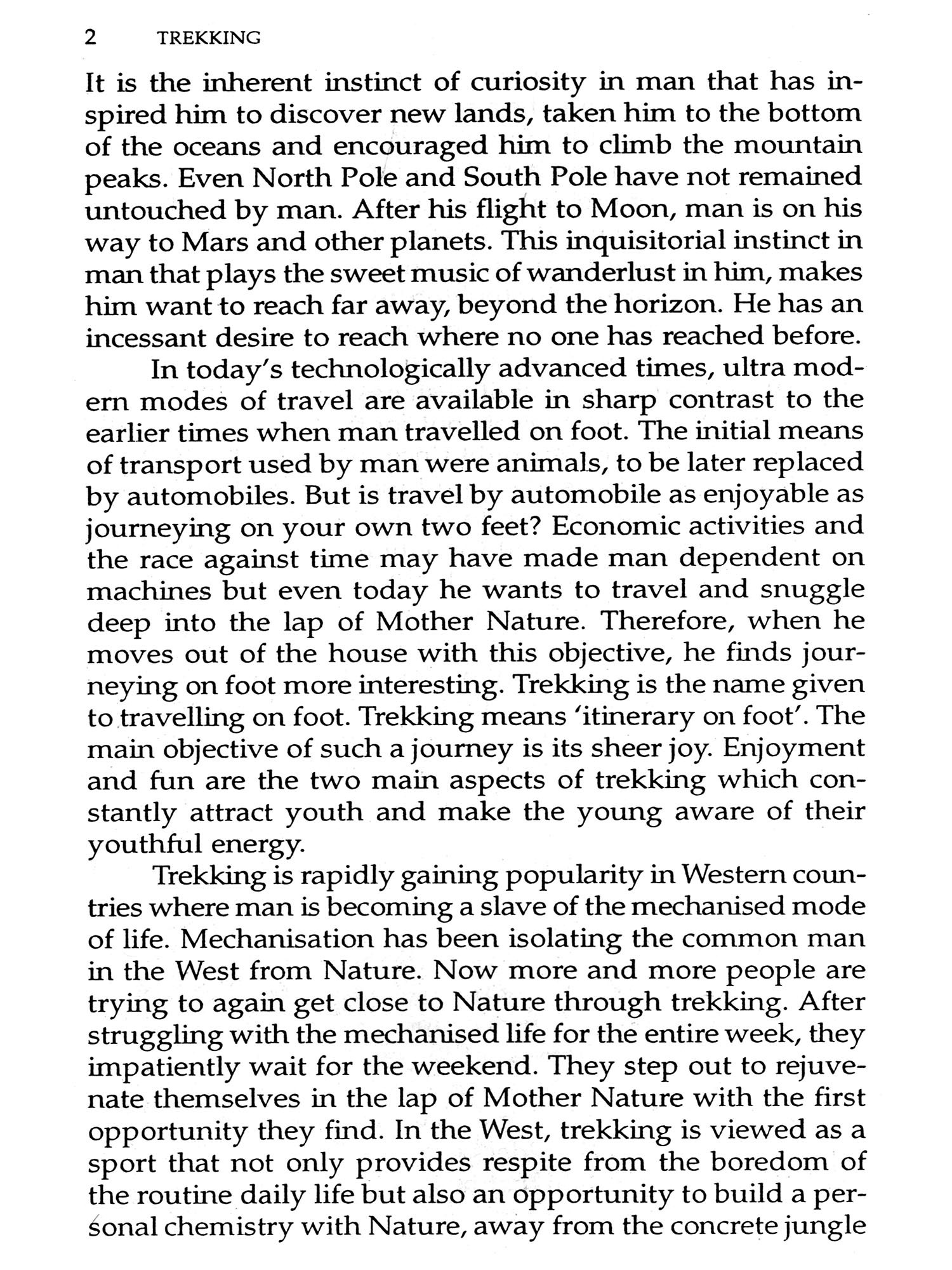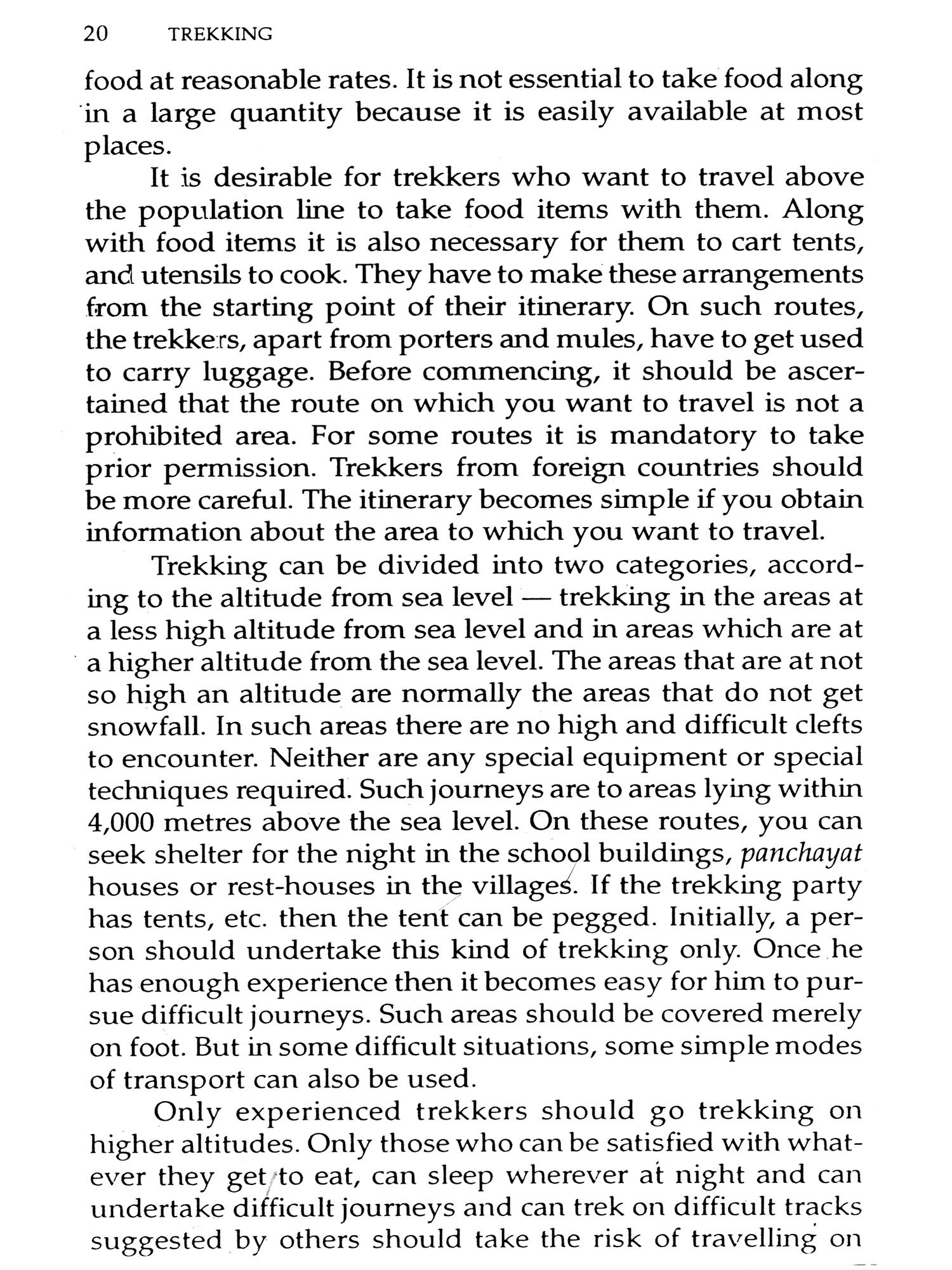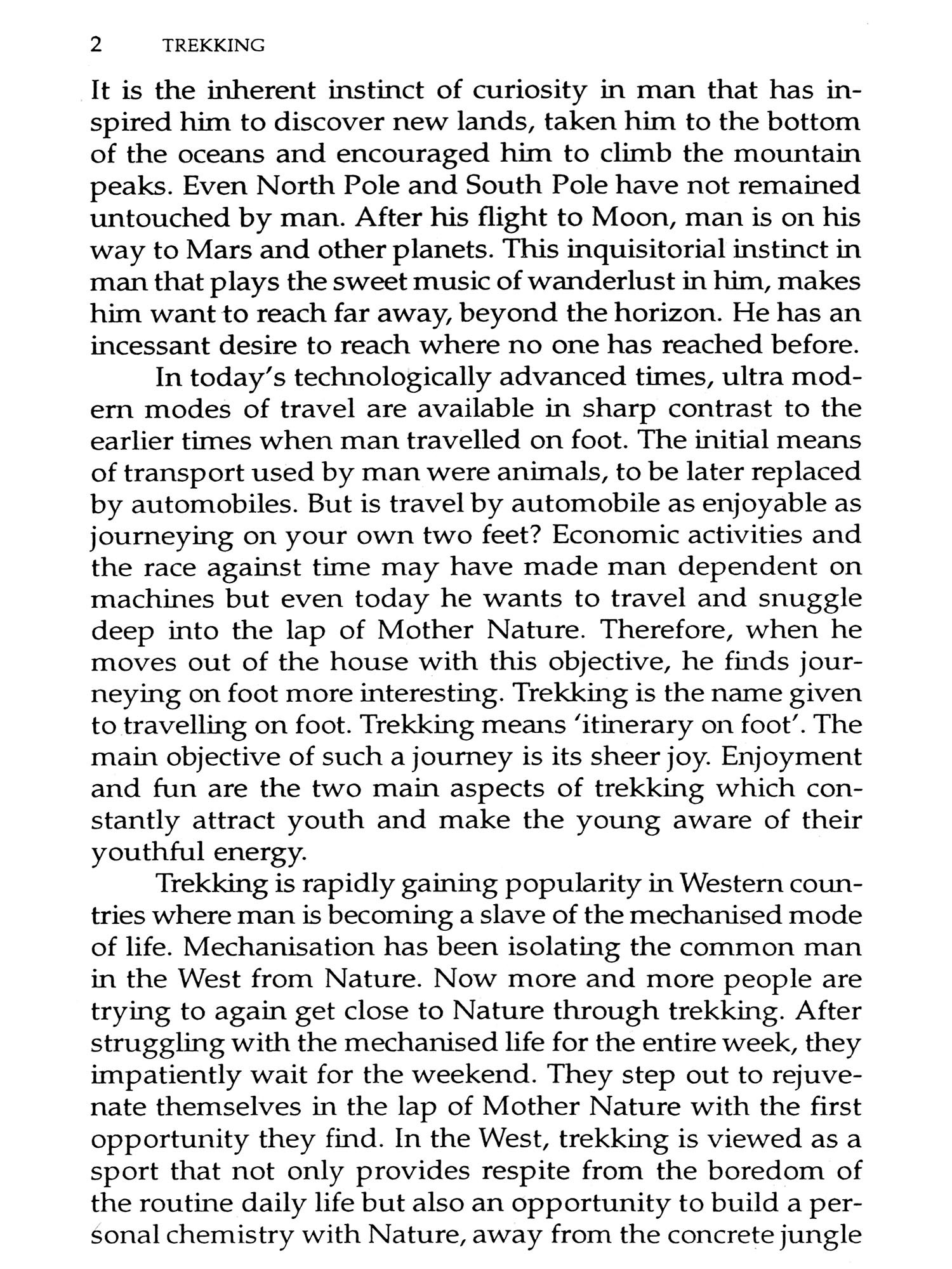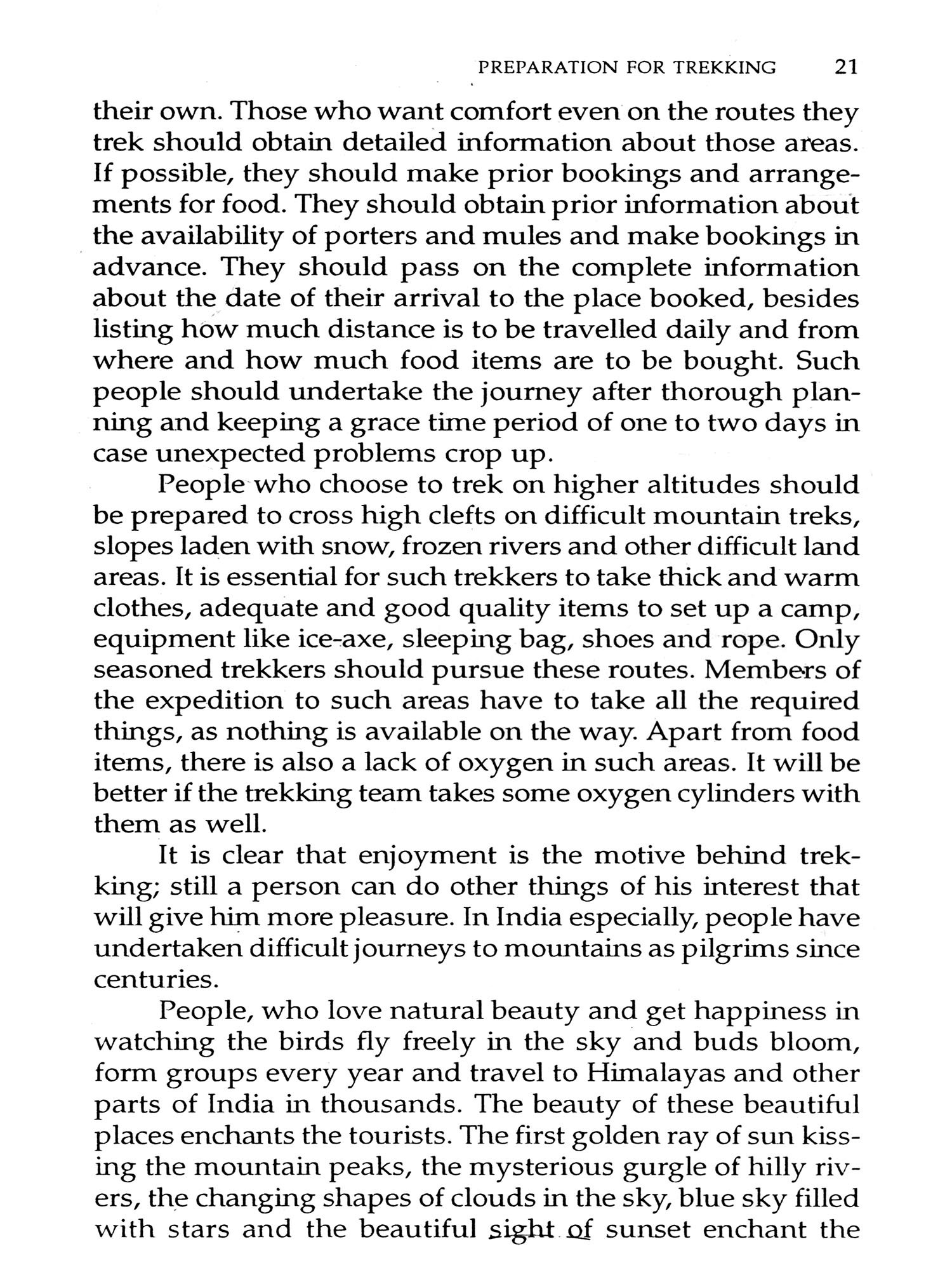 In spite of being a country with the highest mountain ranges in India, the interest of our youth has not been very encouraging. Till 1960s, we were unaware of sports like trekking and mountaineering. The people who knew about them considered trekking as an expensive and uselessly dangerous game. Later on when the students of schools and colleges started going for trekking, to some extent then we learnt that, like other games, trekking too is a complete game and our ancestors were not ignorant of its attributes, though the modern form of trekking was not known to them. Soon after the Indian youth started taking interest in this game, trekking clubs started forming and this was also encouraged by the government and society. Even when people started going for trekking in large numbers, no one ever noticed the paucity of literature on this sport. For years, no Indian author noticed it. Foreign writers did not have complete knowledge about the Indian traditions, climate and geographical conditions. As a result, the literature authored by them did not prove to be very useful. With the increase in the numbers going for trekking, the rate of accidents also increased.