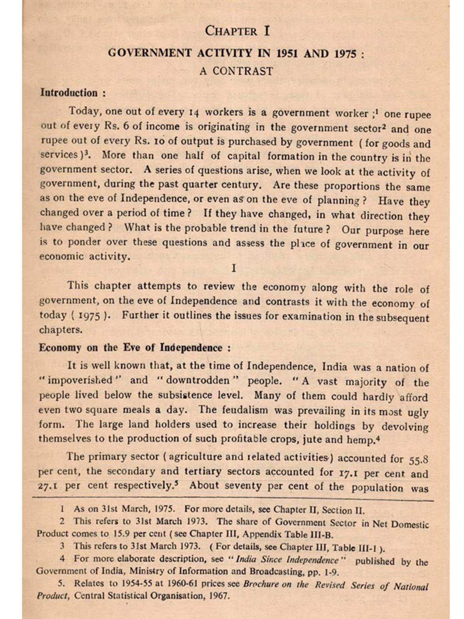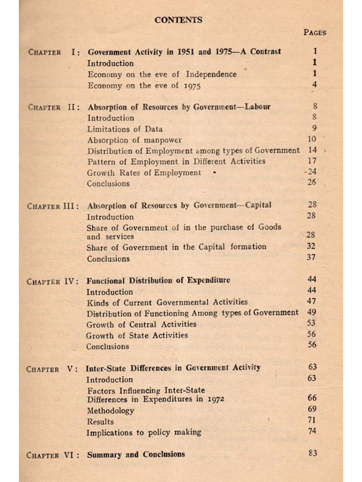 The study starts with the comparison of government activity in the economy of 1951 with that of economy in 1975. Then it delineates the issues discussed in the subsequent chapters. The second and third chapter discuss the absorption of resources, labour and capital respectively. The fourth presents the functional distribution of input and takes the stock of current governmental activities. The fifth chapter examines the factors affecting the intersiate differences in government activity. The last chapter presents the summary of findings.