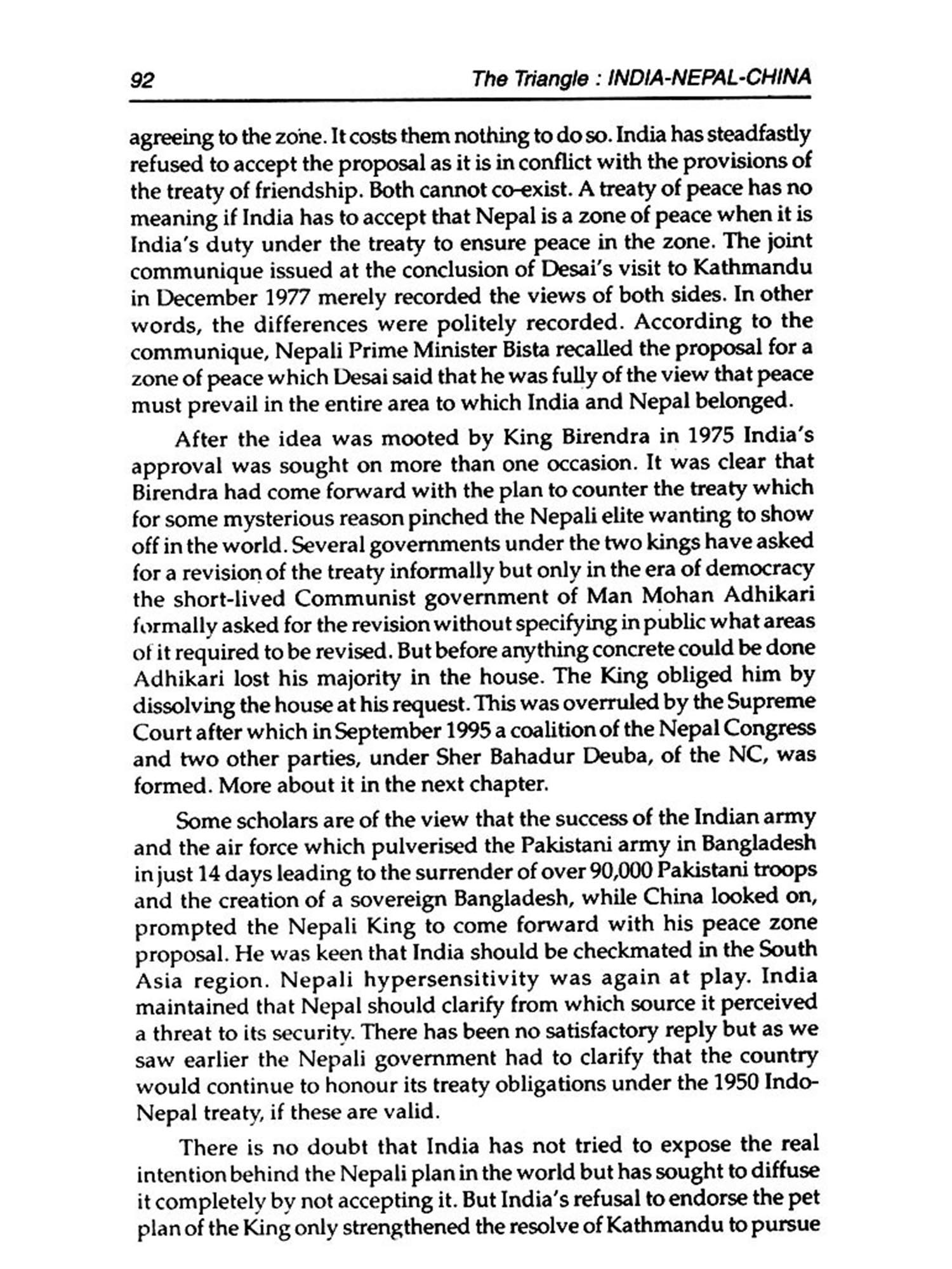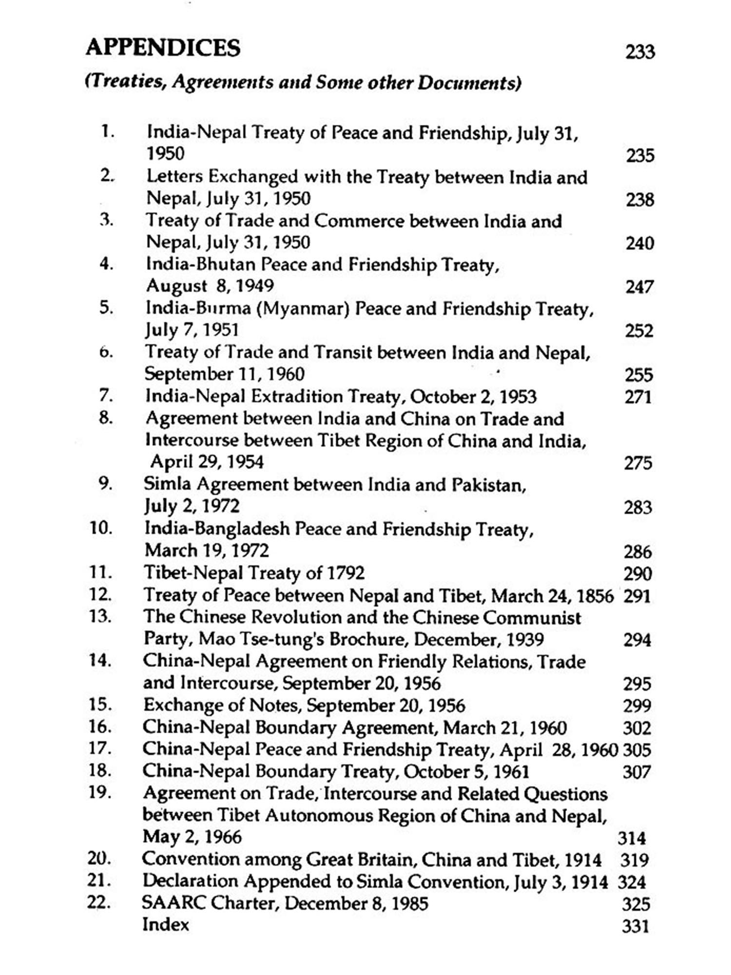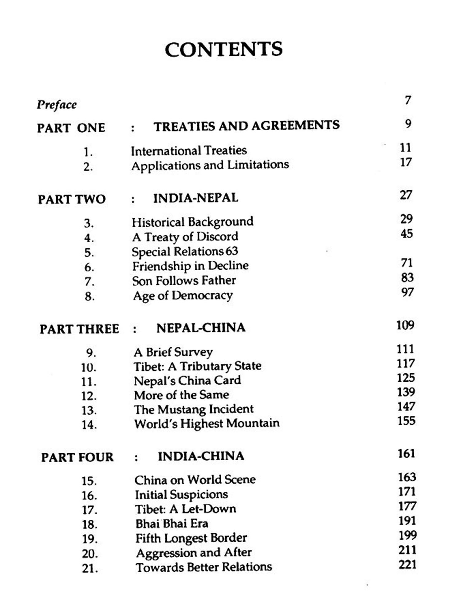 Nepal is the focus of the book, although the much larger format of India-China relations is also dealt with, both as an independent subject and in its linkage with the triangular theme. The relevant treaties and agreements are reproduced in the appendices along with the SAARC (South Asian Association for Regional Cooperation) Charter, although the book does not deal with SAARC at all.