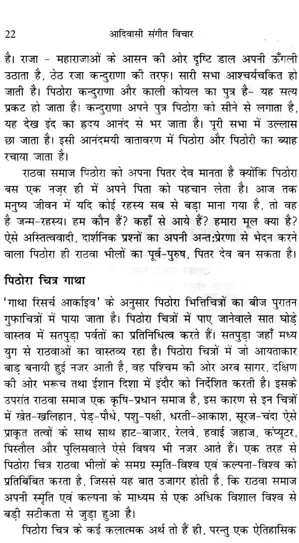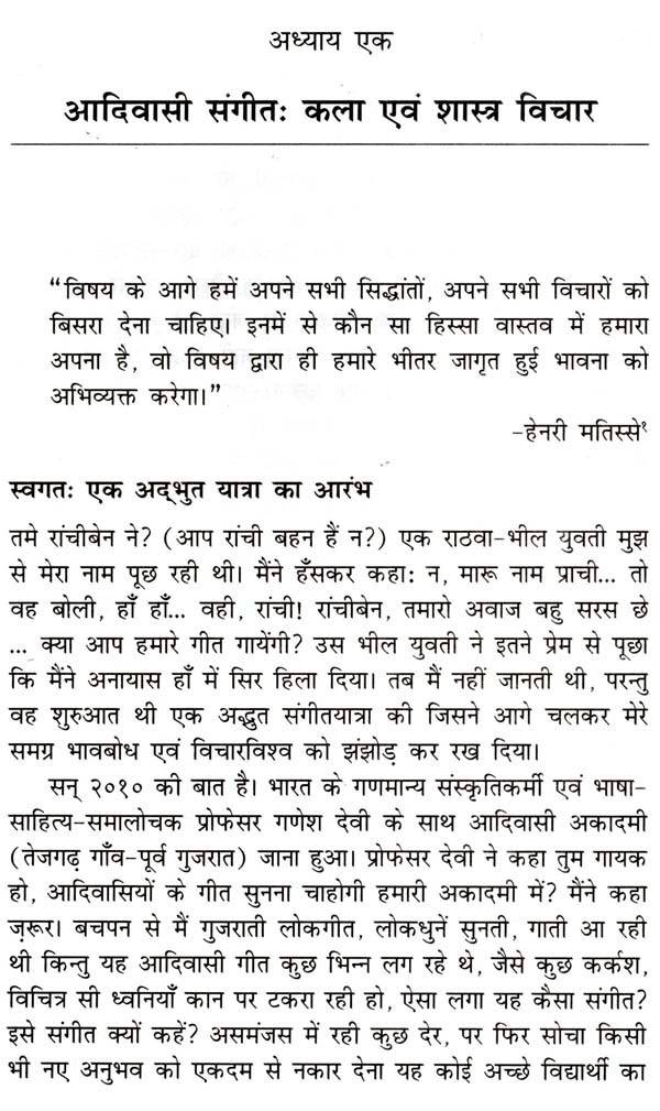 आगे के पृष्ठों में पाठक सबसे पहले एक बेहद गंभीर प्रयास से परिचित होंगे जिसमें एक संगीतज्ञ ने आदिवासियों के संगीत के विभिन्न अनछुए पहलुओं को समझने में मदद की है। प्राची के शोध में आदिवासी संगीत को लेकर चर्चित रहे लेकिन अनसुलझे हुए कई प्रश्न सामने आते हैं, आदिवासी संगीत का आरम्भ और उसकी विकास यात्रा, सन्दर्भ और लय, इतिहास से सरोकार, और परिवर्तन और निरंतरता के कई मुद्दे यहाँ मौजूद हैं। इन सबके अलावा यहाँ कई और मूलभूत संकल्पनाएँ जैसे ध्वनि, संगीत, कला और आदिवासी, और इन मुद्दों के भीतर बनने बिगड़ने वाले विवादों को नज़दीक से परखा गया है। साथ ही एक चिंतनशील नृवंशविज्ञानी की तरह प्राची अपनी स्वयं की समस्याओं से संवाद जारी रखती हैं। वह चाहे लेखक के तौर पर उनकी अपनी आवाज या विषय में उनके हस्तक्षेप का प्रश्न हो या स्व और भिन्न, अथवा प्रतिनिधित्व और अनुवाद से संबंधित चिंताओं का प्रस्तुतीकरण हो, लेखक ने इस प्रक्रिया में निर्माण होने वाली विविधता और इसकी अपरिवर्तनीयता दोनों का प्रदर्शन किया है।