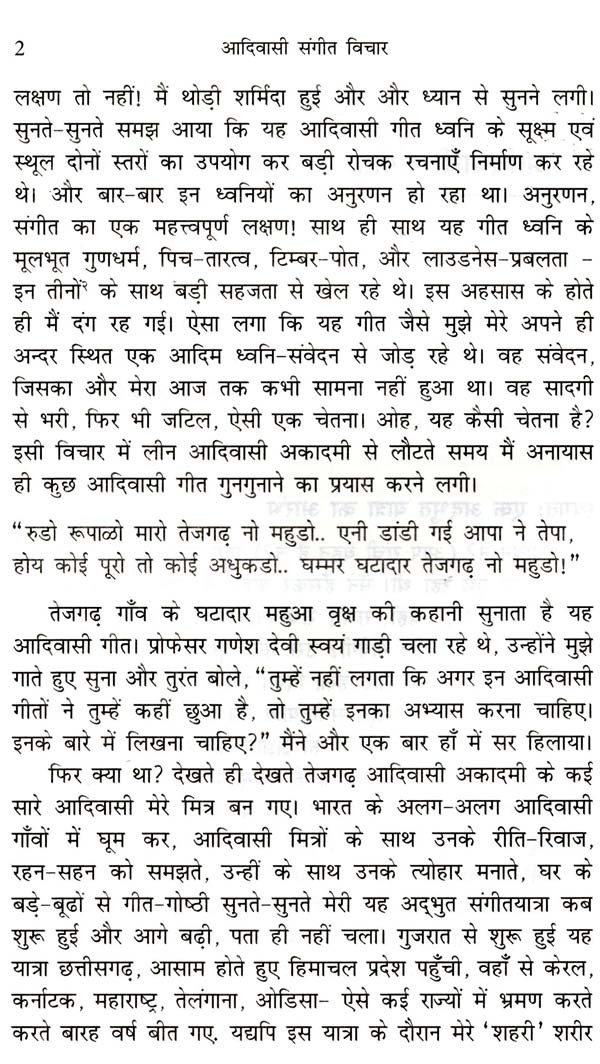 यह आखिरी प्रश्न था इंटरव्यू का, और इसे पूछते समय भारतीय उच्च अध्ययन संस्थान, शिमला के तत्कालीन निदेशक प्रोफेसर चेतन सिंह के चेहरे पर एक मार्मिक मुस्कान थी। मैंने कहा: "सर, आज तक आदिवासी संगीत के सारे सिद्धांत मौखिक परम्परा में समाहित रहे हैं। आदिवासी स्वयं भी इन्हें पीढ़ी दर पीढ़ी मौखिक रूप में ही बताते रहे हैं, पर अब समय है कि इस मौखिकता में जो शास्त्र निहित है, उसे भी हम देखें एवं उसे लिखने का प्रयास करें! मेरे आदिवासी मित्रों की भी यही मंशा है। मैं जानती हूँ कि मेरे पास पीएचडी जैसी कोई डिग्री अथवा शिक्षाविदों जैसा कोई दीर्घ अनुभव नहीं है किन्तु पिछले कई वर्षों से लगातार आदिवासी संगीत के दस्तावेजीकरण हेतु मैं अपने आदिवासी मित्रों के साथ भारत के दुर्गम इलाकों में घूम रही हूँ। इस संगीत की बुनावट (टेक्श्चर) और बनावट (स्ट्रक्चर) कैसे हैं, इसका आशय क्या है और इसका आकार कैसा है? इन सभी का एकदम समीप से अनुभव कर रही हूँ। केवल यही नहीं, इस संगीत यात्रा के दौरान मैंने बार-बार यह भी महसूस किया है कि न ही मेरे आदिवासी मित्र उतने 'आदिवासी' हैं, न ही मैं उतनी 'गैर-आदिवासी'; मनुष्यता एवं संगीत का धागा हमें अद्भुत तरीके से जोड़े हुए है। मैं चाहती हूँ कभी न कभी, कहीं न कहीं इस अनुभव को, इस अहसास को शब्दों में ढालूँ और प्रस्तुत करूँ 'आदिवासी संगीत-विचार' के रूप में।