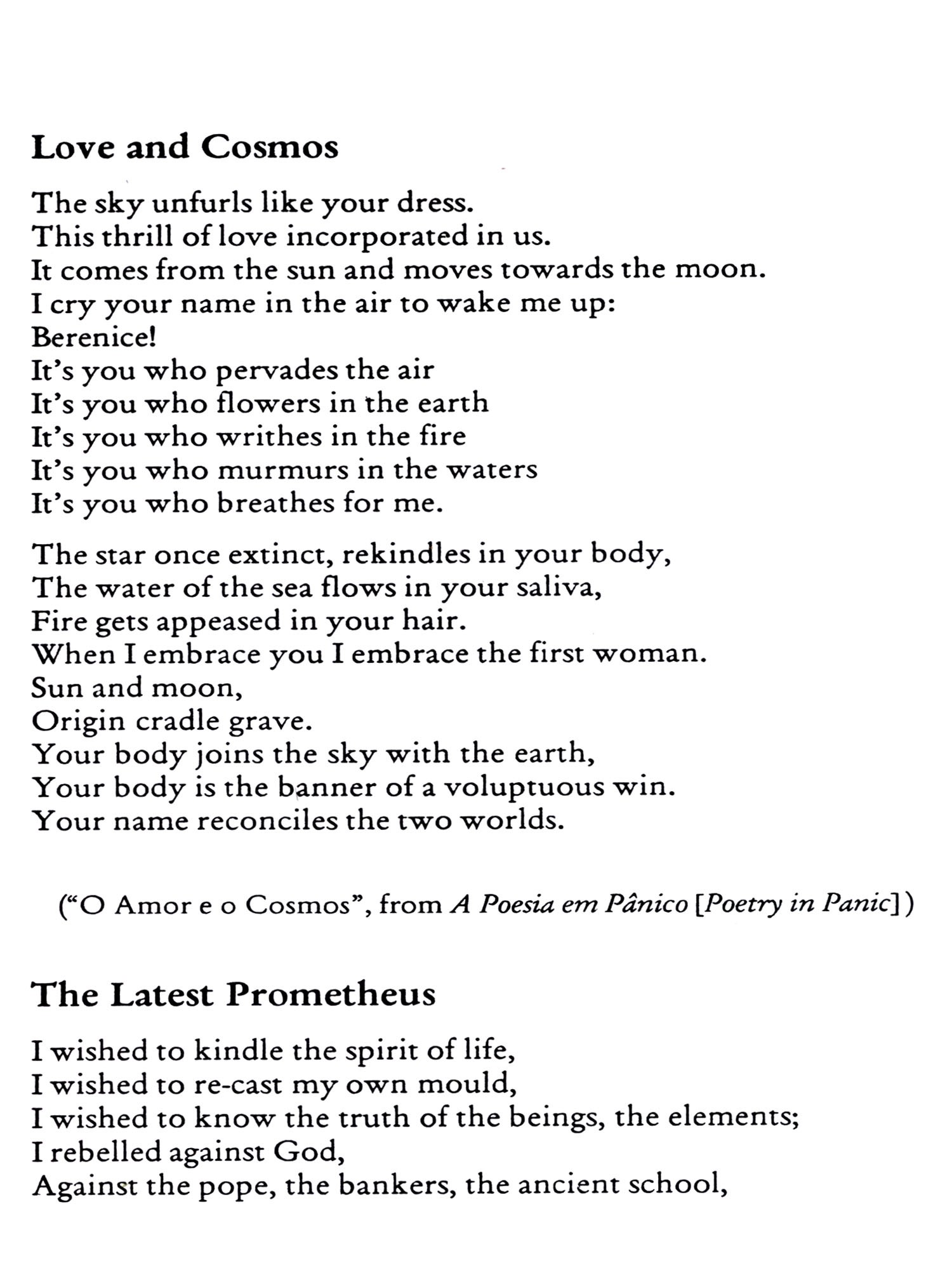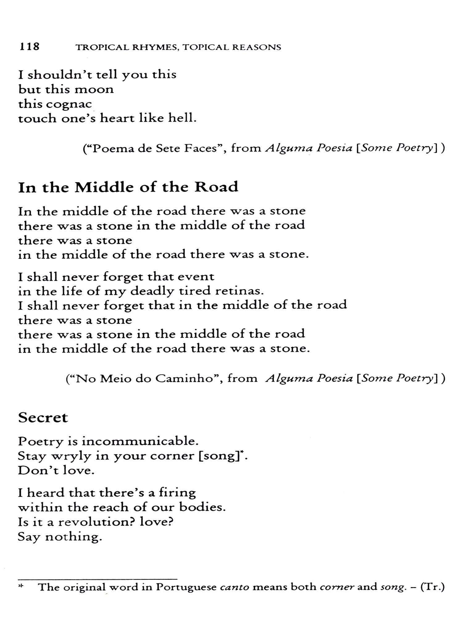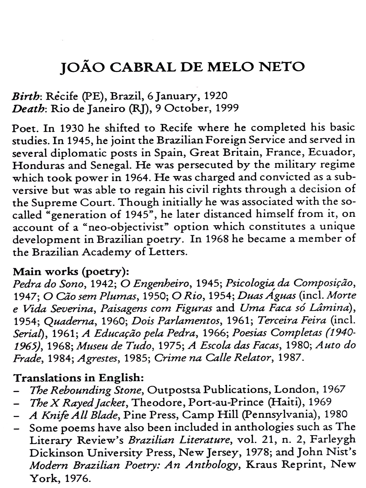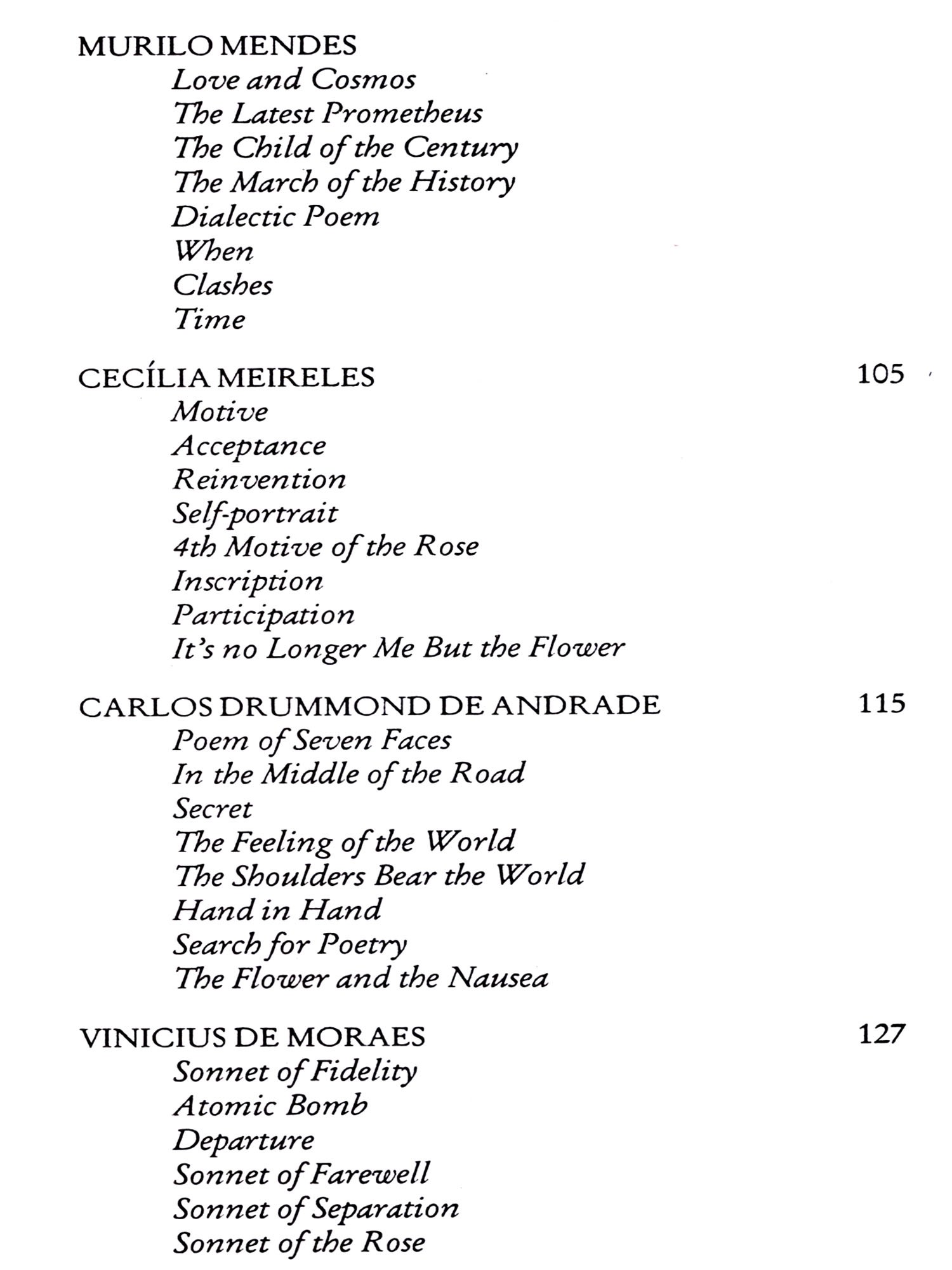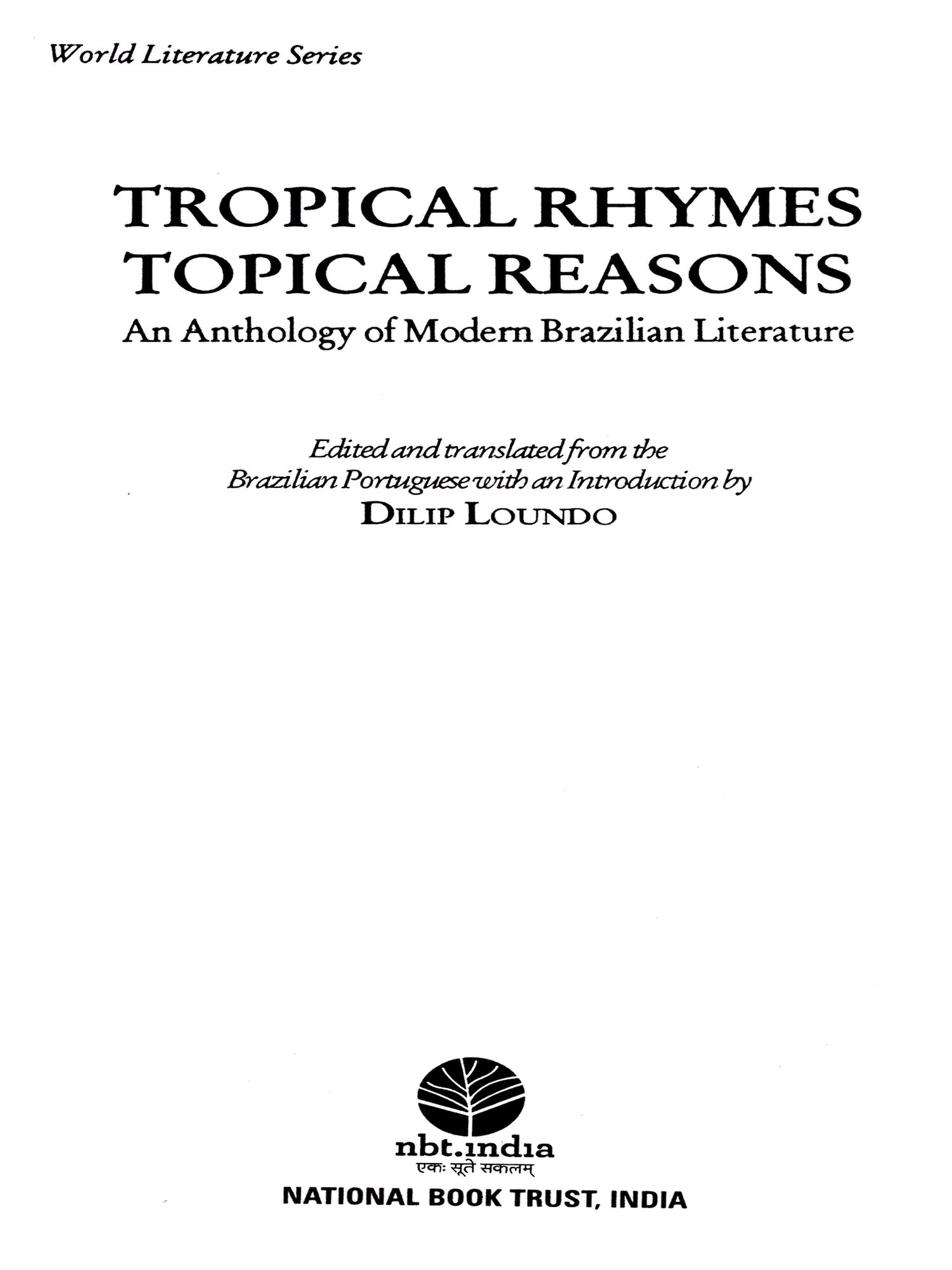 Most of the English versions are fresh translations from the originals in Brazilian Portuguese. This is true for all poetry section and also for most of the short story section. However, the majority of the excerpts of novels are reproductions of existing translations. Here I've taken the liberty to re-instate a few of the original Brazilian terms which seemed to demand explanatory notes (mostly included in the Glossary). I've also used the British orthography throughout. As expected, some poetic rhythms and metres had to be ignored, or rendered by assonance and half-rhymes. Again, some dialectal structures of regional narratives resisted a fluent translation.