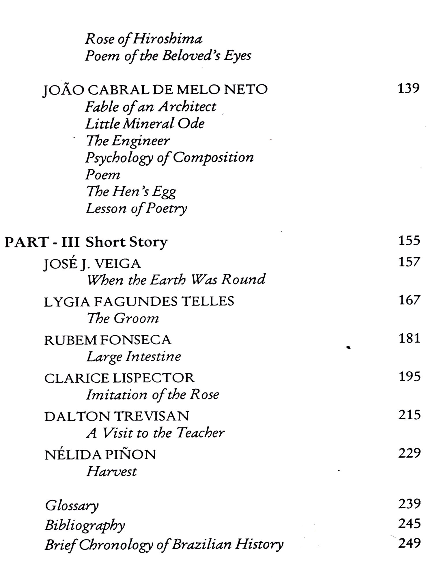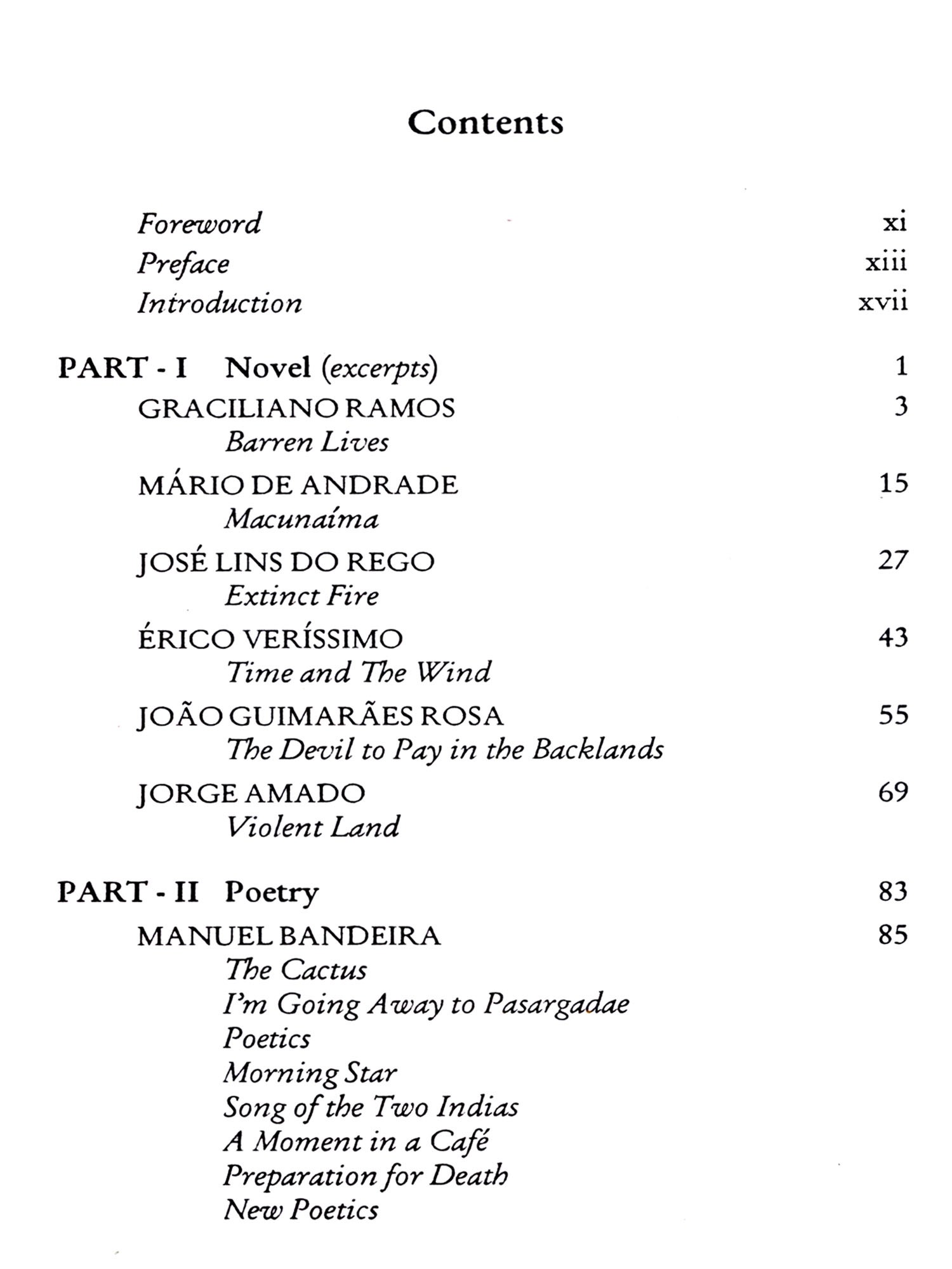 The anthology includes eighteen authors and is divided into three parts, viz., (i) novel, (ii) poetry and (iii) short story, each represented by six authors placed in a chronological order by the date of birth. Among them, five are living and active. They mostly belong to a younger generation which was responsible for the boom of short story. To familiarise the reader with the overall production of the eighteen authors, a biographical note is included in the beginning of each text. Besides, I've added an Introduction to Brazilian Literature, a list of Suggested Bibliography for further reading on Brazilian culture and literature, a Glossary of the Brazilian Terms used in the texts, and a Brief Chronology of Brazilian history.