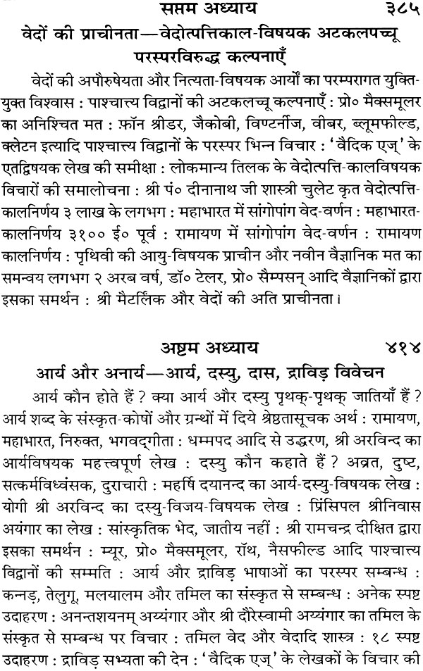 In respect of contents, different views have been held about the meaning of the Vedas by different schools of interpreters. One of them is Sayanacharya who, inspite of his monumental work, is found to have read the mythologies of his own times (14th century A.D.) into the Vedas. Western orientalists struck out new lines, but, being (some of them with missionary zeal) attached to christianity (exceptions are rare), they have shown a distinct tendency to consider everything that is at variance with their own religion (with its belief in a God in heaven exercising His will as He likes) to be crude and primitive. Sometimes they were disabled by a repressed mentality to realise the Vedic joy of living and the Vedic ennoblement of human nature through affiliation to a higher spiritual life. To their old-word sin- consciousness and modren 'obscenity'-consciouness, certain robust poetic visions of life, dealing particularly with married love, have appeared shocking. There have been Indian scholars, too, who unacquainted with the spiritual background of the Vedic religion and its noble history through the ages have indulged in cheap denunciation of the Vedas, often surpassing their 'authorities', the western orientalists, in the virulence of their attack. But their surrender to their authorities is sometimes more dogmatic than the surrender of medieval European scholars to theological authorities. Pandit Dharmadeva has setected a book containing such an approach to the Vedas, for special criticism. It is, 'Vedic Age' published in Bombay, which is found on the list of text-books of many Indian Universities for students of ancient Indian history. The writer on Atharva Veda in that book states: