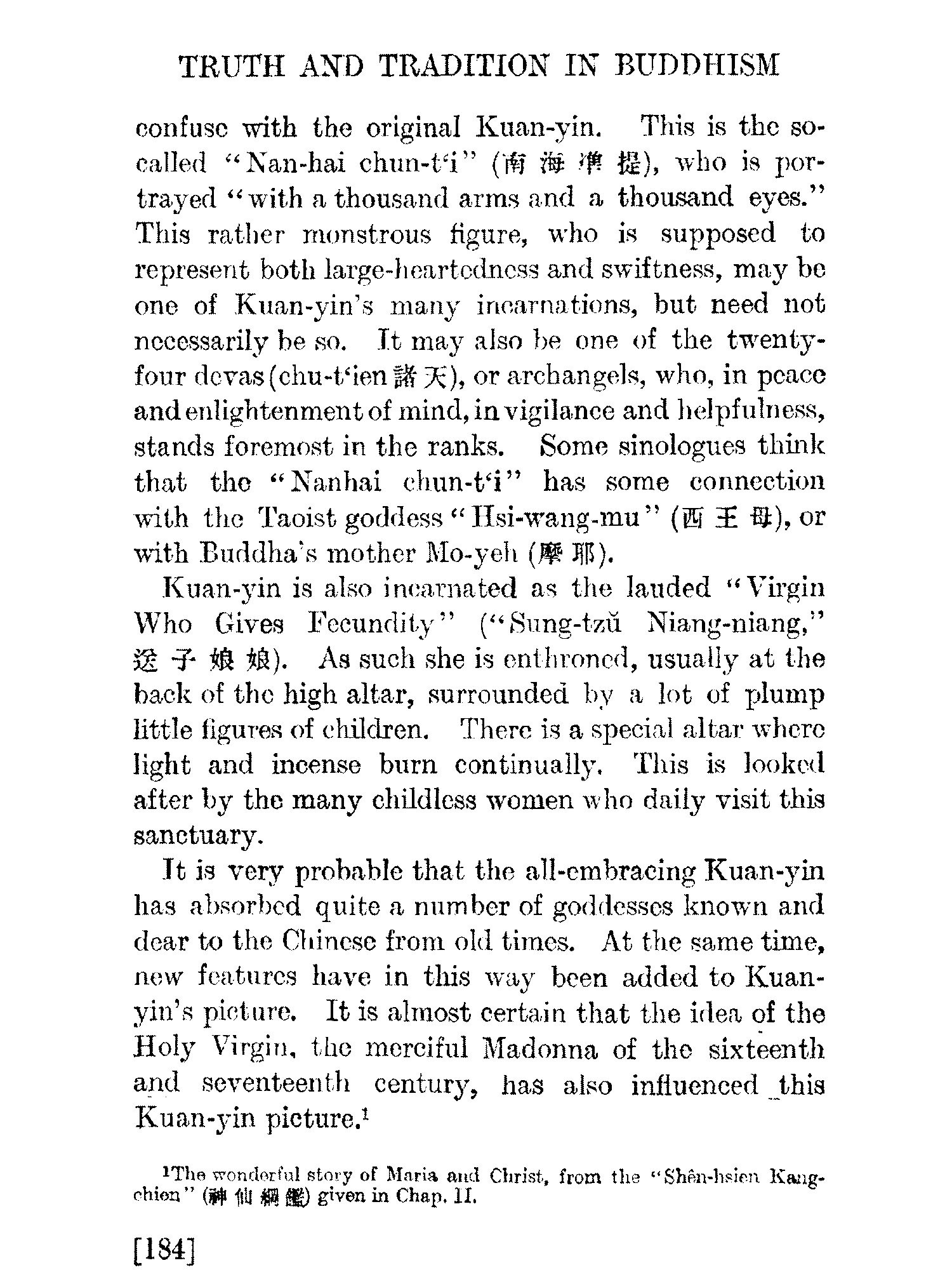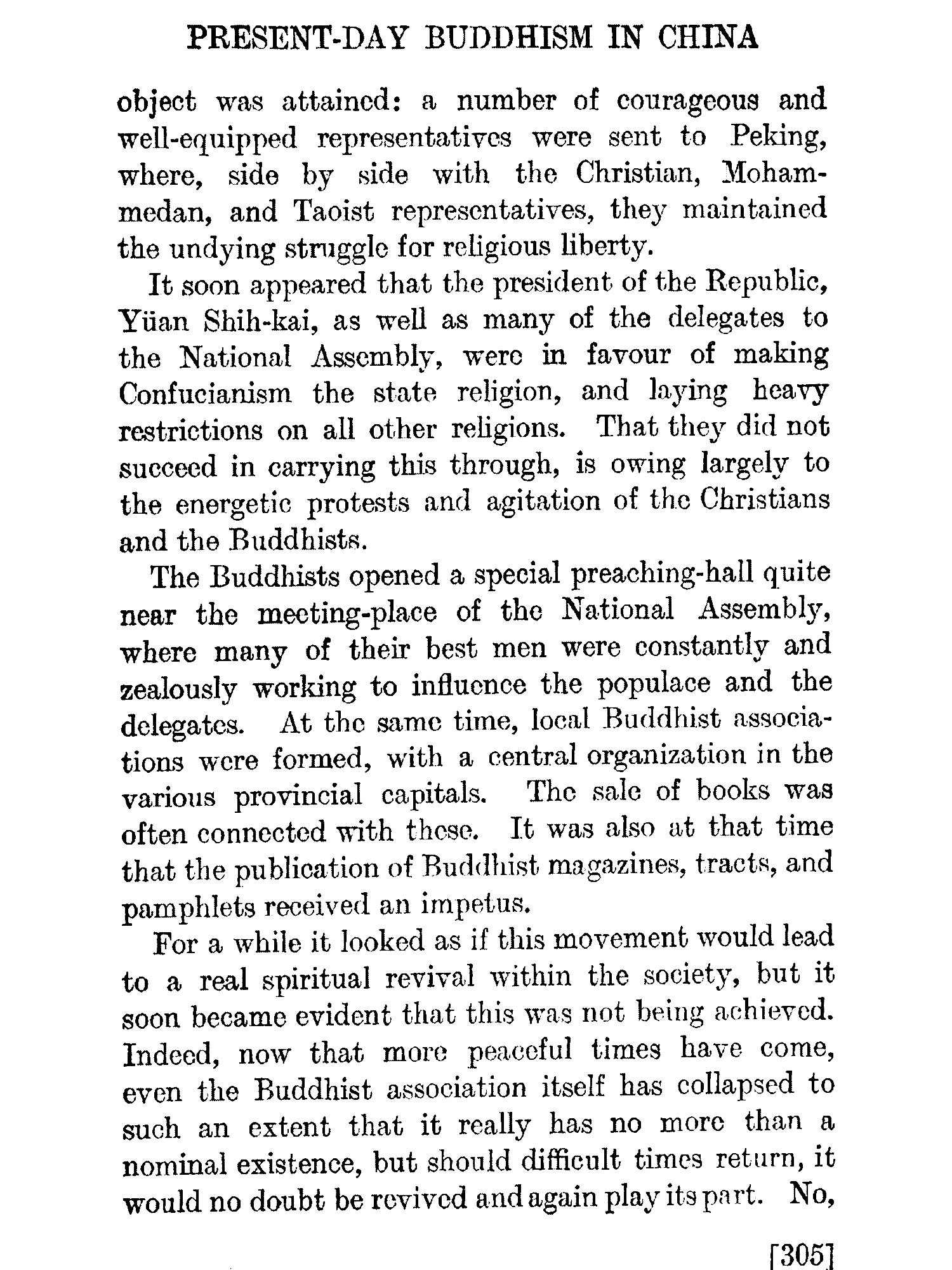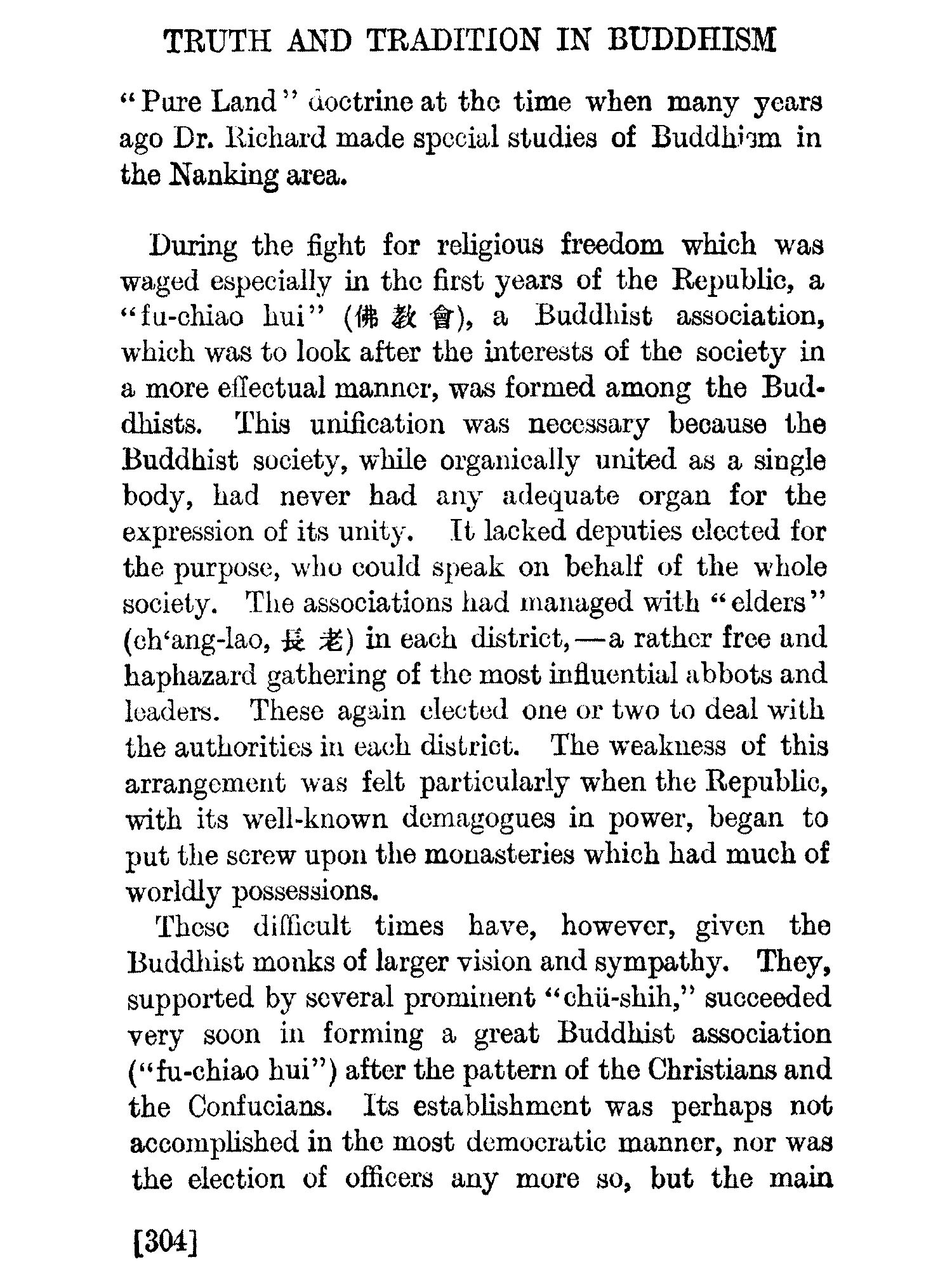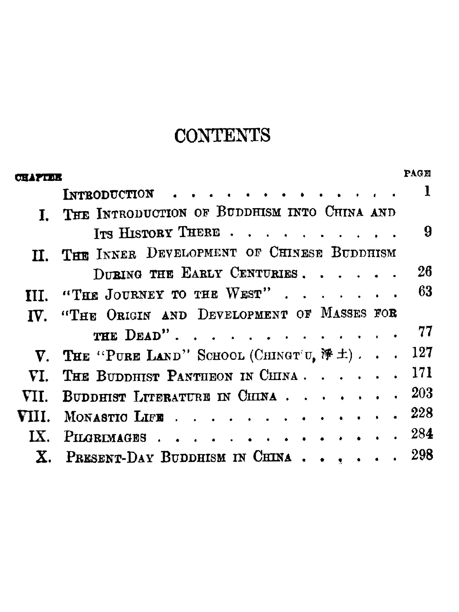 When the Jesuits first came into contact with Buddhism in Japan, in the sixteenth century they wrote of it as the work of the devil, who in it had cleverly imitated many things in the Roman ritual and was even deceiving men by adopting the Lutheran horsey of salvation by faith. Modern missionaries, on the other hand, have been inclined to account for apparently Christian Clements in Buddhism by ascribing them to direct as well as indirect influences of Christianity itself. Others point to these similarities as evidence of tendencies not uncommonly found in the development of historic religions. In this book we have the work of neither the partisan adversary nor the partisan advocate, nor yet of a cold and scholarly but personally indifferent (and quite objective) student of the history of religions. The author has indeed supplemented his long and intimate personal observations and studies of Buddhism in China by scholarly and exacting study of original Buddhist texts and the published works of other Western students in this field; but his chief claim on our gratitude is his illuminating appreciation of what is best and even of much which at first sight seems hopelessly superstitious and corrupt in this ancient and prolific faith. I believe the Christian church in China is ready to welcome this sympathetic presentation of the truth and traditions in Chinese Buddhism. Doubtless others will also give this work a warm welcome, for it abounds in fascinating descriptions of what many take to be meaningless ceremonies and brilliant suggestions as to the results of possible or actual contacts between Christianity and Buddhism during the twelve hundred years since they first met on Chinese soil. But its supreme service will be to Christian missionaries from the West.