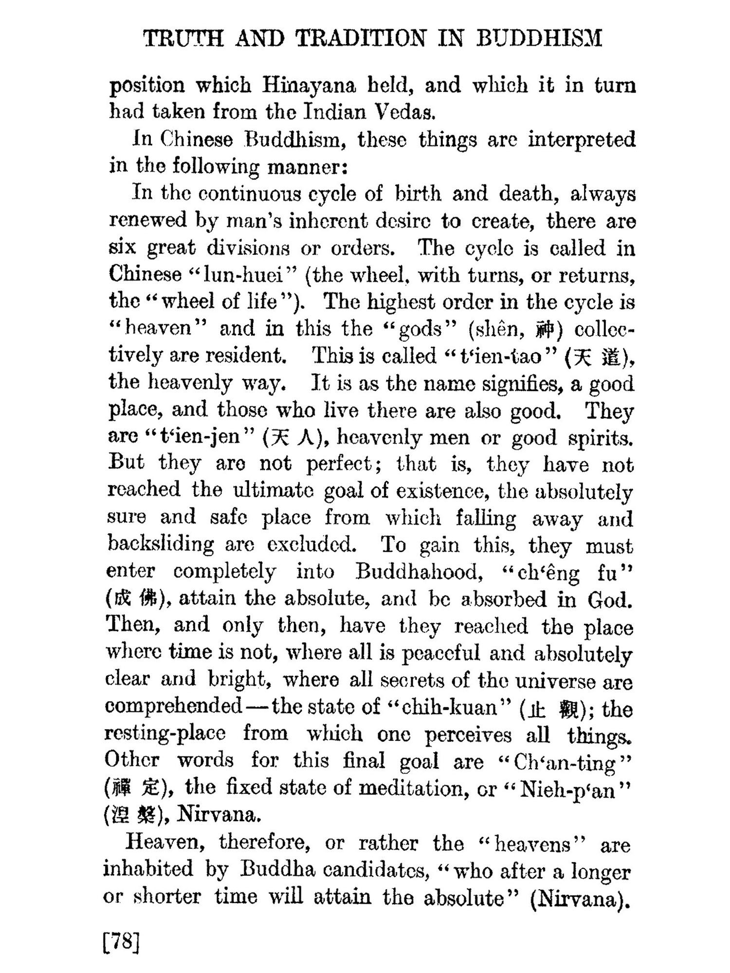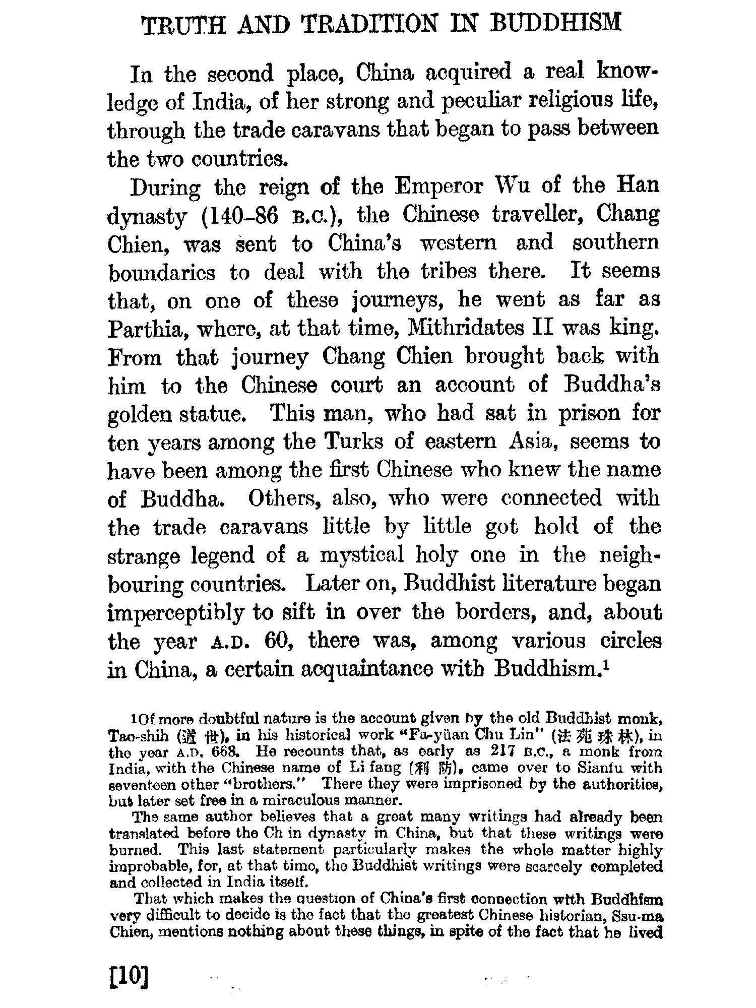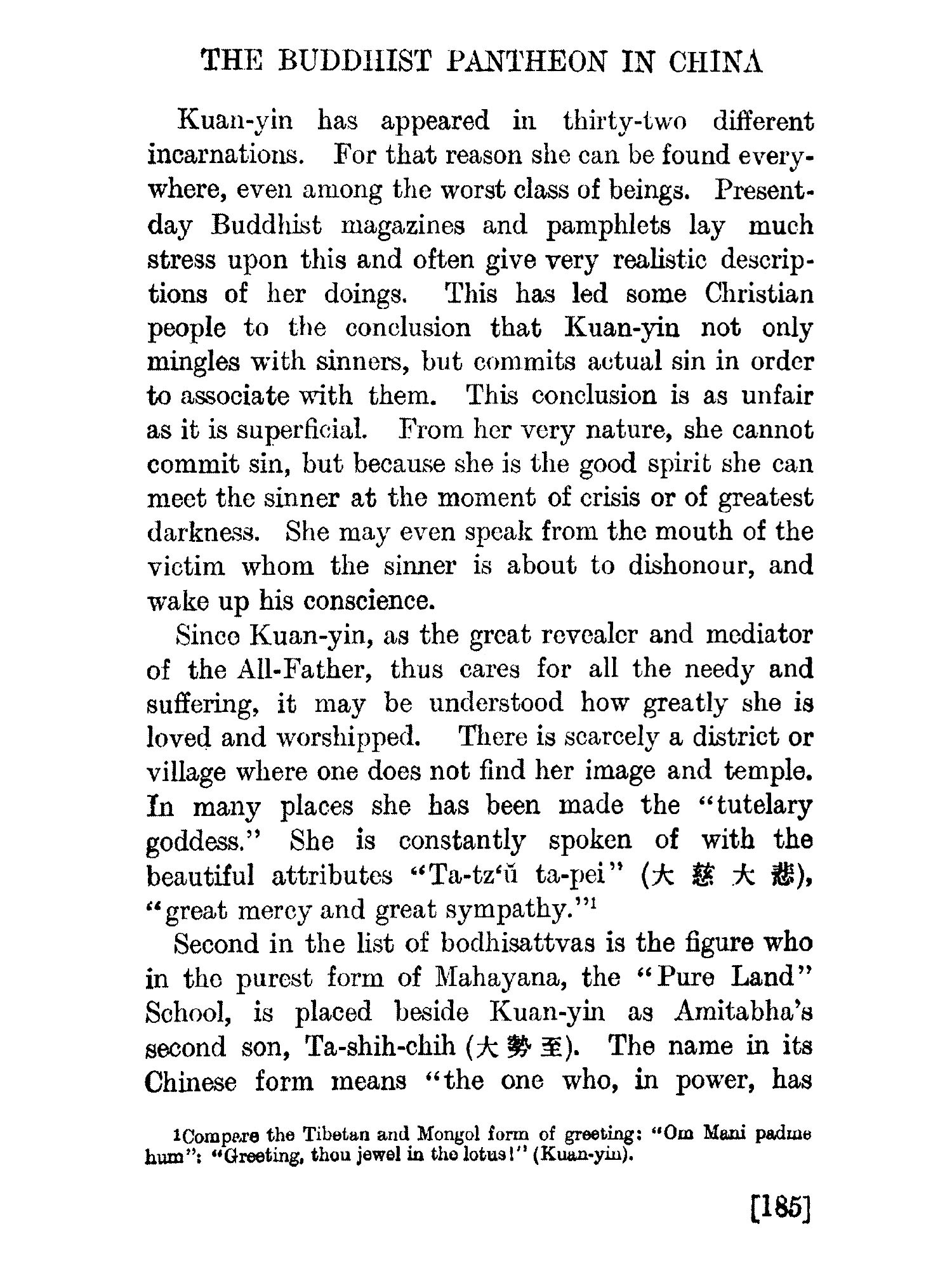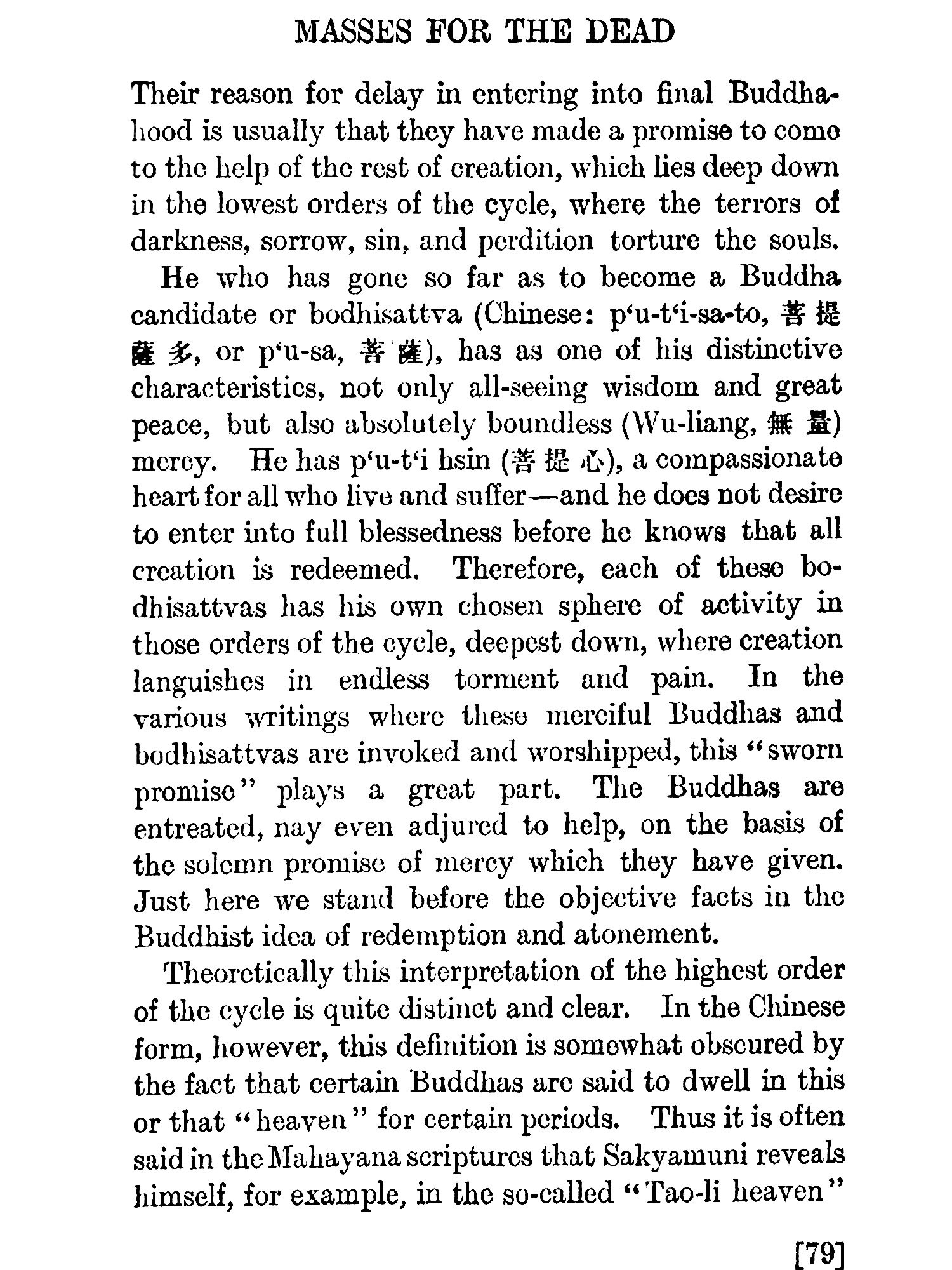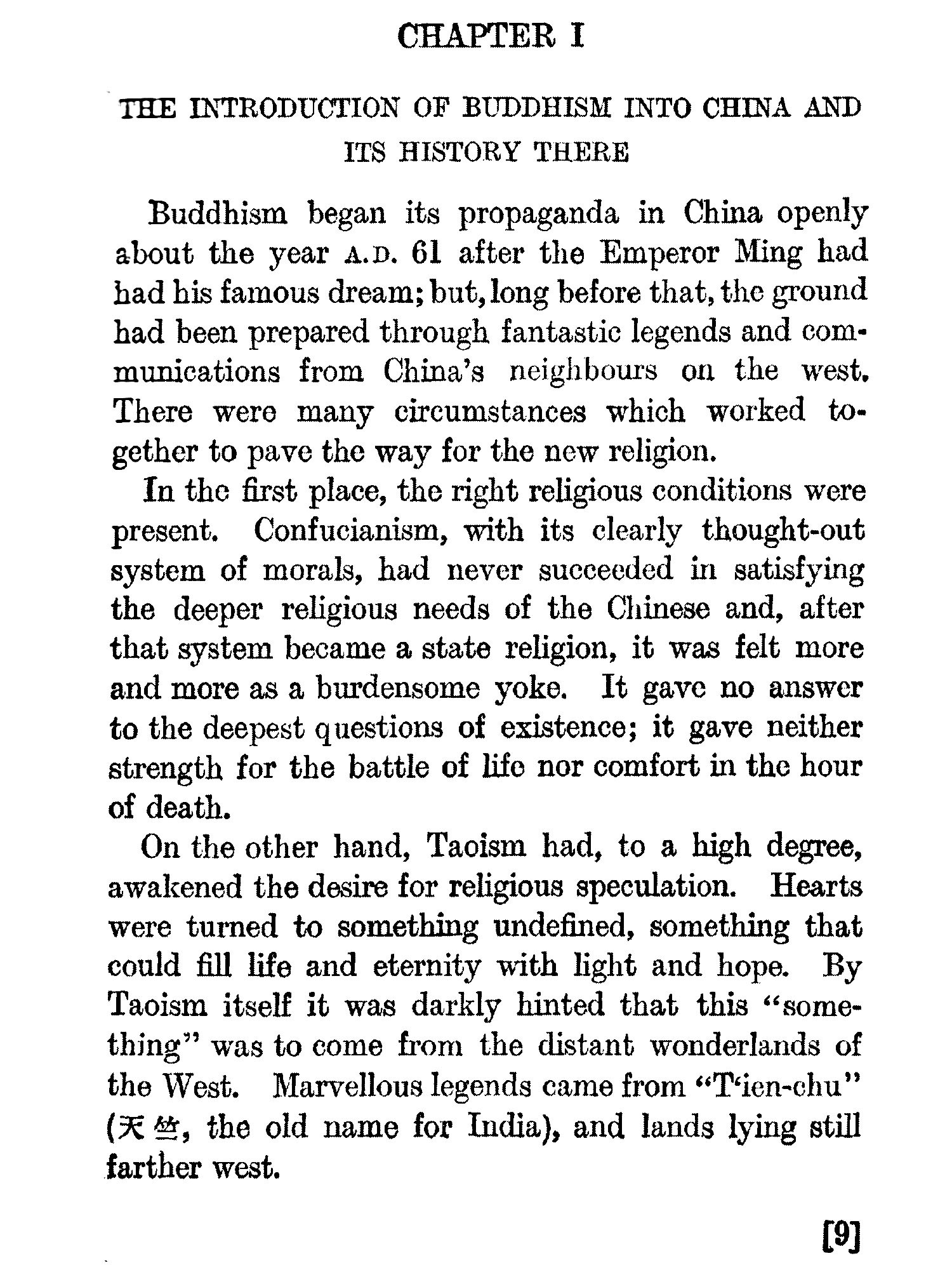 As the title of the book indicates, it will be our object to present the nature and history of Mahayana Buddhism as that history has been evolved on Chinese soil, and as it unfolds itself according to its own nature in the present-day life of this great culture-land of the Far East. We have, therefore, taken as a motto for the entire book that great dominating saying which incontestably has become the principal thought of the Chinese Mahayana, "The salvation of all living things" (P'u chi chung shêng,普濟衆生). Mahayana Buddhism, or, in other words, the Buddhism of the Great Vehicle, has, in recent years, attracted to itself by its very massiveness the in-creasing attention of investigators. This interest is due not merely to its tremendous thought-structures and systems, and its highly developed apparatus of worship, which give it a special position in the life of the East, but also to the fact that it meets, in a most remarkable manner, many of the great religious cravings of life which men in all times and all places feel more or less consciously.