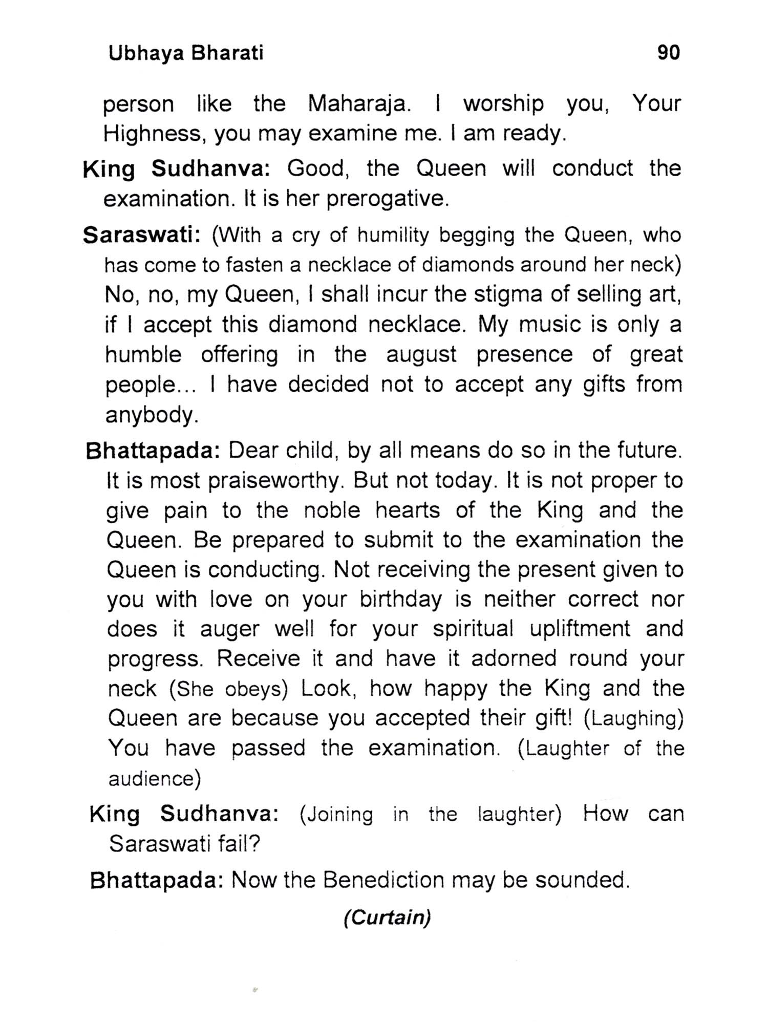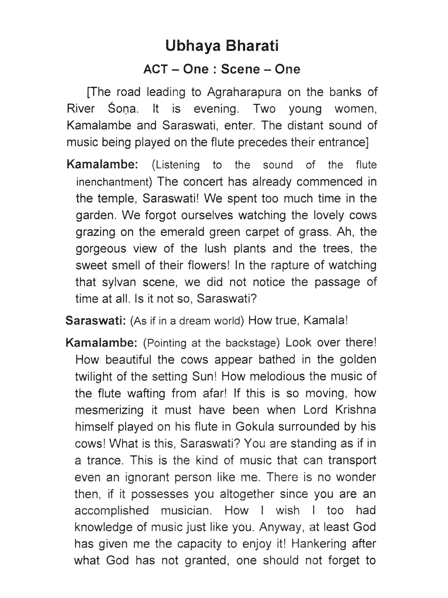 Ubhaya Bharati is a historical play that revolves around the renowned scholar-debater Saraswati, who bears the title Ubhaya Bharati, and her erudite husband Vishwarupa, also known as Mandana Mishra. The play portrays their conjugal life, imbued with lyrical beauty, but punctuated by several dramatic episodes of conflict between the ancient Vedic religion and Buddhism. The play leads up to its climax in the form of the famous philosophical debate between Mandana Mishra and Adi Shankaracharya, with Ubhaya Bharati, who was considered as the very incarnation of the Goddess Saraswati, acting as the impartial arbiter. The play is an extraordinary blend of deep scholarship, dramatic plots, and skilful stagecraft of the highest order.