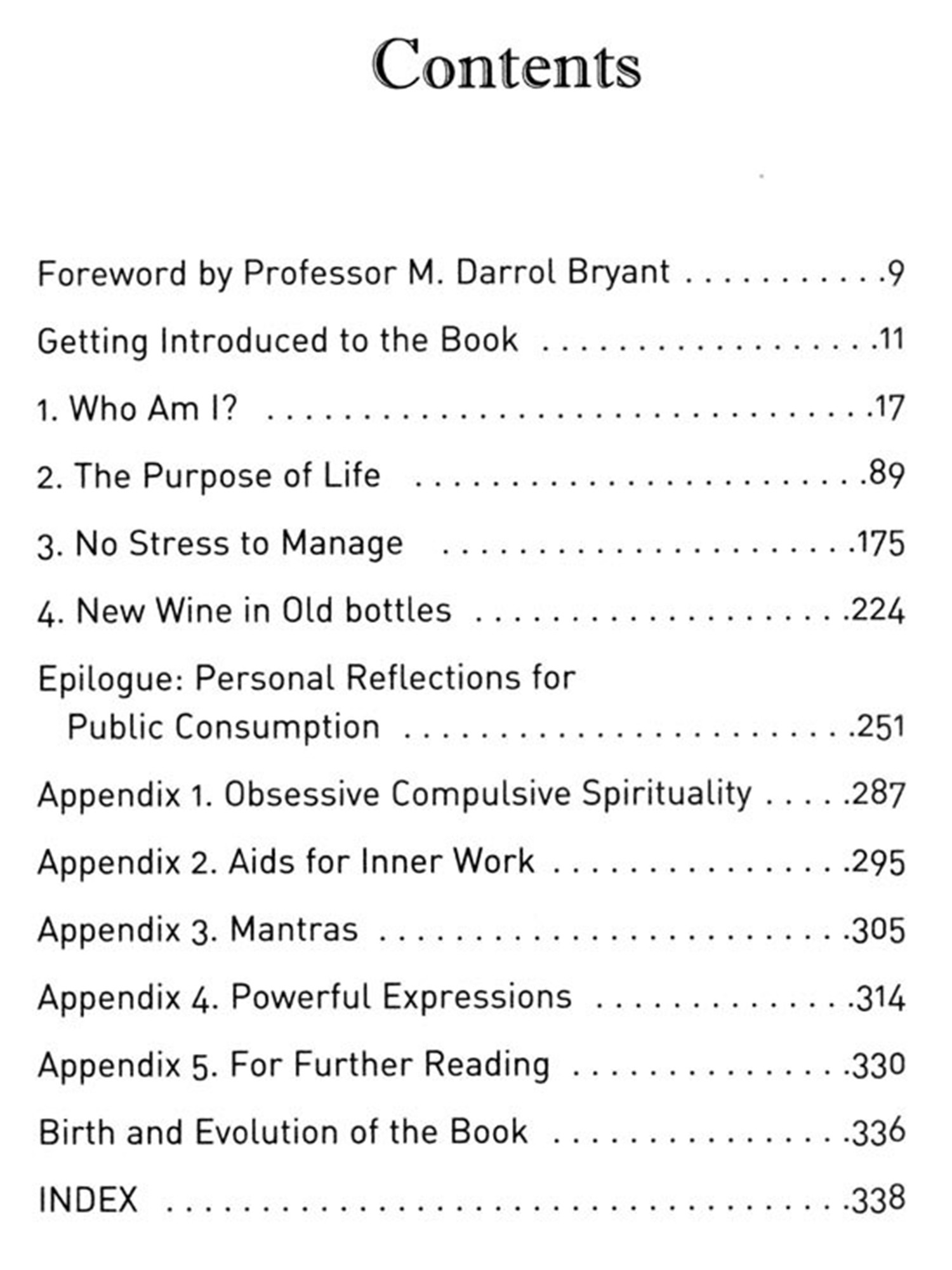 The third chapter, No Stress to Manage, builds on the insights and wisdom gained of who we are and what the purpose of life is, and addresses the issue of stress in our lives. While stress is part of all our lives, it can be overcome. There are insights and practices that can move one toward this goal. Here the author first urges us to relax since obsessing about stress only makes it worse. Secondly, we should understand that stress arises from "the gap between the way things are and the way we would like them to be." And if we can't change the situation, then our only option is to change ourselves.