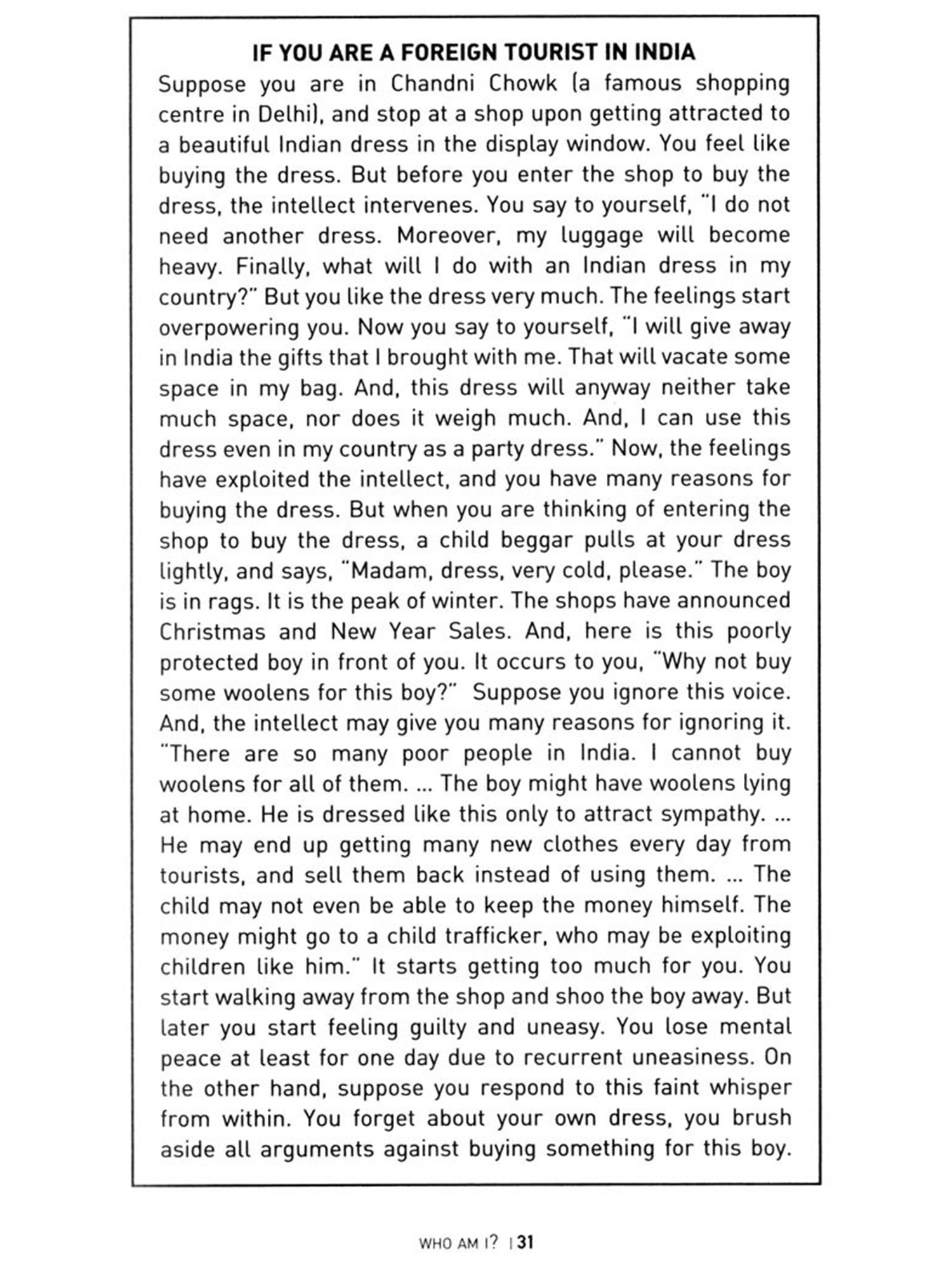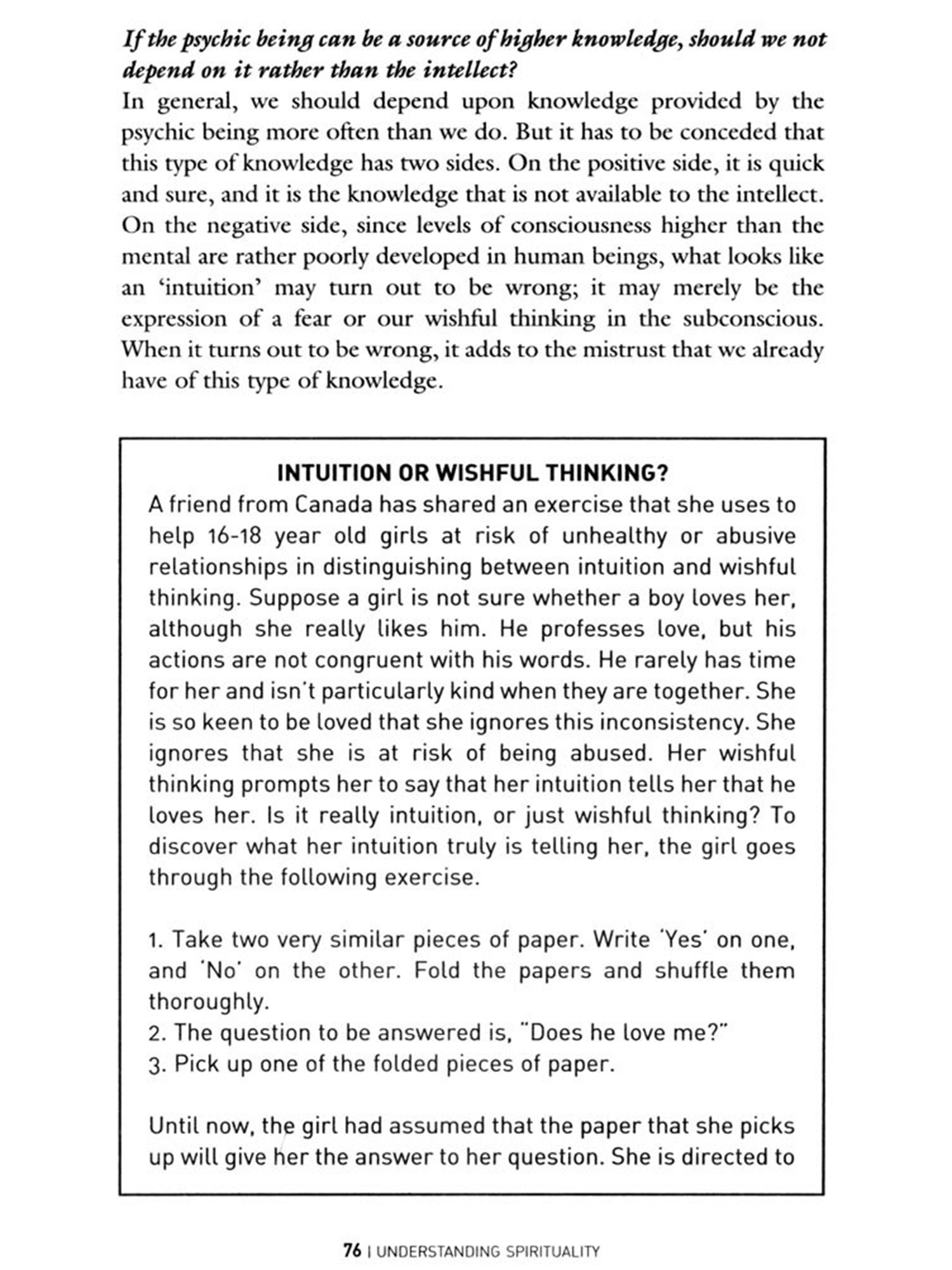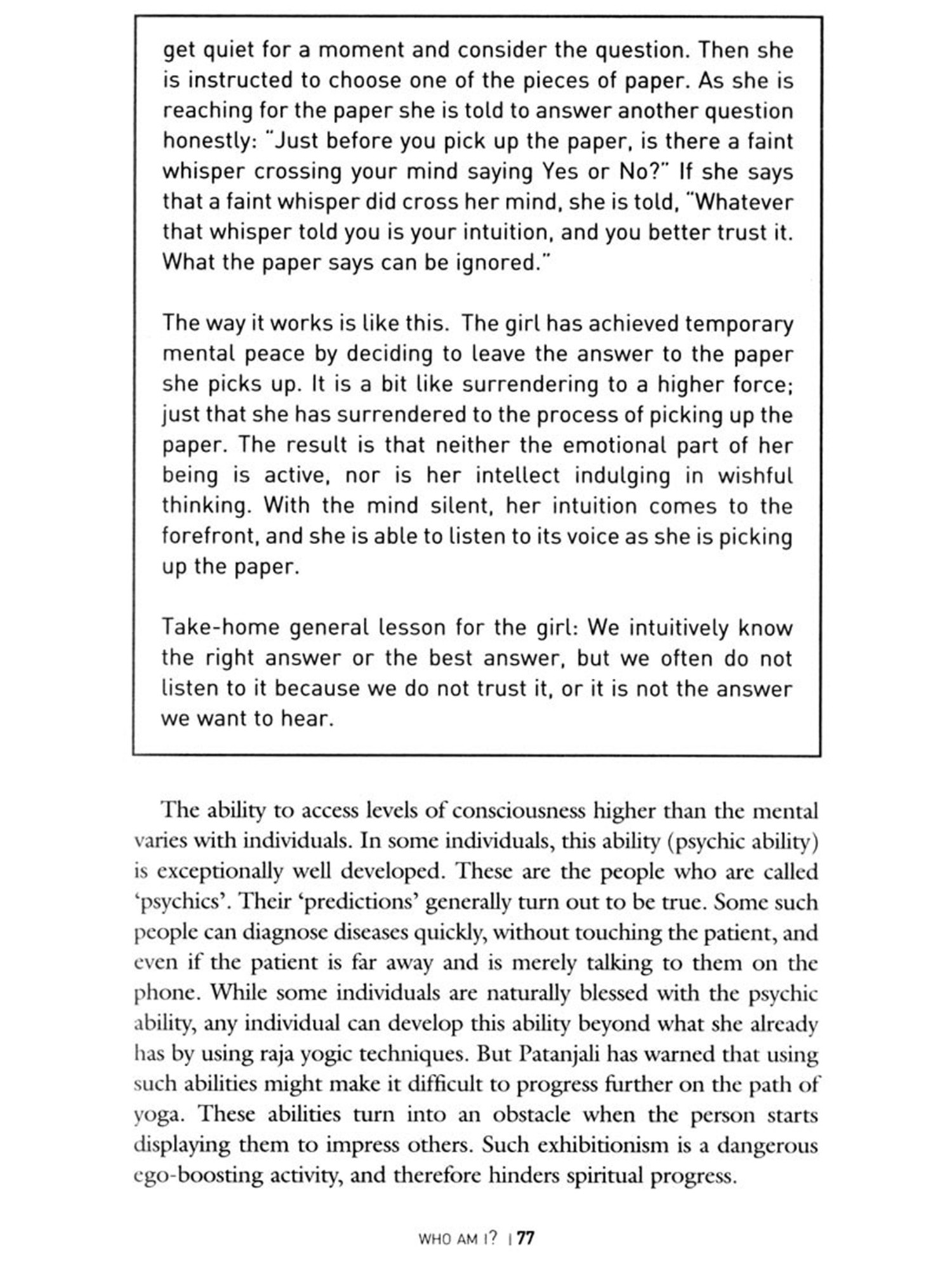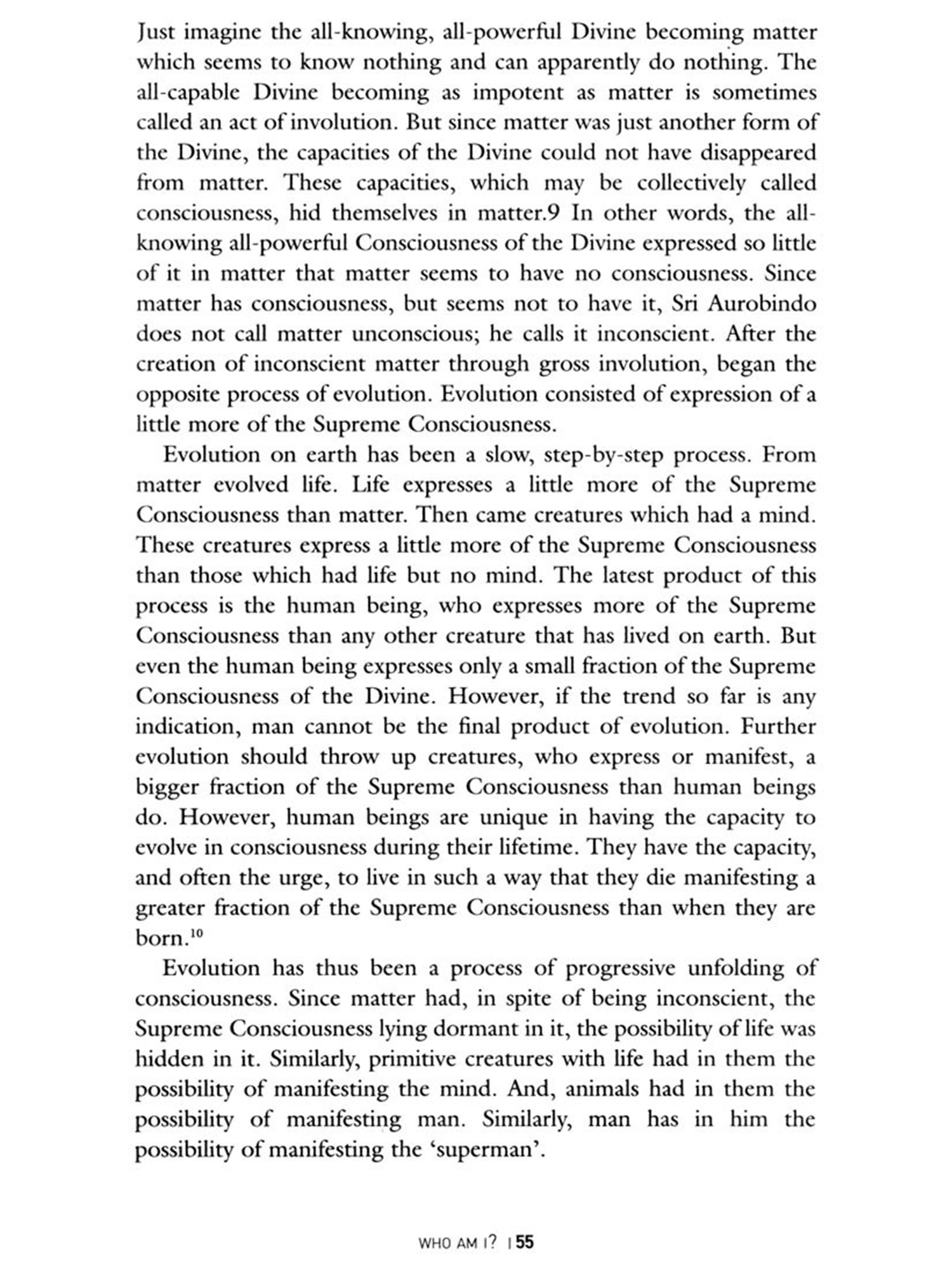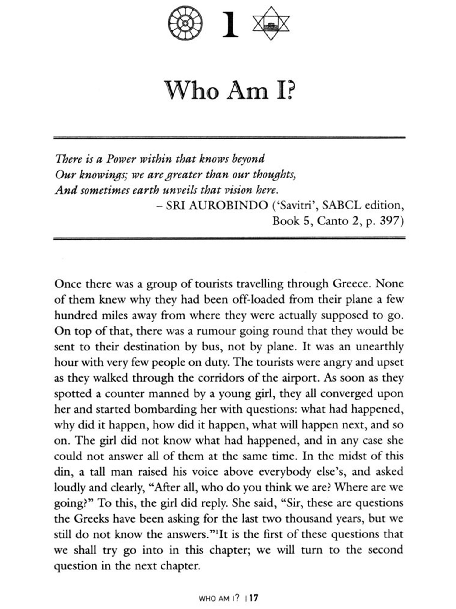 In the first chapter on Who Am I? the author outlines the multidimensional beings we are: a living body, a mind with feelings and thinking, and a soul and psychic being. Our psychic being is "an infallible guide" to right and wrong in every situation. Heeding that "still small voice" can put us on the right path. These dimensions of the person are explained in accessible language, telling examples and transformative stories.