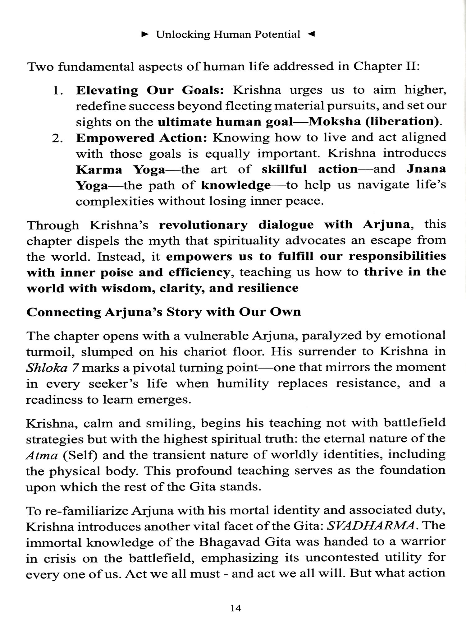 First Step Into Bhagavad Gita, through an analytical exposition of Arjuna's catastrophic downfall in Chapter 1 of the Bhagavad Gita, familiarised Gita enthusiasts with the common but debilitating human frailties that impede material and spiritual progress. This book unlocks the treasure trove of the highest wisdom contained within Chapter II through practical insights to overcome those impediments. It simplifies Krishna's revolutionary introduction to the path of Karma Yoga that purifies the mind through the proper execution of one's Svadharma (bounden duty) and the path of Jnana Yoga that leads to the discovery of the Self within through steady contemplation upon scriptural knowledge.