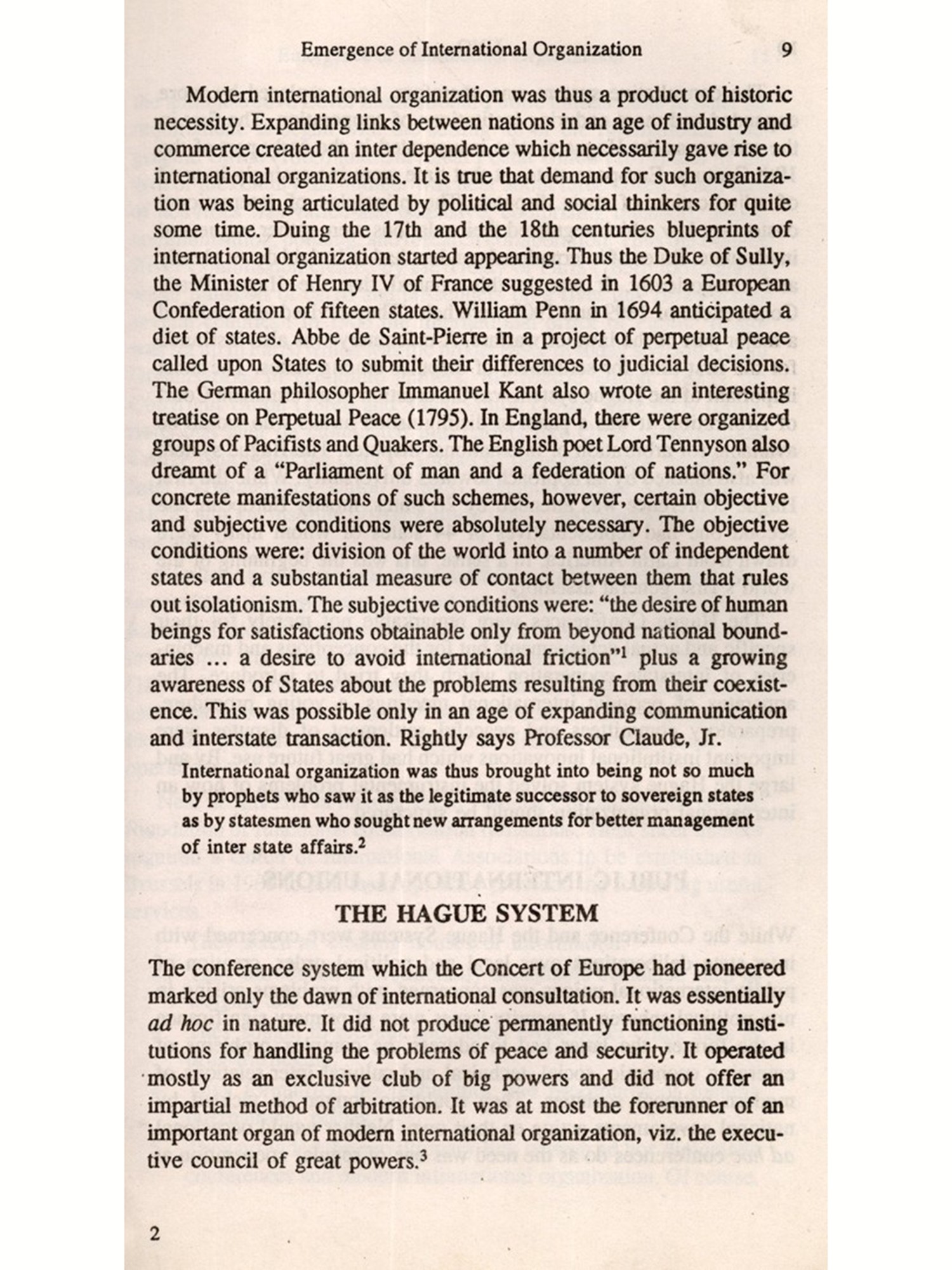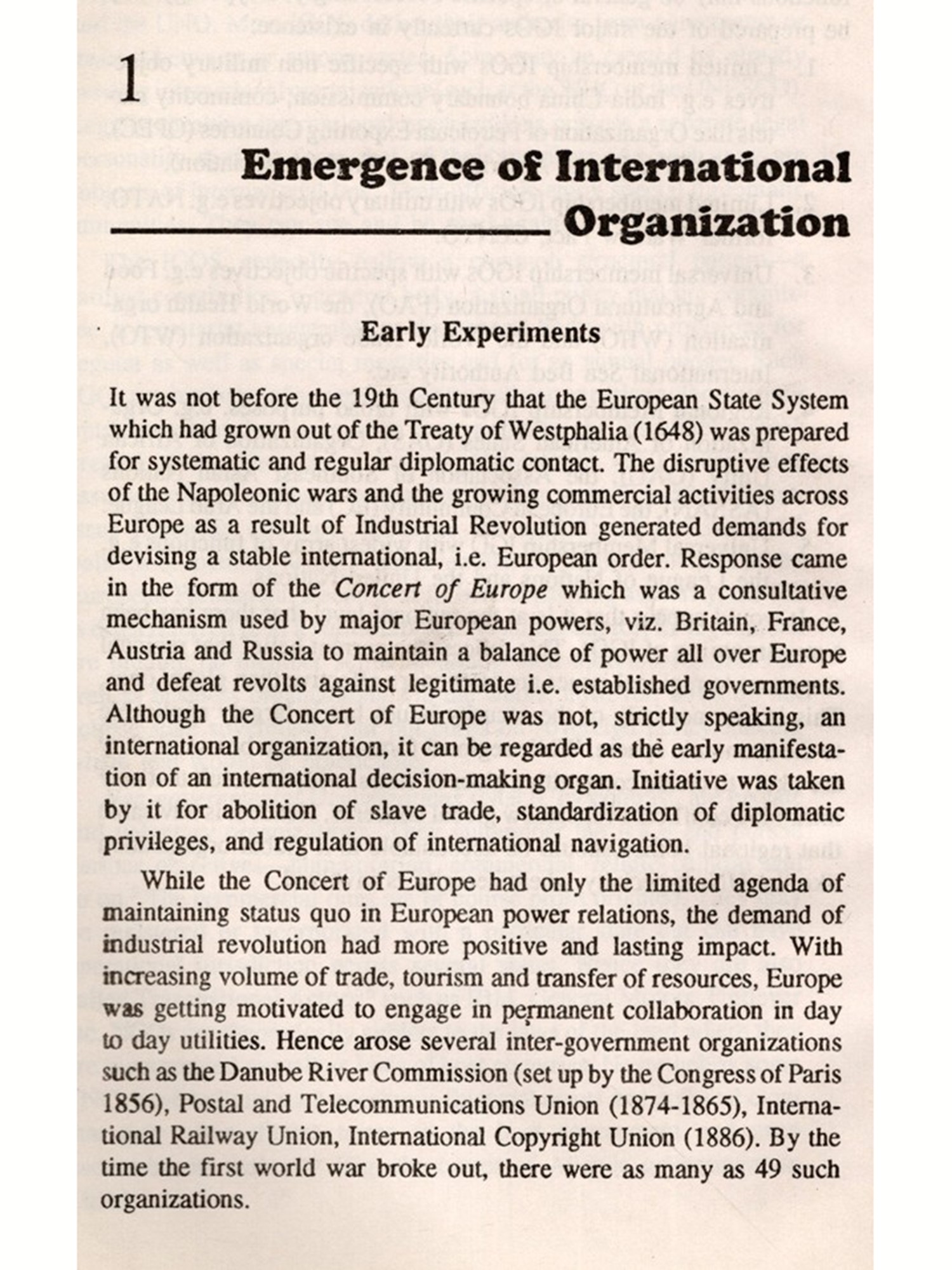 In fact many of us do not always realize how in our simple day-to-day activities we depend on organizations that do not belong to a single nation. An air letter, a faxed message, an overseas relief that we may receive or send all have the supportive services of one in international body or the other-the Universal Postal Union (UPU) or International Telecommunications Union (ITU) or the International Red Cross. Even our sovereign states cannot do without approaching. international organizations like the World Meteorological Organization (WMO) for global weather information, the International Monetary fund (IMF) for financial assistance in times of foreign exchange crisis or the International Court of Justice (ICJ) for settling disputes say of fishing in other's maritime zone. States are also affected by the action of such bodies as Organization of Petroleum Exporting Countries (OPEC) when it fixes the quantity and price of oil or the International Atomic Energy Agency (IAEA) when it suspects clan-destine nuclear experiments and wants to inspect closely guarded establishments.