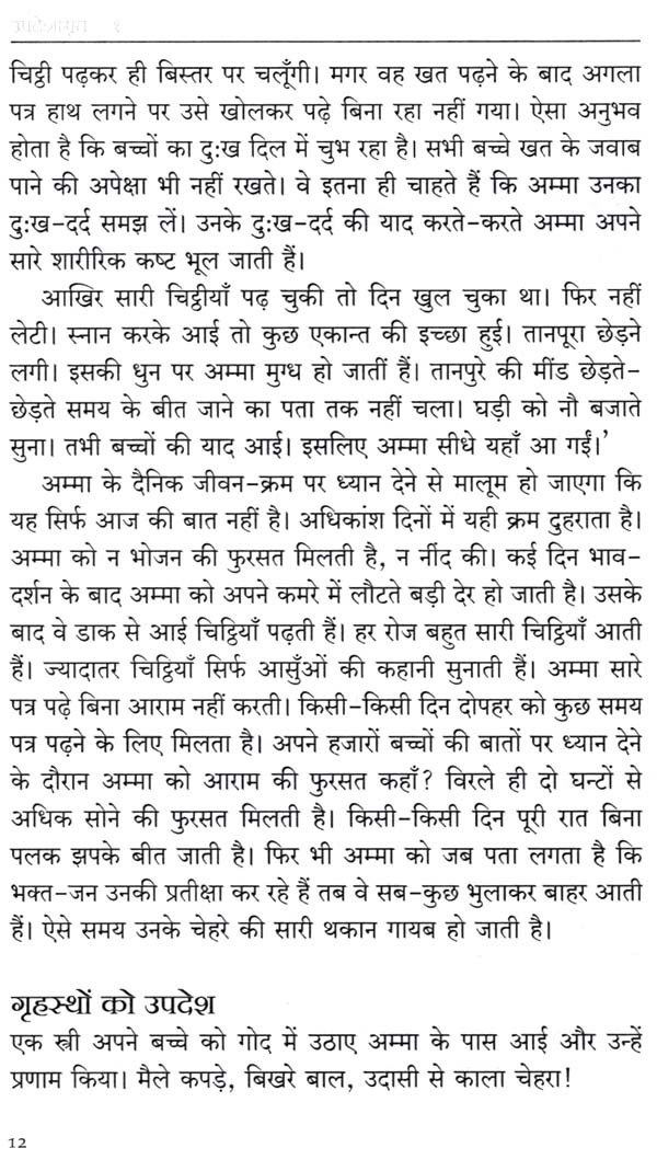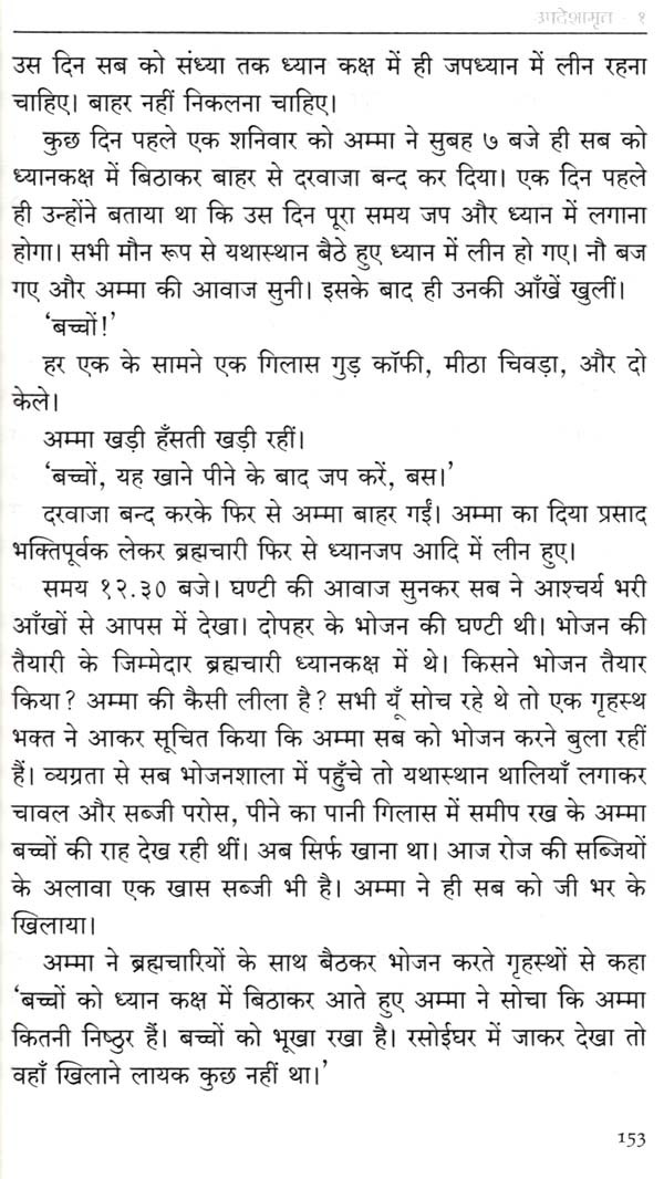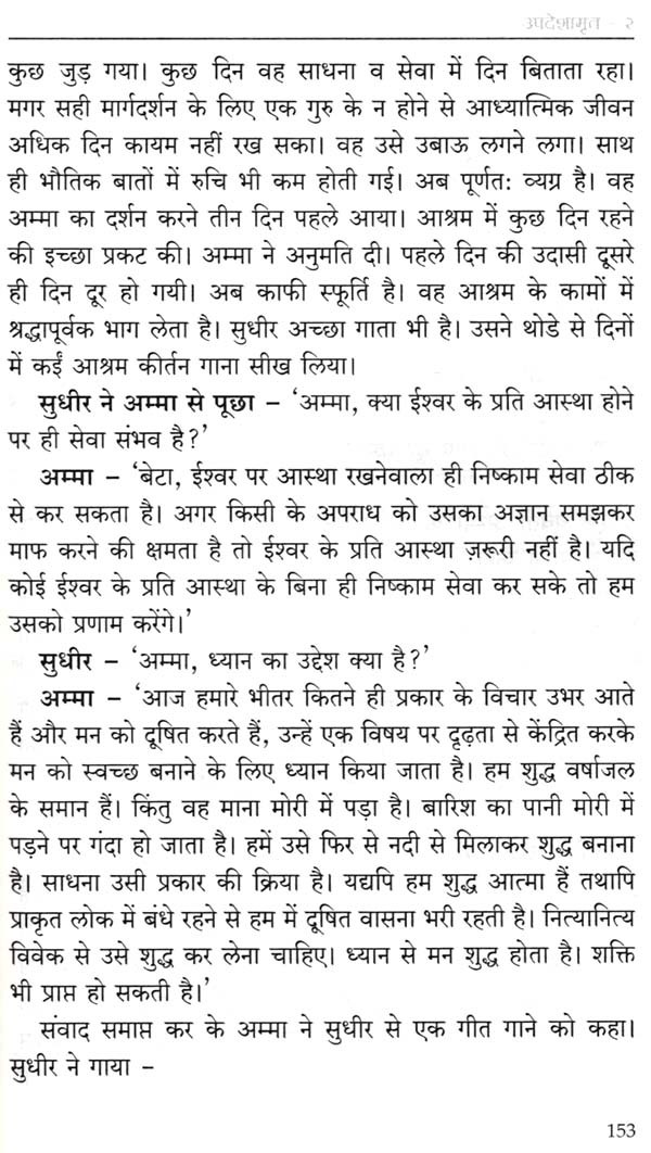 अम्मा के उपदेश कोरे सिद्धान्त नहीं हैं। वे अत्यन्त व्यवहारिक और जीवनस्पशीं हैं। जिज्ञासु पाठक देख सकते हैं कि अम्मा के उपदेश कितने ही क्षेत्रों पर उज्ज्वल प्रकाश डालते हैं, सामूहिक एवं वैयक्तिक जीवन की सुव्यवस्था के लिए आध्यात्मिक शिक्षण और साधना की आवश्यकता, आत्मान्वेषण में निष्काम लोक सेवा का स्थान, अंतरंग प्रार्थना एवं प्रेम-भक्ति का महत्त्व, गृहस्थ का धर्म, दैनिक जीवन की समस्याएँ, स्त्री-पुरुष धर्म, साधकों के लिए पथ-प्रदर्शन, सैद्धान्तिक पहेलियाँ आदि अनेक आयामों पर अम्मा के शब्द प्रकाश डालते हैं। हमें बीच-बीच में इन शब्दों में अम्मा का आठान गूँजता सुनाई दे सकता है। वे हमें प्रेरणा देती हैं कि तड़क-भड़क और दुर्व्यसन त्यागकर आध्यात्मिक जीवन बिताओ, दुःखित एवं पीड़ित लोगों की सेवा करो।