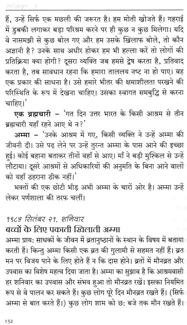 अभिलाषा की पूर्ति की काम्य भक्ति निश्छल ईश्वर प्रेम का स्थान हथिया लेती है। मानव अस्थायी लाभ देने वाली प्रतिभा को अतिरंजित स्थान देता है। वह विवेक के प्रतिश्रुत स्थायी श्रेय को ठुकराता है। ऊँचे आध्यात्मिक आदर्श एवं उदात्त अनुभूतियाँ जीवन में प्रकट होने के बदले केवल शब्दों में सीमित रहती है। ऐसे ही युग में अम्मा निश्छल भक्ति की, हृदय की, विवेक की, प्रेमपूर्ण निज जीवन की भाषा में बोलती हैं। अम्मा की अमृतवाणी की अत्यंत तत्काल आवश्यक, तथा साथ ही स्थायी प्रासंगिकता भी यही है।