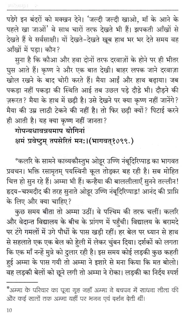 सुहृदय पाठक जब अम्मा की वाणियों का विश्लेषण करें, तब उन्हें ऐसी विशेषताओं पर गौर करना चाहिए। महात्माओं की वाणी के कई अर्थतल होते हैं। प्रत्येक व्यक्ति को अपने स्तर का अर्थ ग्रहण करना चाहिए। उपनिषद् की यह कथा प्रसिद्ध है कि ब्रह्माजी ने जब 'द' उच्चारण किया, तब असुरों, मानवों और देवों ने उसे यथाक्रम 'दया', 'दान' और 'दम' के रूप में आत्मसात् किया।