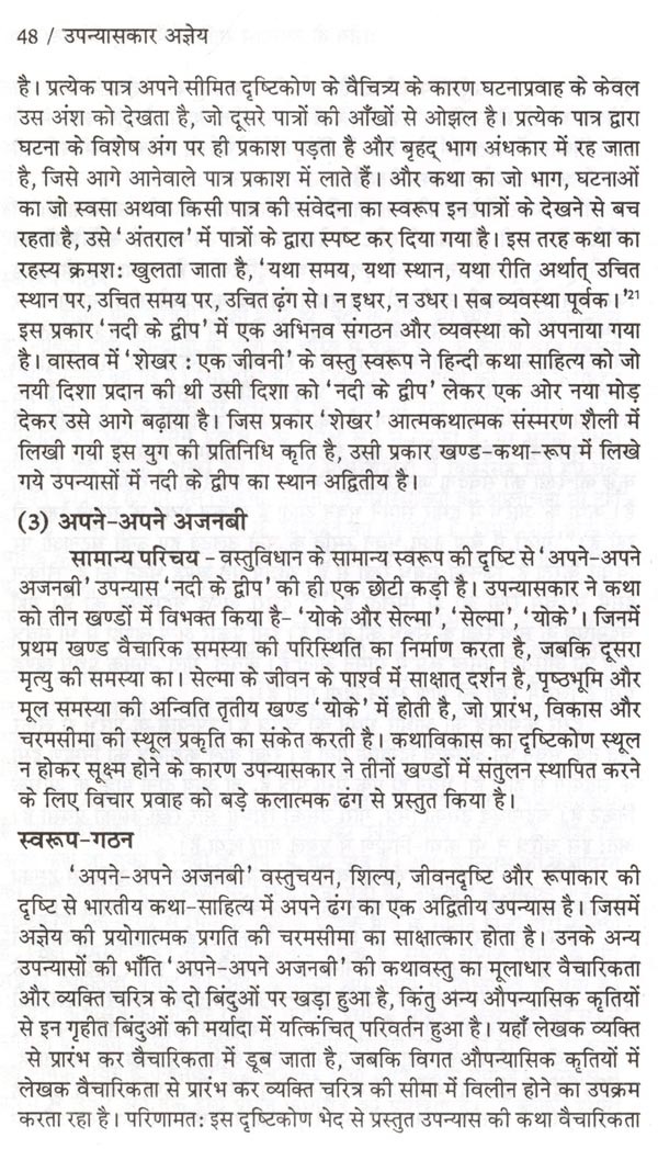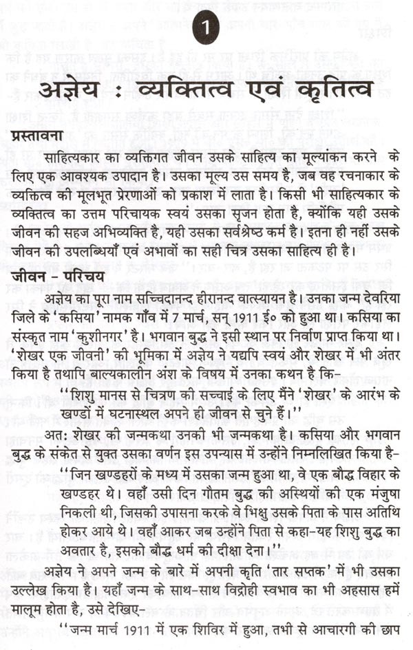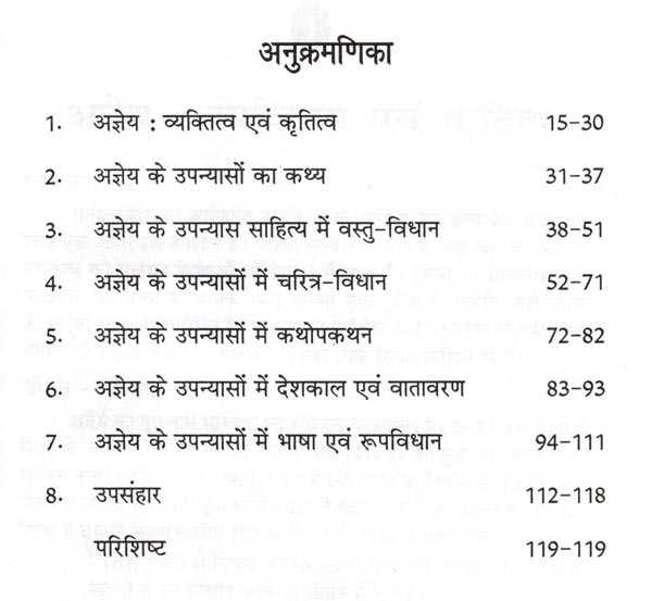यह मेरी प्रथम प्रकाशित रचना है। हिन्दी साहित्य की उच्च कक्षाओं के अध्ययन में कथा साहित्य के लिए मेरी विशेष अभिरुचि रही। इसमें भी कहानी की तुलना में उपन्यास के प्रति अधिक आकर्षण था। उपन्यास रचना के उच्चतम स्तर पर समसामयिकता के रचनाबोध के साथ एक दृष्टि की माँग अनिवार्यतः की जाती है। किसी भी युग का उच्चतम साहित्य वही होता है, जो उस युग के मूल्यों की प्रक्रिया को सर्जनात्मक स्तर पर गतिशील कर सकें। जैनेन्द्र और अज्ञेय के उपन्यासों का स्तर अपने समकालीन उपन्यासकारों की अपेक्षा अधिक ऊँचा लगने का कारण यह है कि उनमें रचना की एक दृष्टि है। आधुनिक युग वस्तुतः संक्रान्ति का युग है, प्रायः समस्त स्थापित मूल्यों के विघटन एवं नवीन मूल्यों के स्थापन प्रयत्नों का युग है। आधुनिक उपन्यास साहित्य के संदर्भ में अज्ञेय का उपन्यास साहित्य यदि एक ओर भारतीय जनजीवन, उसकी चेतना, विषमताओं आदि के यथार्थ चित्रण की दृष्टि से महत्त्वपूर्ण है तो दूसरी ओर अपनी शैली, शिल्प एवं मानव मन की शाश्वत अनुभूतियों के कलात्मक अभिव्यक्तिकरण की दृष्टि से महत्त्वपूर्ण है। वस्तुतः अज्ञेय का उपन्यास साहित्य आधुनिक युग का वास्तविक एवं पूर्ण प्रतिबिंब है, चाहे तो भाव विधान की दृष्टि से और चाहे शिल्पविधि की दृष्टि से अज्ञेय का समस्त उपन्यास साहित्य आधुनिक उपन्यास साहित्य में एक सीमा स्तम्भ है। प्रस्तुत पुस्तक हमारे शोधकार्य का एक हिस्सा है। इसमें अज्ञेय की उपन्यास विषयक अवधारणाओं, चिंतन और उपन्यास रचना की प्रक्रिया को समझने का विनम्र प्रयास है। प्रस्तुत शोधकार्य आठ अध्यायों में विभक्त है। प्रथम अध्याय के अंतर्गत अज्ञेय जी के जीवन, व्यक्तित्व एवं कृतित्व पर उपलब्ध सामग्री के आधार पर उनके जीवन, व्यक्तित्व एवं कृतित्व का संक्षेप में परिचय दिया गया है। द्वितीय अध्याय में अज्ञेय के समस्त उपन्यास साहित्य का सामान्य परिचय देते हुए उनके कथ्य पर विचार किया गया है। उनका उपन्यास साहित्य विशाल तो नहीं लेकिन प्रौढ़ता की दृष्टि से हिन्दी साहित्य में वह अपना पृथक स्थान रखता है। इतना ही नहीं मनोवैज्ञानिक उपन्यास के क्षेत्र में उनकी उपलब्धियों का परिचय 'शेखरः एक जीवनी' से अवश्य हो जाता है। आधुनिक उपन्यास साहित्य के क्षेत्र में अज्ञेय के योगदान को समझने के लिए यह आवश्यक है कि उनके समस्त उपन्यास साहित्य के कथ्य पर विस्तार से विचार किया जाय। तृतीय अध्याय के अंतर्गत अज्ञेय के उपन्यास साहित्य के वस्तु विधान का विश्लेषण एवं विवेचन किया गया है। वस्तु चयन के आधार एवं क्षेत्र को स्पष्ट करते हुए प्रत्येक उपन्यास का सामान्य परिचय देते हुए उनके स्वरूप गठन पर गंभीरतापूर्वक विचार किया गया है। चतुर्थ अध्याय में अज्ञेय के उपन