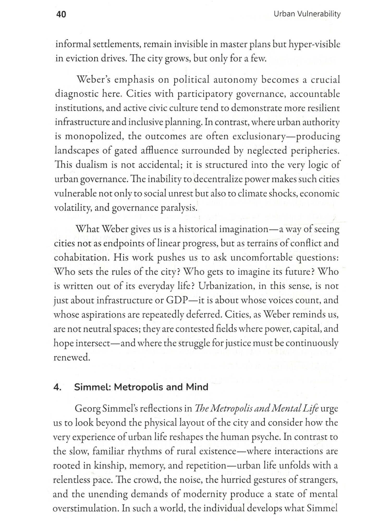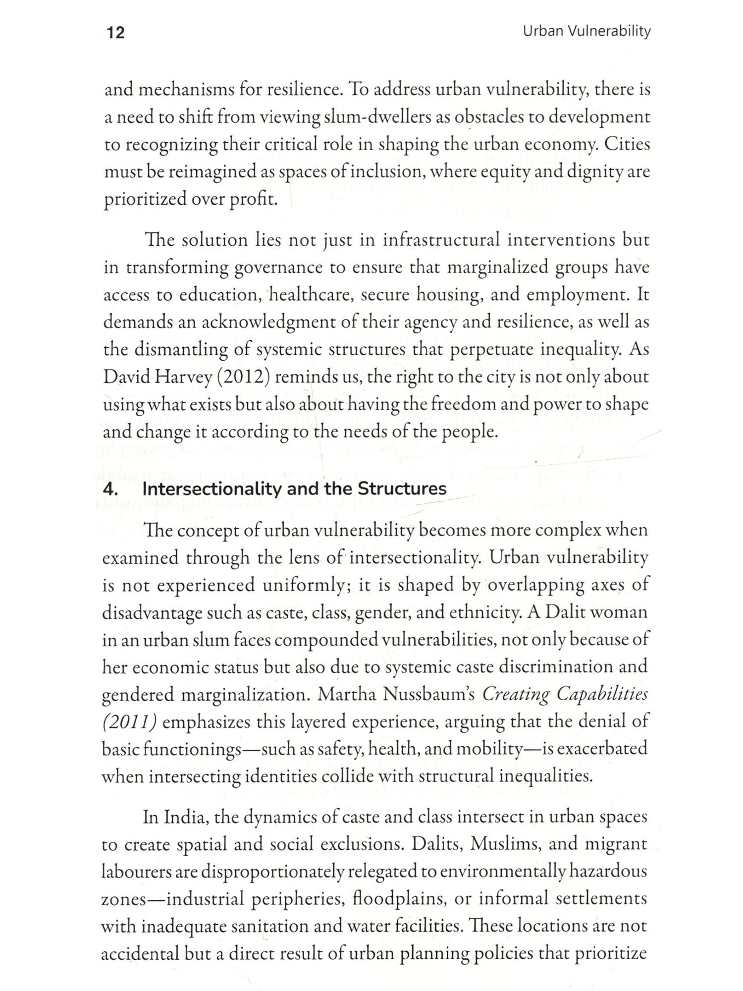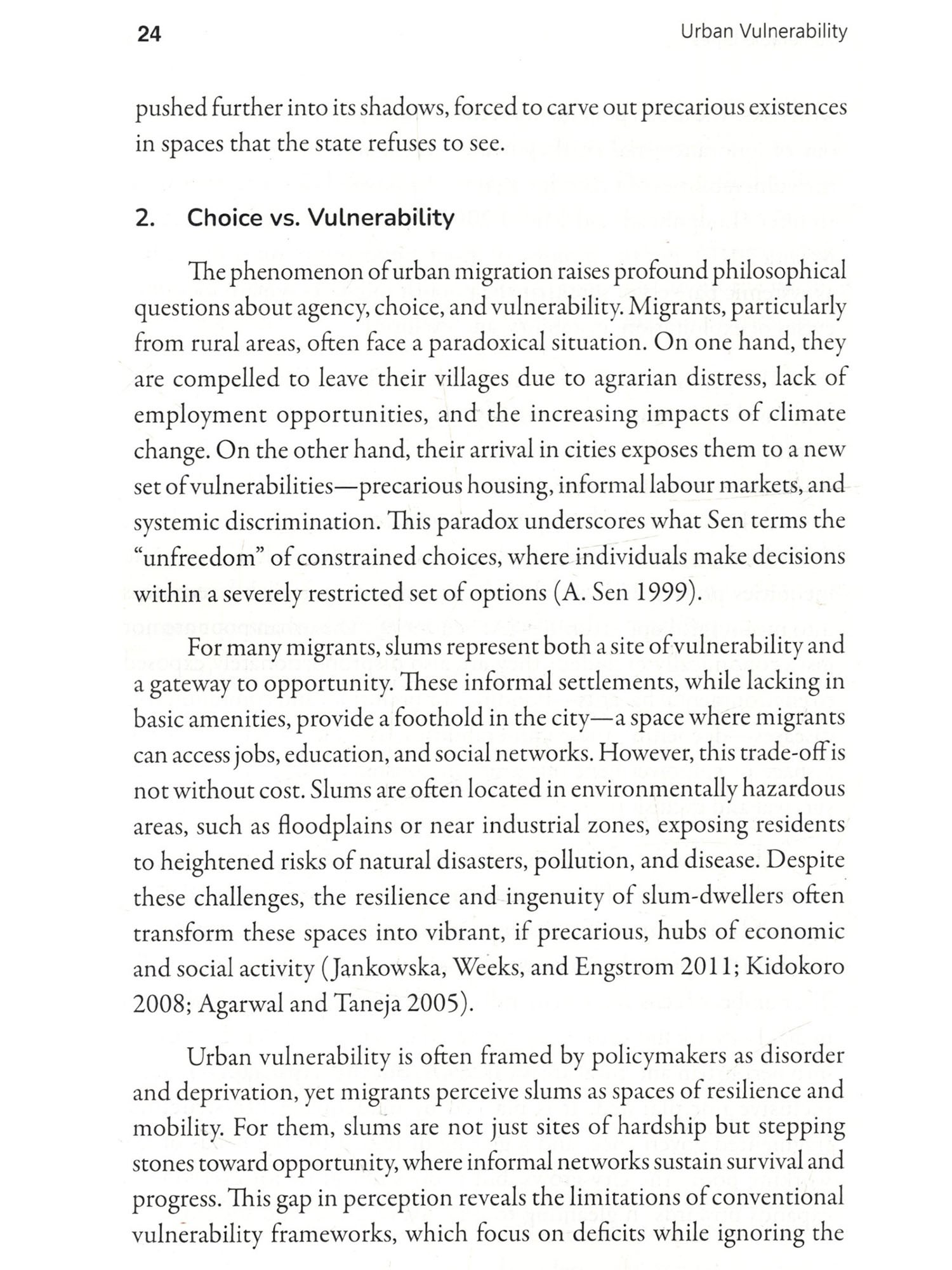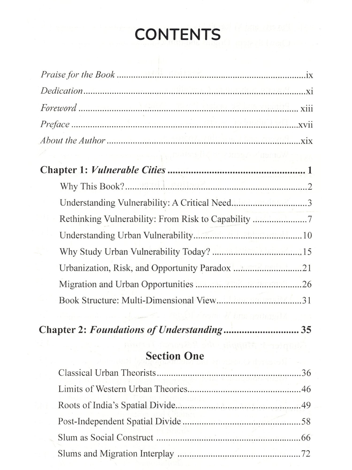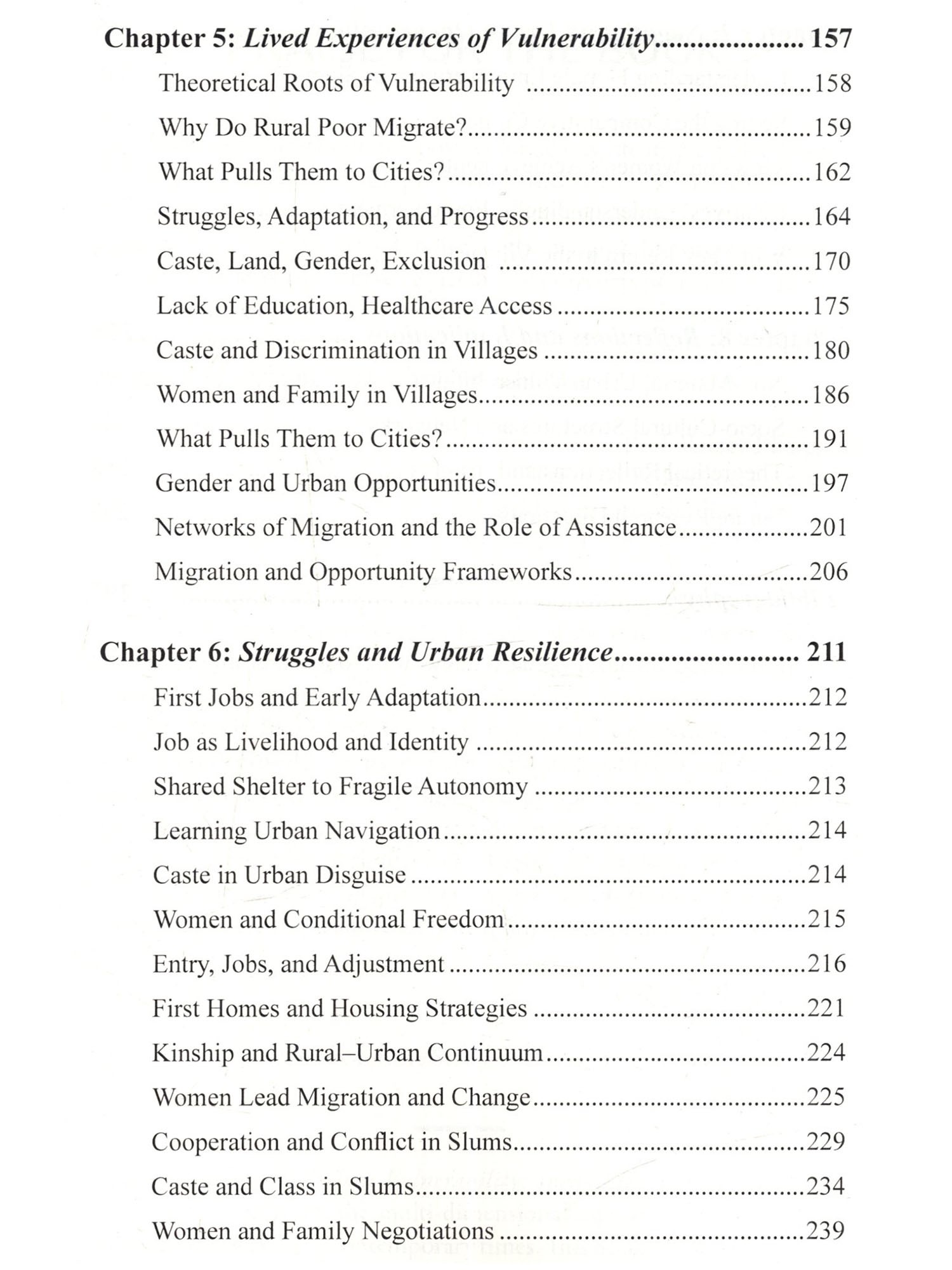 Cities are peculiar creations. They grow not just in their size but in their contradictions, feeding on human labour and aspirations, often offering promises that vanish like a mirage. This book, Urban Vulnerability: Inequality and Resilience in Indian Cities, is an effort to understand these contradictions-not by glorifying skyscrapers or highways, but by delving into the lives of those who struggle in their shadows. It journeys through the slums, where resilience battles despair, and dreams coexist with the harshness of reality. Indian cities are not just places; they are reflections of our society's deepest inequalities. They stand as stark mosaics-gleaming towers that symbolize progress and shanties that signify neglect. Between these extremes lies the true pulse of urban India: the lives of Dalits, OBCS, and the marginalized poor who have migrated in search of dignity and opportunity. For these individuals, the city is neither a destination nor an escape; it is a gamble-a deliberate choice to trade the constraints of rural life for the uncertain hope of something better. This book has been shaped by the voices of those who bear the burden of our cities on their shoulders. It is the story of women who. despite structural barriers, sustain their families with both labour and courage: of men who toil under the weight of inequality; and of children who turn rubble into playgrounds. These voices are not confined by academic definitions-they are raw, real, and brimming with insights into survival, resilience, and resistance. As I embarked on this work, I found myself unlearning many of the assumptions I carried. A slum is not just a sign of poverty-it is a Restament to survival, a space where the marginalized resist systemic oppression and create networks of solidarity. In these settlements, every.corner speaks of both vulnerability and creativity, Walls become testimonies of struggle, and even the most neglected drains reflect the ingenuity of human survival. This book is not simply an academic exercise, though it is informed by rigorous thought. Nor is it merely a collection of narratives, though these narratives form its soul. It is, above all, an attempt to place the lives of the urban poor at the centre of the discourse on urbanization. It challenges the blindness of policies that fail to see these communities as active participants in shaping our cities. It questions the morality of a society that builds progress on the backs of those it refuses to acknowledge. To write this preface is to honour those who inhabit the margins of our cities-not as victims, but as architects of their own lives. Their struggles, their resilience, and their unyielding spirit remind us of Dr. Ambedkar's assertion: "History shows that where ethics and economics come in conflict, victory is always with economics." Yet these individuals defy the grim determinism of economics by carving out spaces of dignity and hope amidst overwhelming odds. Let this book serve as a tribute to those who endure and resist. To those who dream of equality under the weight of caste and poverty. To those who find ways to create meaning in the most adverse conditions. And to those who, despite every hardship, persist in believing that another kind of city, and another kind of sociery, is possible.