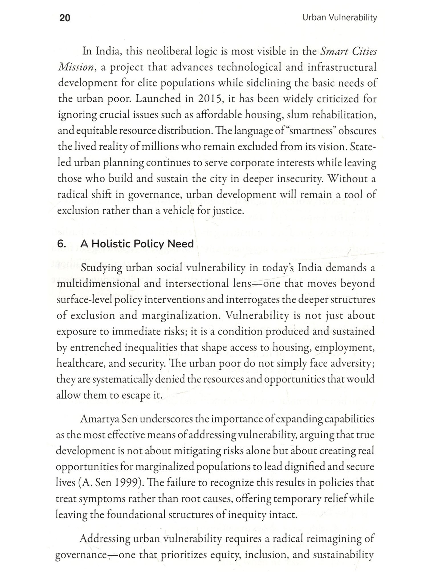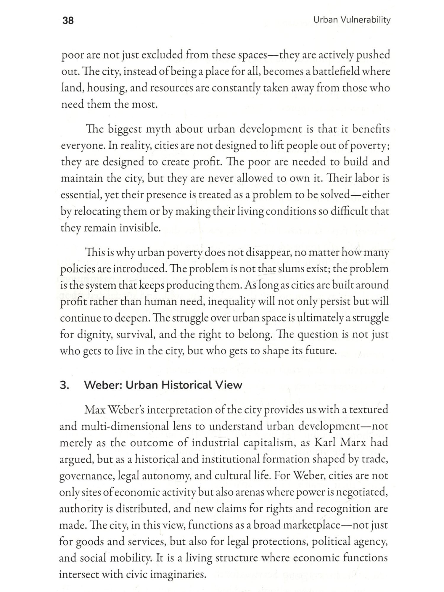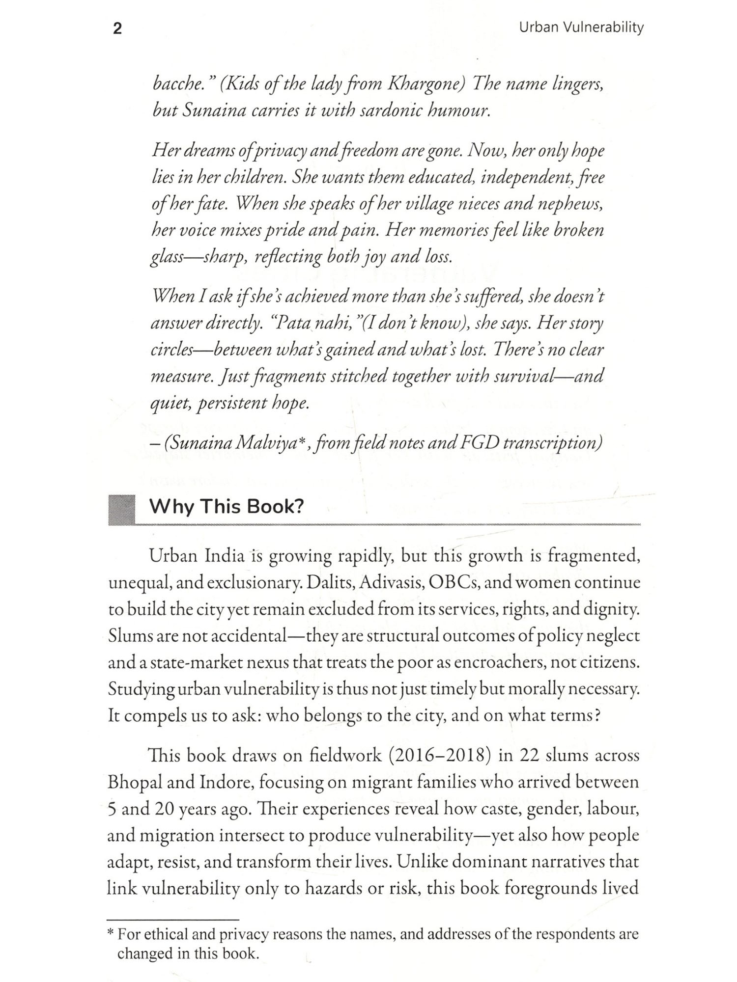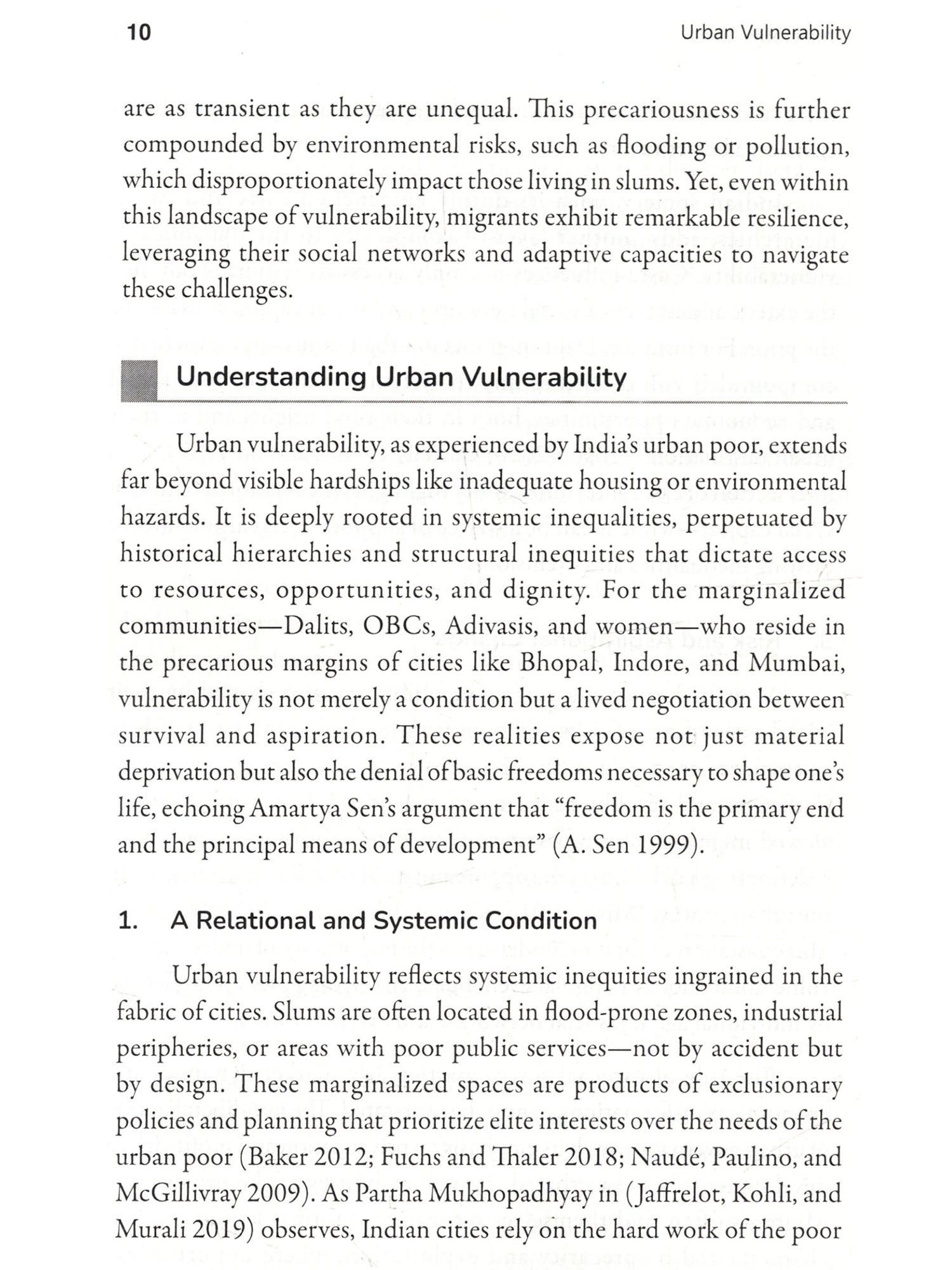 Cities are peculiar creations. They grow not just in their size but in their contradictions, feeding on human labour and aspirations, often offering promises that vanish like a mirage. This book, Urban Vulnerability: Inequality and Resilience in Indian Cities, is an effort to understand these contradictions-not by glorifying skyscrapers or highways, but by delving into the lives of those who struggle in their shadows. It journeys through the slums, where resilience battles despair, and dreams coexist with the harshness of reality. Indian cities are not just places; they are reflections of our society's deepest inequalities. They stand as stark mosaics-gleaming towers that symbolize progress and shanties that signify neglect. Between these extremes lies the true pulse of urban India: the lives of Dalits, OBCS, and the marginalized poor who have migrated in search of dignity and opportunity. For these individuals, the city is neither a destination nor an escape; it is a gamble-a deliberate choice to trade the constraints of rural life for the uncertain hope of something better. This book has been shaped by the voices of those who bear the burden of our cities on their shoulders. It is the story of women who. despite structural barriers, sustain their families with both labour and courage: of men who toil under the weight of inequality; and of children who turn rubble into playgrounds. These voices are not confined by academic definitions-they are raw, real, and brimming with insights into survival, resilience, and resistance. As I embarked on this work, I found myself unlearning many of the assumptions I carried. A slum is not just a sign of poverty-it is a Restament to survival, a space where the marginalized resist systemic oppression and create networks of solidarity. In these settlements, every.corner speaks of both vulnerability and creativity, Walls become testimonies of struggle, and even the most neglected drains reflect the ingenuity of human survival. This book is not simply an academic exercise, though it is informed by rigorous thought. Nor is it merely a collection of narratives, though these narratives form its soul. It is, above all, an attempt to place the lives of the urban poor at the centre of the discourse on urbanization. It challenges the blindness of policies that fail to see these communities as active participants in shaping our cities. It questions the morality of a society that builds progress on the backs of those it refuses to acknowledge. To write this preface is to honour those who inhabit the margins of our cities-not as victims, but as architects of their own lives. Their struggles, their resilience, and their unyielding spirit remind us of Dr. Ambedkar's assertion: "History shows that where ethics and economics come in conflict, victory is always with economics." Yet these individuals defy the grim determinism of economics by carving out spaces of dignity and hope amidst overwhelming odds. Let this book serve as a tribute to those who endure and resist. To those who dream of equality under the weight of caste and poverty. To those who find ways to create meaning in the most adverse conditions. And to those who, despite every hardship, persist in believing that another kind of city, and another kind of sociery, is possible.