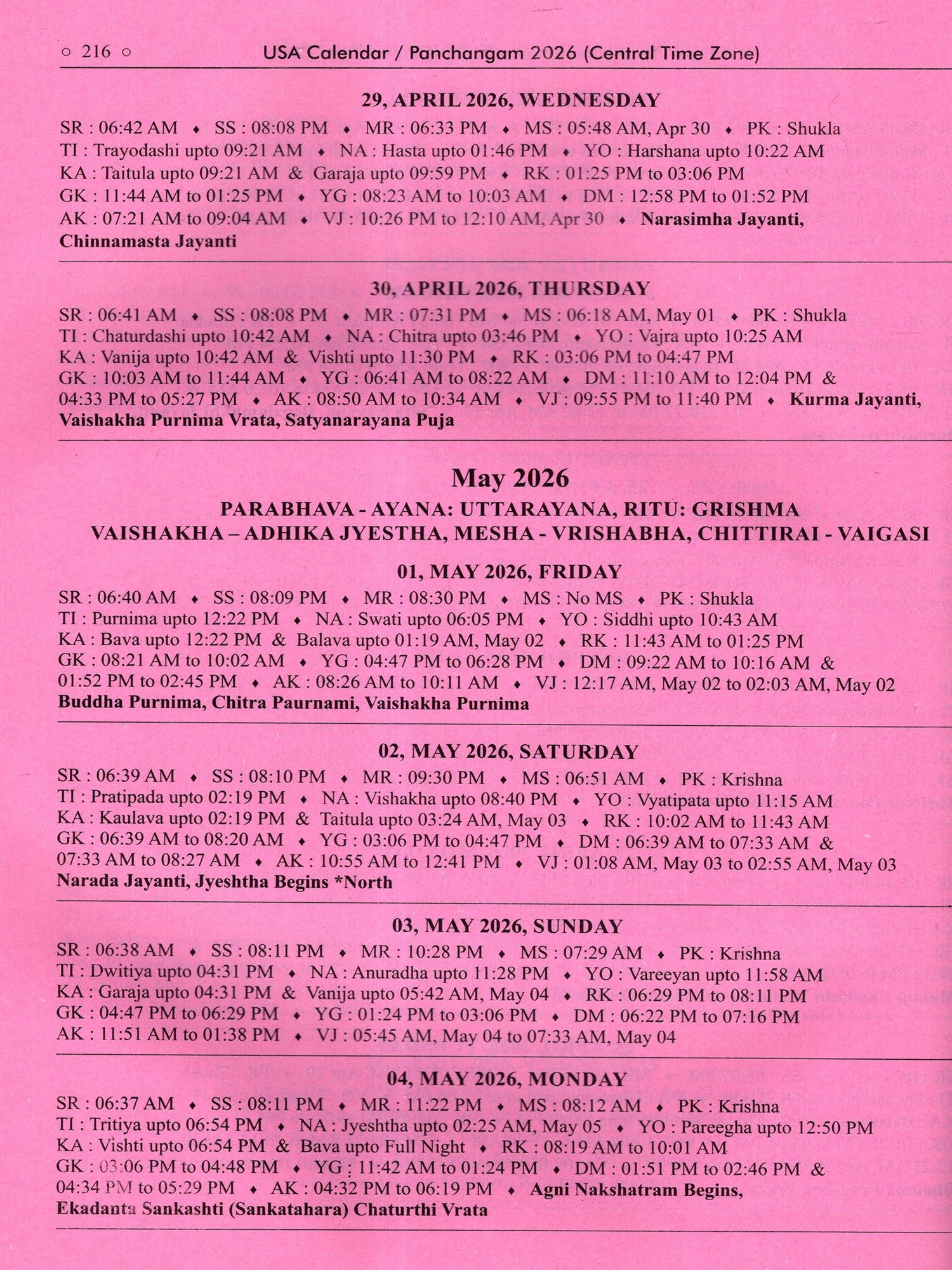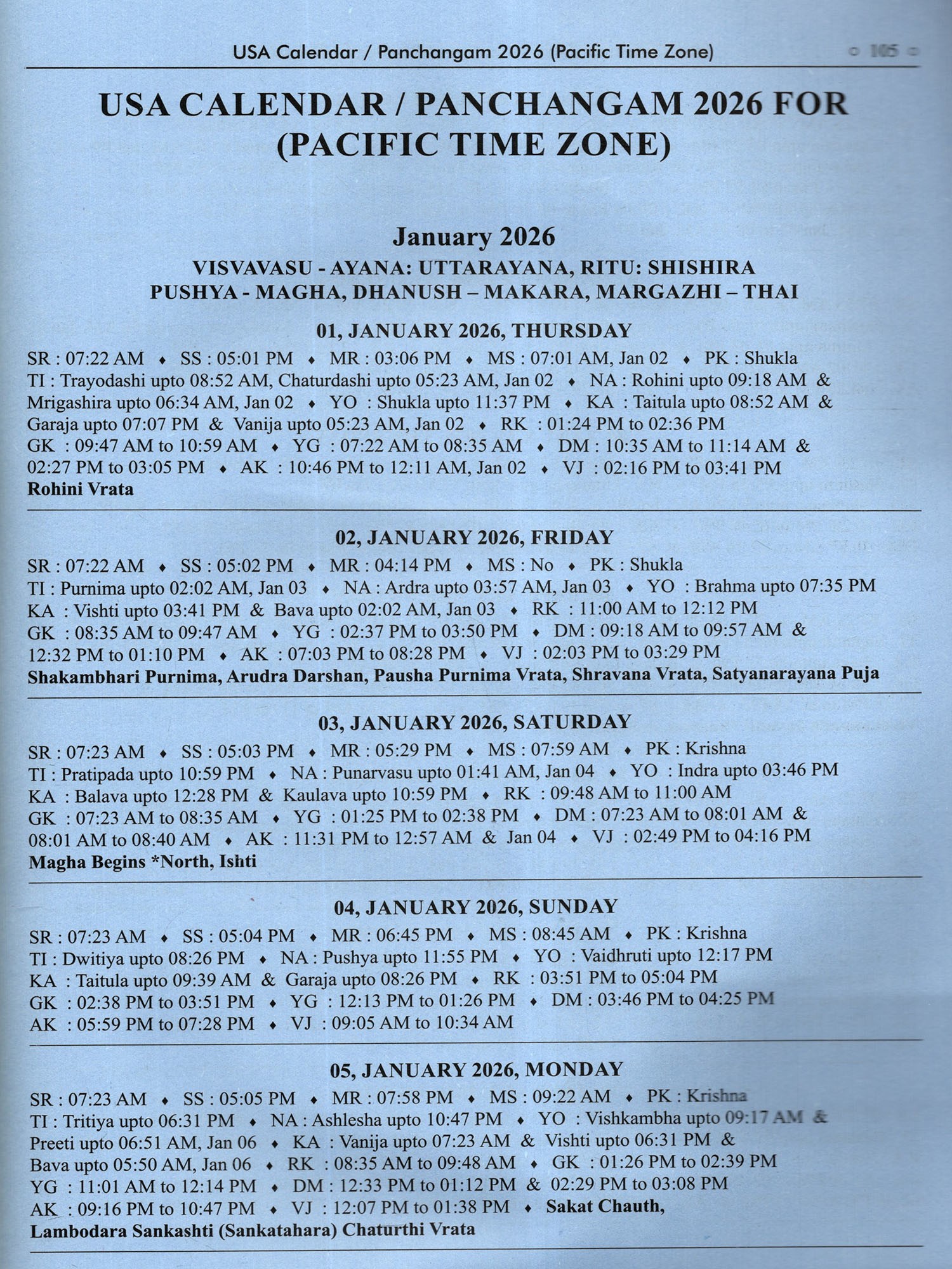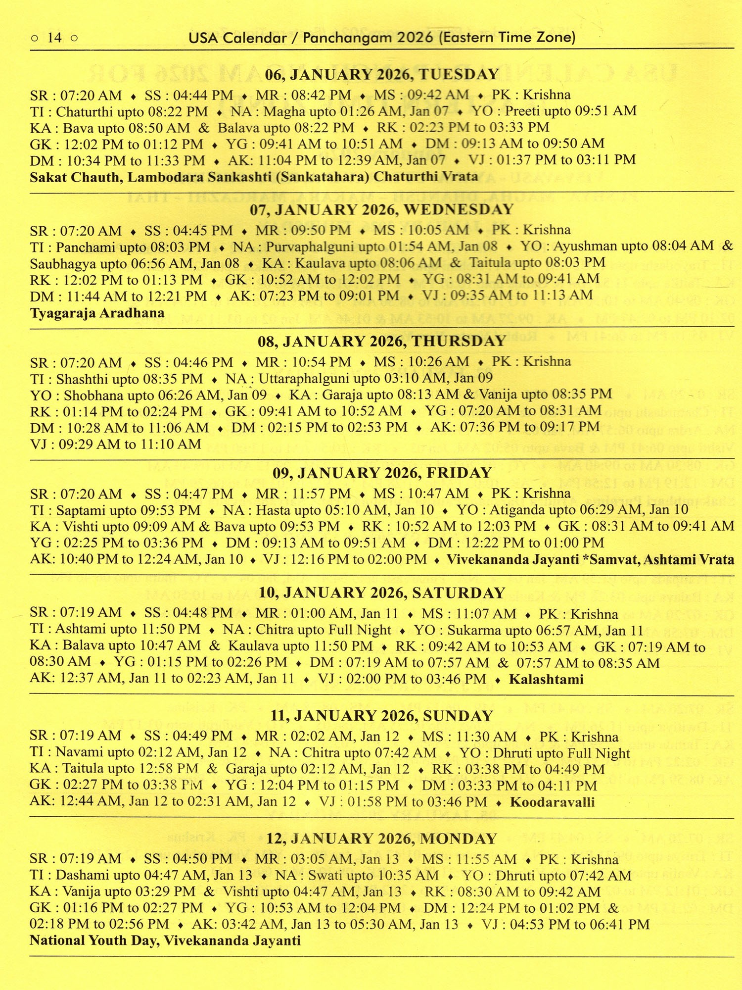 Usa Calendar-/Panchangam 2026 (Drik Ganita- Vishvavasu- Parabhava)