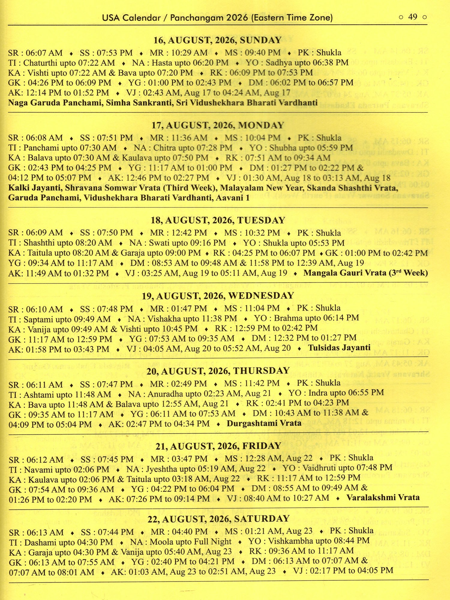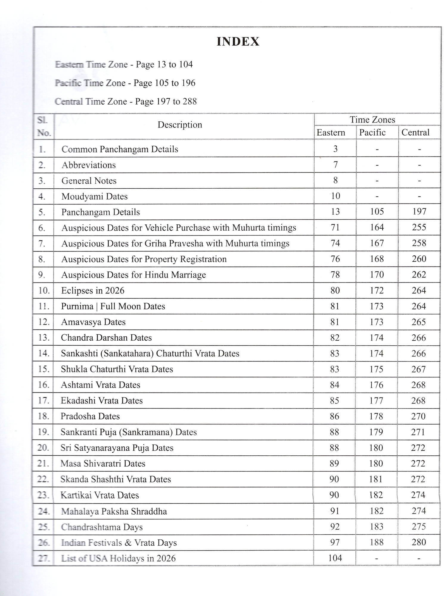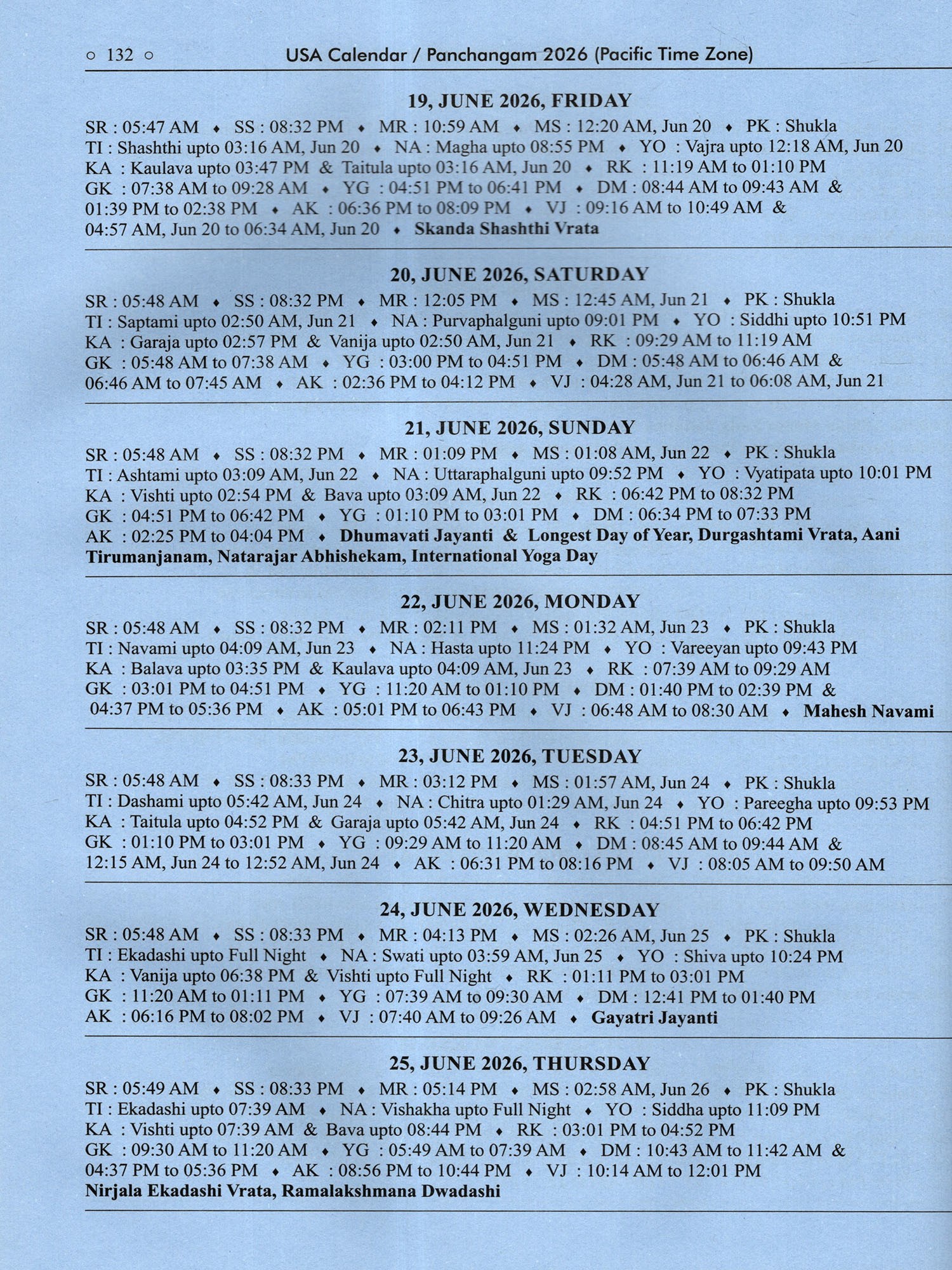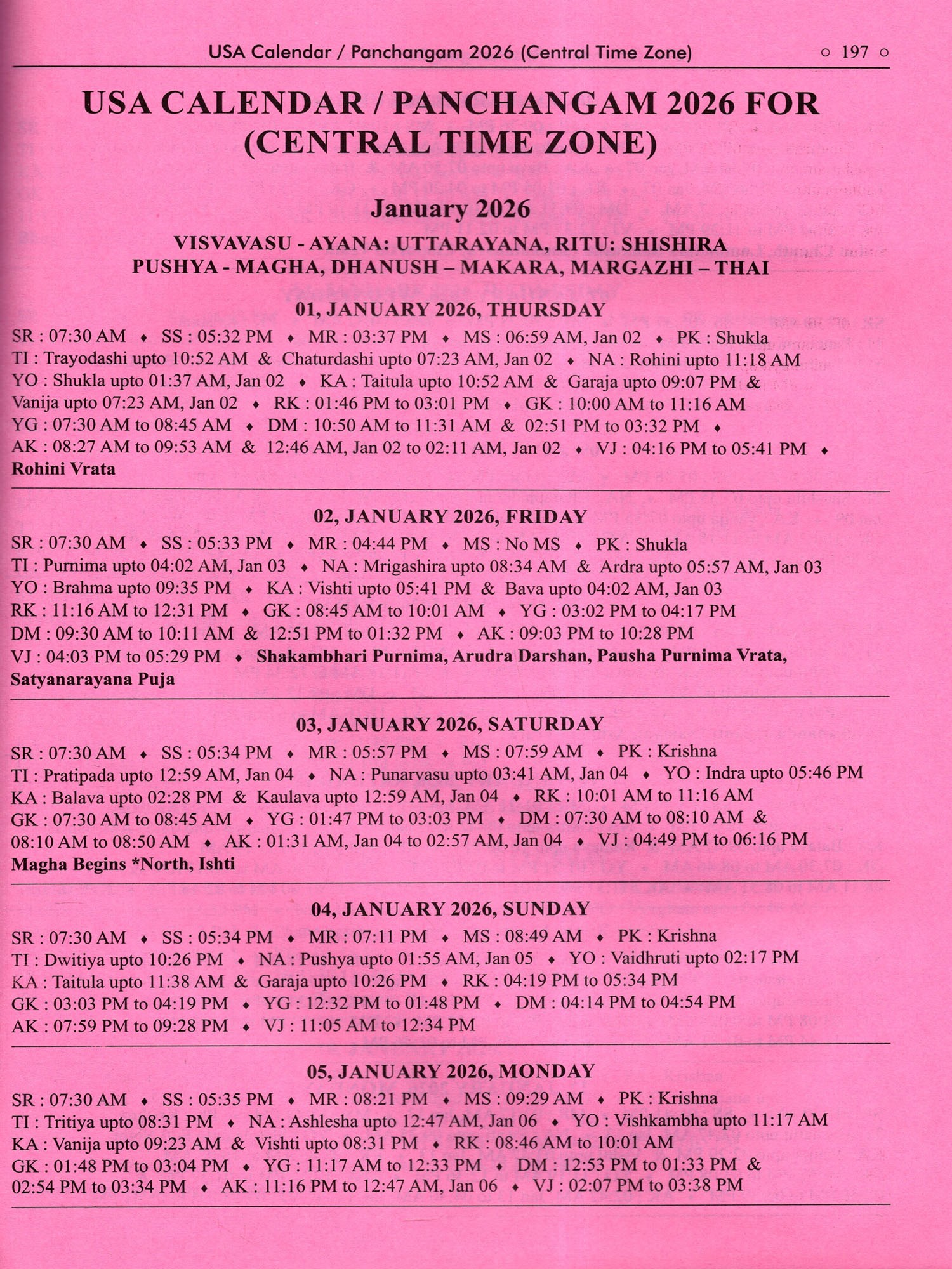 Usa Calendar-/Panchangam 2026 (Drik Ganita- Vishvavasu- Parabhava)