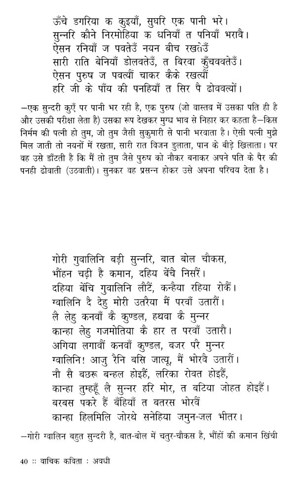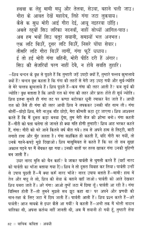 वाचिक कविता की दूसरी कड़ी में भोजपुरी के बाद अवधी का संकलन प्रस्तुत है। यह सत्य है कि भोजपुरी, अवधी, मैथिली, वघेली, कन्नौजी के संस्कार-गीतों के पाठ प्रायः एक जैसे हैं। कुछ सूक्ष्म अन्तर अवश्य हैं। वह अन्तर कुछ तो क्षेत्रीय हैं और कुछ नवोन्मेष के कारण हैं। 'वाचिक कविता: अवधी' संकलन में प्रयत्न यह किया गया है कि पुनरुक्ति कम हो और एक तरह से यह अवधी वाचिक कविता भोजपुरी की पूरक हो। वाचिक कविता इस मायने में विशिष्ट होती है कि उसकी विम्ब-योजना और सादृश्य-योजना में अपने ढंग का टटकापन तो होता ही है-जैसे 'दिया के टेम जरै छतिया' छाती दीपक की बाती की तरह जलती रहती है; या जैसे 'अँखिया त उनकै जैसे अमवा के फॅकिया ओठवन चुएला गुलाब'-उनकी आँखें जैसे आम की फाँक हों और होंठ ऐसे मानो उनसे गुलाब का रंग टपक रहा हो। विम्व साहचर्य के आधार पर एक-से-एक मनोरम और हृदयस्पर्शी चित्र जैसे यहाँ मिलते हैं वैसे लिखित काव्य-परम्परा में नहीं मिलते। प्रवास में रहने की अवधि को वे इस प्रकार मापते हैं कि प्रिय ने, जब उन्हें रेख उठी थी तो यह पेड़ लगाया था। उसी समय मुझे विवाह करके लाये थे। नीम का पेड़ फल-फूल गया, प्रवासी प्रिय नहीं आये।