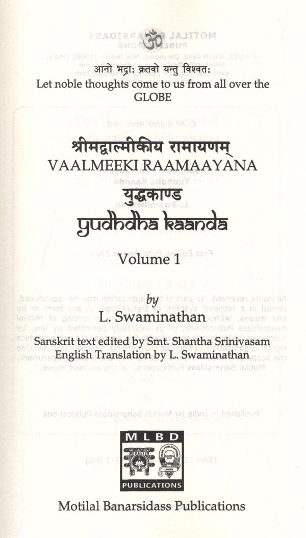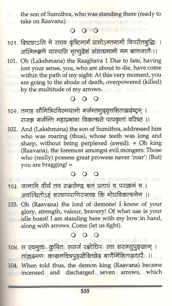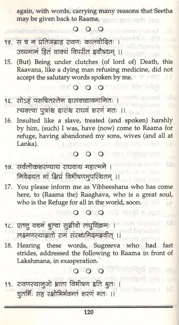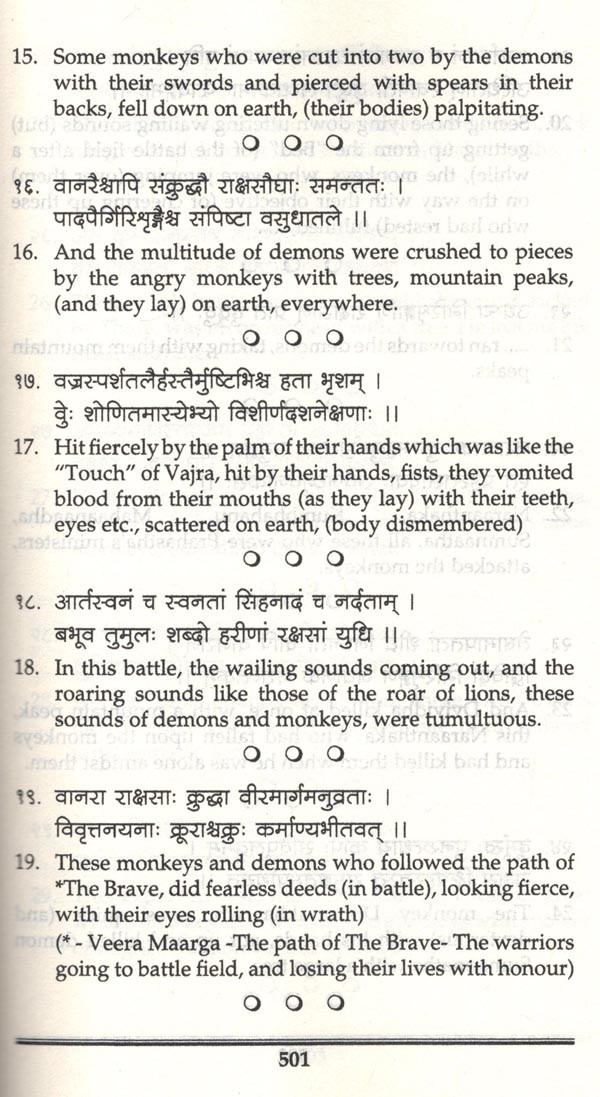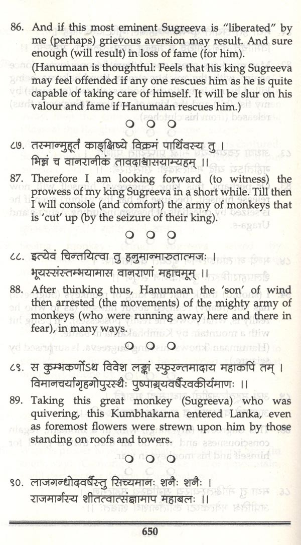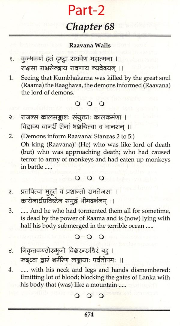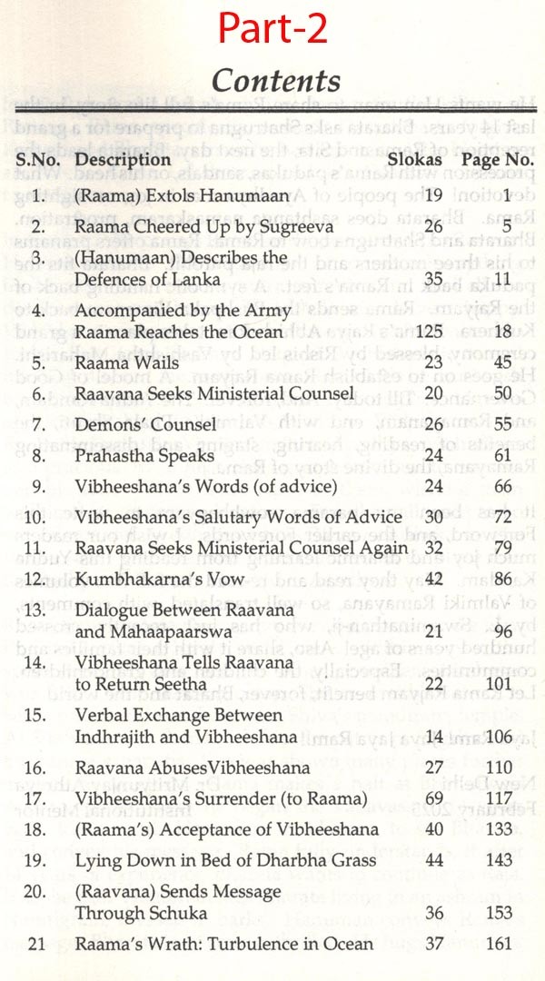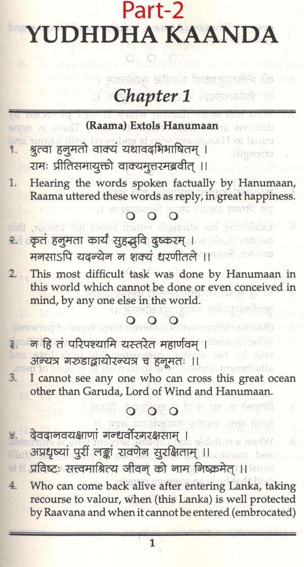 The Yudha Kandam is believed to be the last and final Kandam, written by Rishi Valmiki himself. Many scholars believe that Uttara Kandam was a later addition. Readers will recall that the previous Kandam, namely, the Sundara Kandam ends with the vanaras, monkeys, led by Angada, and guided by Hanuman, reporting to Rama and Sugriva, the joyous news of their journey, down south to the sagaram, ocean; and Hanuman leaping to Lanka; seeing Sita Ma, and returning safely.