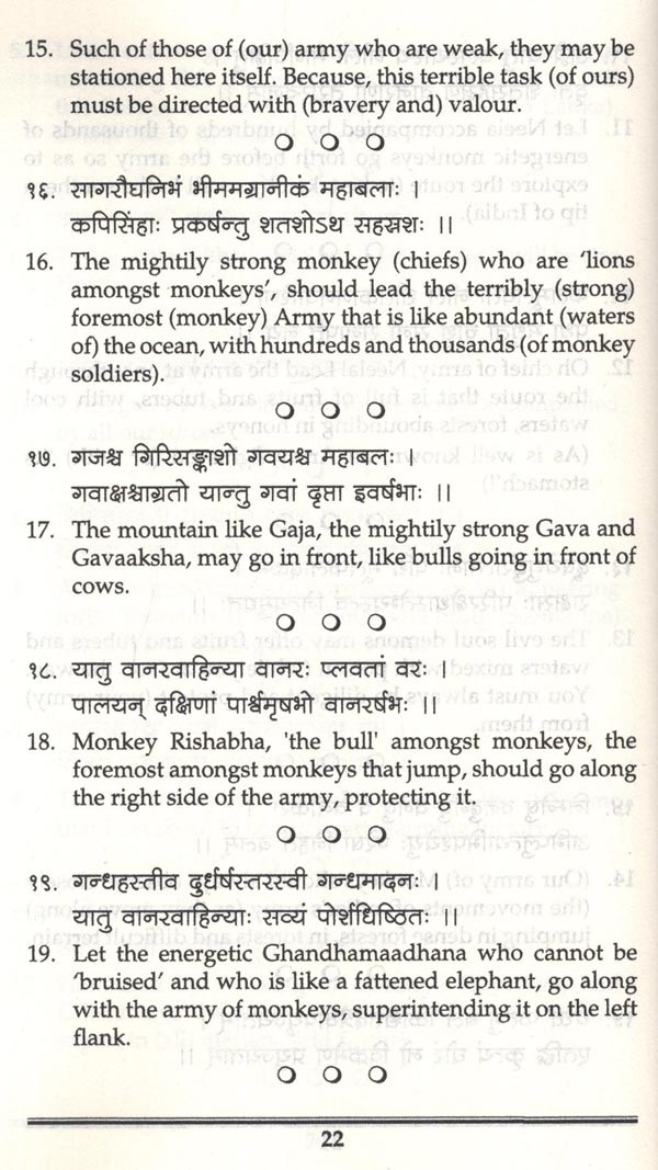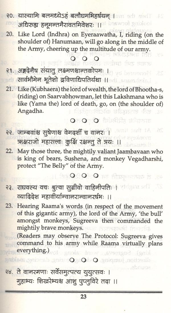 Avoid poisoned food offered by rakshasas. Rama suggests roles for different vanara leaders. Rama himself will ride on the shoulders of Hanuman. Lakshmana on the shoulders of Angada. Sugriva gives the formal orders. The vanara sena moves with great utsaham, enthusiasm. Valmiki gives a detailed description of the yatra, journey. Lakshmana assures Rama that he is going to soon kill Ravana, and return to prosperous Ayodhya, with Sita. Lakshmana points out several positive signs. His description is another example of Valmiki's encyclopaedic knowledge, including Astronomy. The sena was moving briskly. Not stopping for long anywhere. Keen to help Rama win the war and save Sita, as soon as possible. Valmiki gives a rapturous description of the land, lakes, hills, trees, plants, flowers etc. The sena reaches the ocean shores. Rama says the sena should rest. Be vary of any enemy actions. There is need to discuss a strategy to cross the sagaram. Valmiki, the Kavi, gives, as we expect, a gripping description of the sagaram, its waves, creatures, colours of the sky, reflected on its surface, etc.
