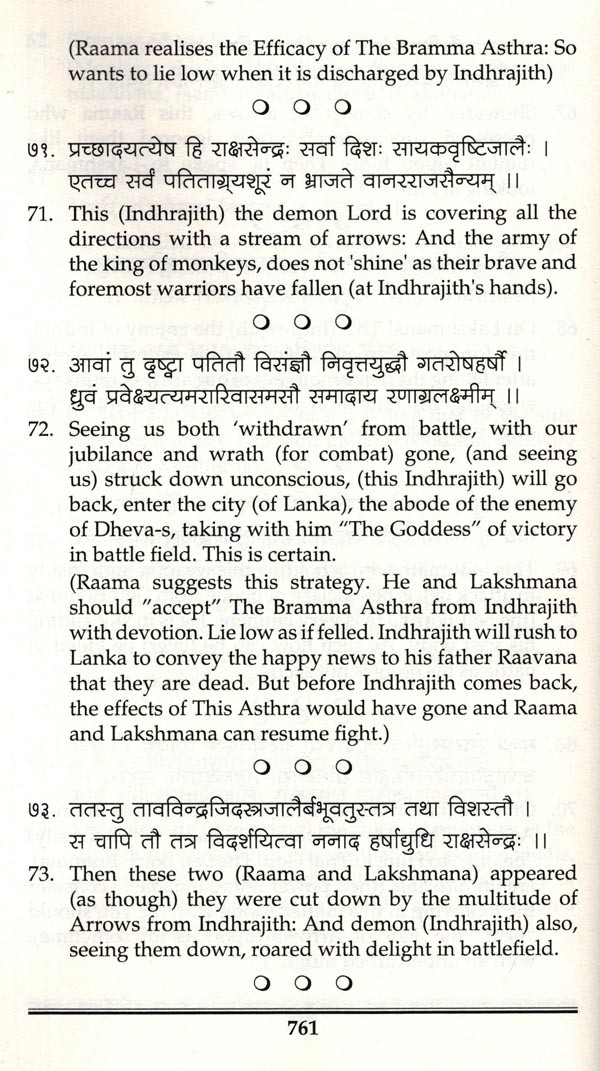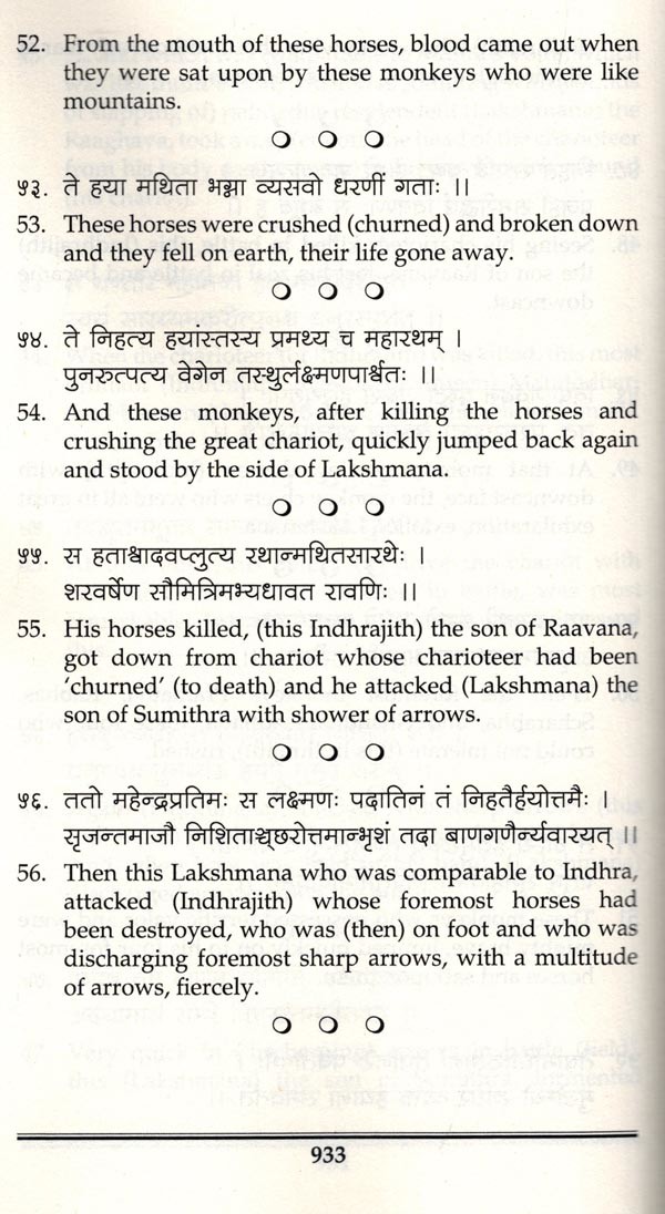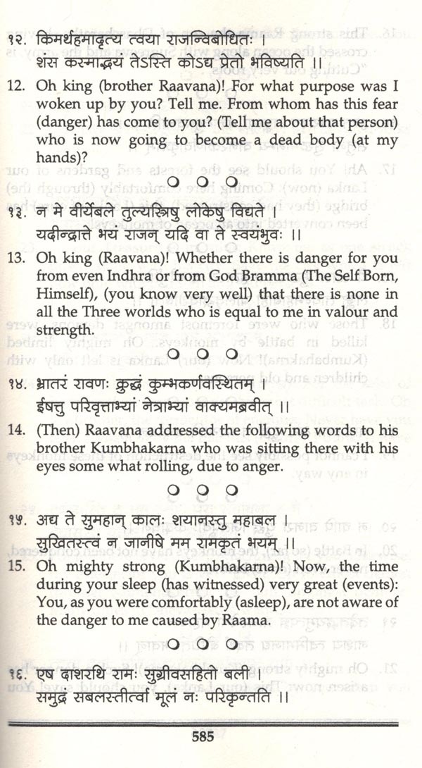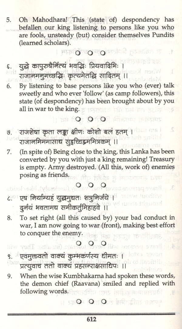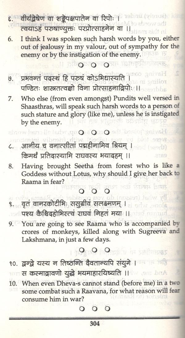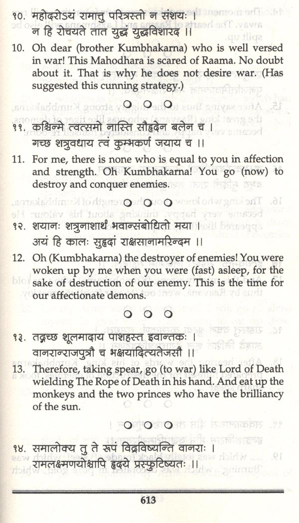 The Rakshasa, Demon ministers tell Ravana that his vishadam, dejection is unwarranted. They list the strengths of the Lankan army. They flatter Ravana, on his strengths and various past exploits over serpents in Bhogavathi, Kubera in Kailash, seizing the Pushpaka Vimana, his daughter Maya as his wife, and many more such conquests. Indrajit alone can beat Rama. The ministers commit the typical rajasic, arrogant error underestimating the adversary; and exaggerating one's own strengths. Some mantris apologise for their error in under estimating Hanuman. They vow to destroy the entire vanara jati! One even suggests that some of them will go to Rama, in manushya rupam, human form, and say that they have been sent by Bharata. Rama and Lakshmana will become emotional. Then, we destroy all of them! Such bravado goes on! Vinasha kale viparita buddhi! When disaster is impending, intelligence goes astray.