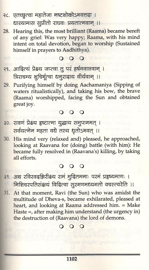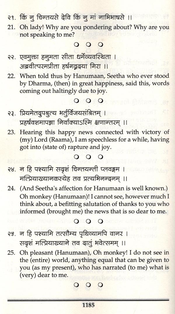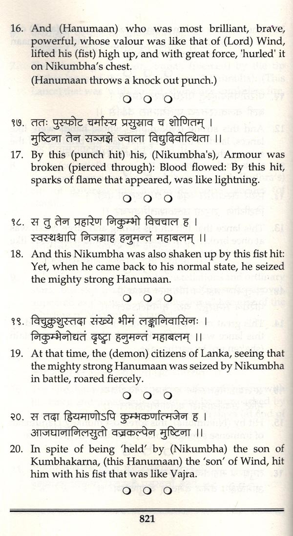 The Yudha Kandam begins, appropriately with Rama's praise of Hanuman. He has done a most difficult job. Nobody else, in the entire world can even conceive of such a task. Only Garuda and Hanuman can cross such a huge sagaram. Hanuman has also managed to survive all the risks, in the highly fortified Lanka, and return alive. A great service to his master Sugriva. He has also saved me, Lakshmana, and the Raghu Vamsam from apakeerti, disrepute, by finding Sita, devoted to Dharma. Rama is sad that he is not able to repay Hanuman. Rama gives Hanuman a warm aalinganam, hug.