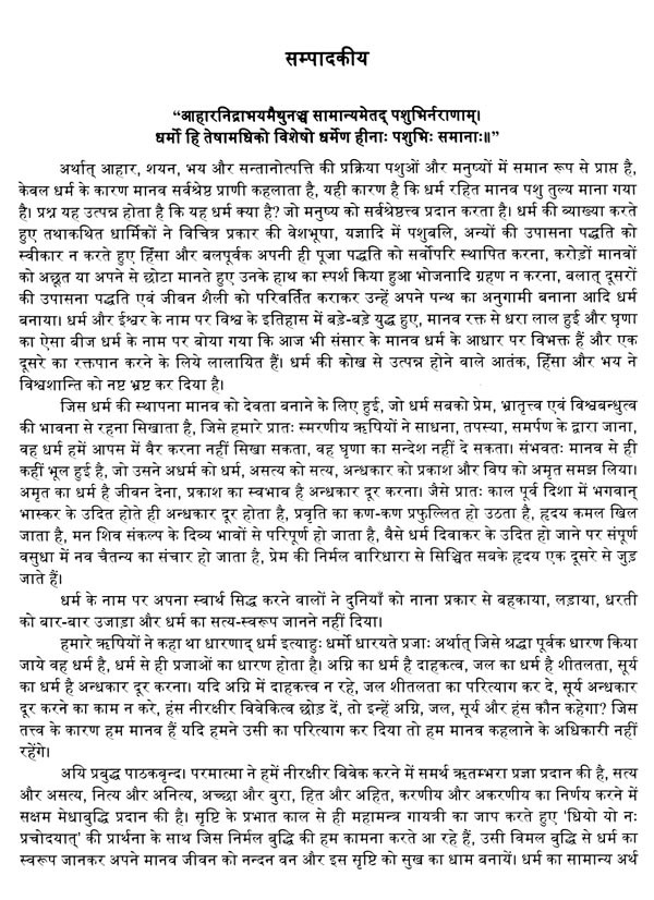 जिस धर्म की स्थापना मानव को देवता बनाने के लिए हुई, जो धर्म सबको प्रेम, भ्रातृत्त्व एवं विश्वबन्धुत्व की भावना से रहना सिखाता है, जिसे हमारे प्रातः स्मरणीय ऋषियों ने साधना, तपस्या, समर्पण के द्वारा जाना, वह धर्म हमें आपस में वैर करना नहीं सिखा सकता, वह घृणा का सन्देश नहीं दे सकता। संभवतः मानव से ही कहीं भूल हुई है, जो उसने अधर्म को धर्म, असत्य को सत्य, अन्धकार को प्रकाश और विष को अमृत समझ लिया। अमृत का धर्म है जीबन देना, प्रकाश का स्वभाव है अन्धकार दूर करना। जैसे प्रातः काल पूर्व दिशा में भगवान् भास्कर के उदित होते ही अन्धकार दूर होता है, प्रवृति का कण-कण प्रफुल्लित हो उठता है, है, हृदर हृदय कमल खिल जाता है, मन शिव संकल्प के दिव्य भावों से परिपूर्ण हो जाता है, वैसे धर्म दिवाकर के उदित हो जाने पर संपूर्ण वसुधा में नव चैतन्य का संचार हो जाता है, प्रेम की निर्मल वारिधारा से सिञ्चित सबके हृदय एक दूसरे से जुड़ जाते हैं।
