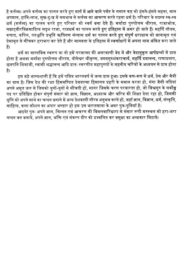 हम बड़े भाग्यशाली हैं कि हमें पवित्र भारतवर्ष में जन्म प्राप्त हुआ। इसके कण-कण में धर्म, प्रेम और मैत्री का वास है। जिस देश की रक्षा हिममण्डित देवतात्मा हिमालय प्रहरी के समान करता हो, गंगा जैसी नदियां अपने अमृत जल से जिसको युगों-युगों से सींचती हों, सागर जिसके चरण परवारता हो, जो विश्वगुरु के सर्वोच्च पद पर प्रतिष्ठित होकर संपूर्ण संसार को ज्ञान, विज्ञान, अध्यात्म और चरित्र की शिक्षा देता रहा हो, जिसकी धूलि को अपने माथे का चन्दन बनाने में अन्य देशवासी गौरव अनुभव करते हों, जहाँ ज्ञान, विज्ञान, धर्म, संस्कृति, साहित्य, कला कौशल का अपार भण्डार हो हम उस भारतमाता के अमर पुत्र-पुत्रियाँ हैं।