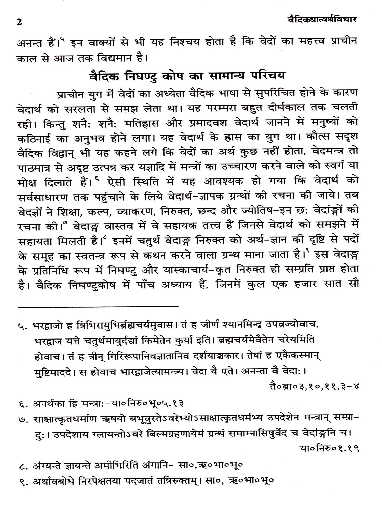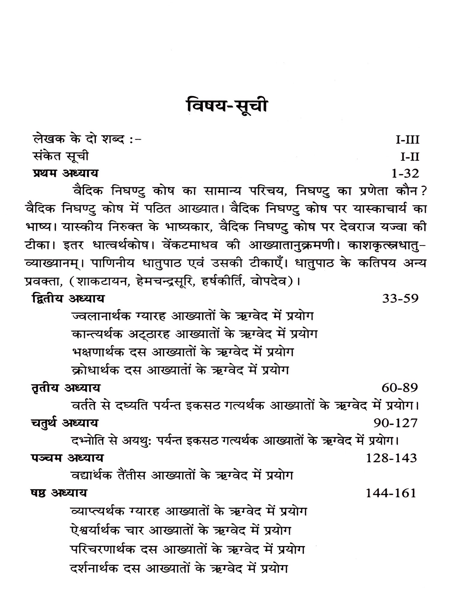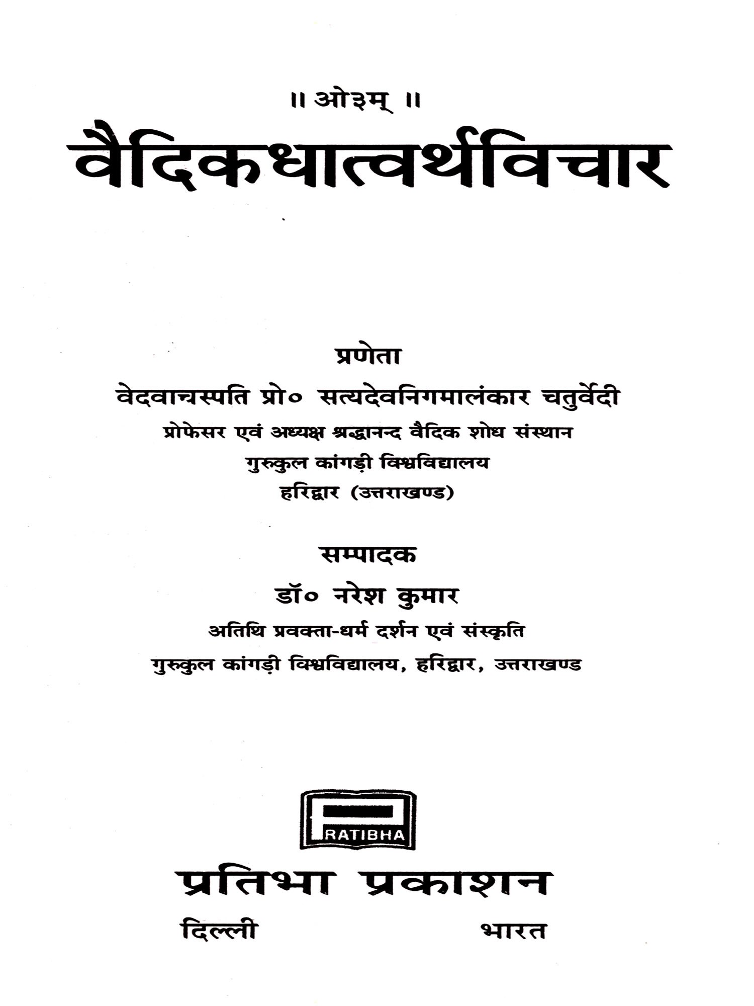 प्रस्तुत 'वैदिकधात्वर्थविचार' नामक ग्रन्थ में वैदिककोश निघण्टु में पठित सभी आख्यातों को आधार बनाकर ऋग्वेद के मन्त्रों के माध्यम से उनका अर्थदर्शन किया गया है। ग्रन्थ के प्रथम अध्याय में निघण्टु, निरुक्त तथा आख्यात सम्बन्धी विशेष चर्चाएँ हैं और द्वितीय अध्याय से अष्टम अध्याय तक वैदिक कोष निघण्टु में पठित ३१५ आख्यातों का ऋग्वेद में प्रयोग देखा गया है। जिनका क्रम यह है कि प्रथम आख्यात दर्शाया गया है, पुनः लौकिक धातुपाठ में उसे किस अर्थ में स्वीकार किया गया है, वह धातु तथा उसके अर्थ गृहीत किये गये हैं, इसके लिये मुख्यतः पाणिनीय धातुपाठ का आश्रय लिया है। कतिपय धातुएँ ऐसी भी हैं, जो पाणिनीय धातुपाठ में न होकर काशकृत्स्त्रधातुव्याख्यानम् अथवा अन्य धातुग्रन्थों में ही पठित हैं, वहाँ से वे दिखायी गयी हैं। लोक में वह धातु परस्मैपदी, आत्मनेपदी अथवा उभयपदी है-इस हेतु रूप दिये गये हैं। पुनः निघण्टु के उस आख्यात की ऋग्वेद में क्या स्थिति है, वे रूप हमने दिये हैं। उनमें से दो तीन, चार अथवा पाँच रूपों से सम्बन्धित मन्त्र देकर भाष्यकारों के द्वारा किये गये अर्थ से आख्यातार्थ को देखा है। कतिपय मन्त्रों का भाष्यकारों ने व्याकरणानुसार अर्थ कर दिया है, वहाँ हमें निरुक्त परम्परा का आश्रय लेकर अर्थ करना पड़ा है, जो वेदार्थ में उपयुक्त है।