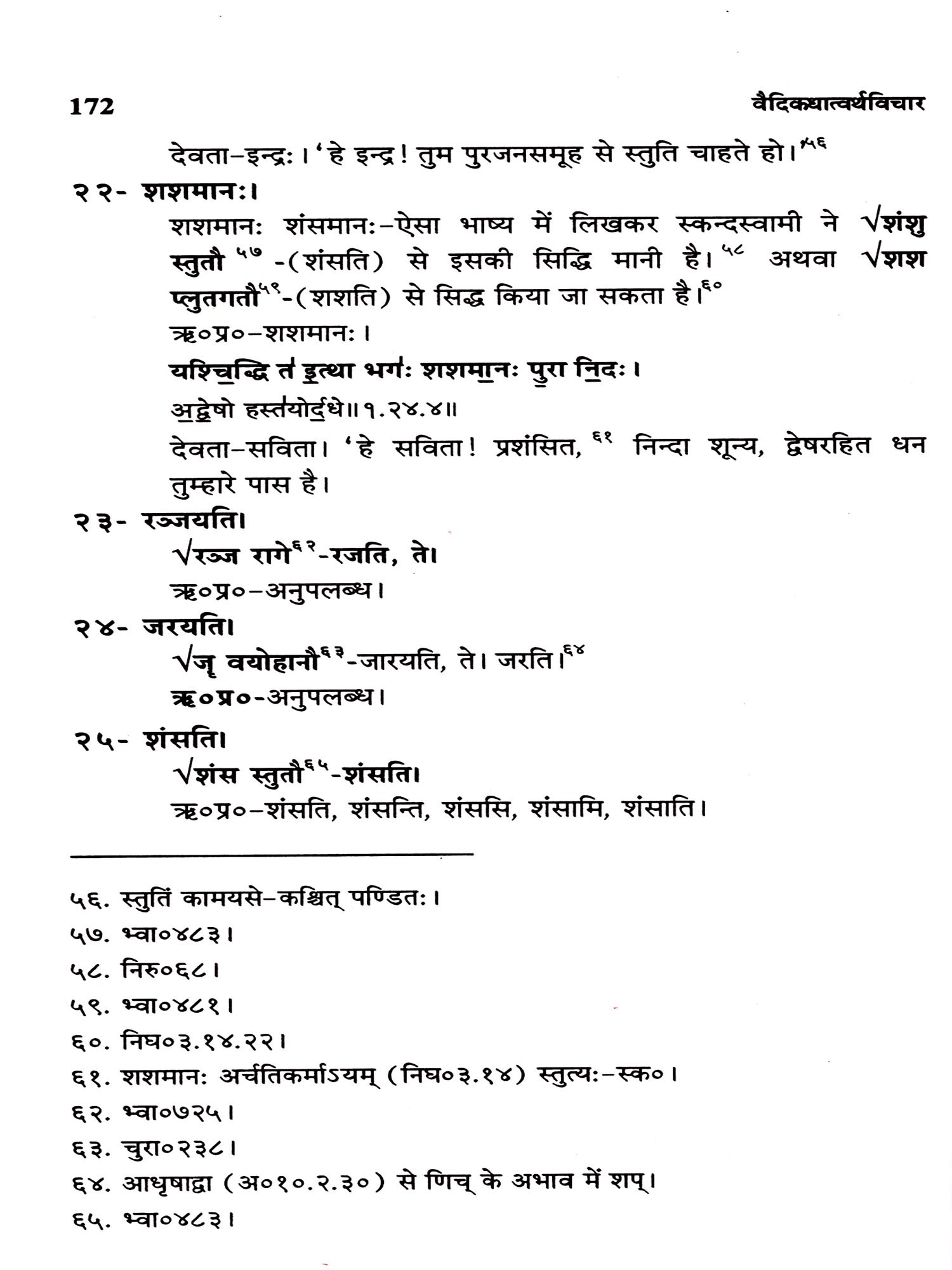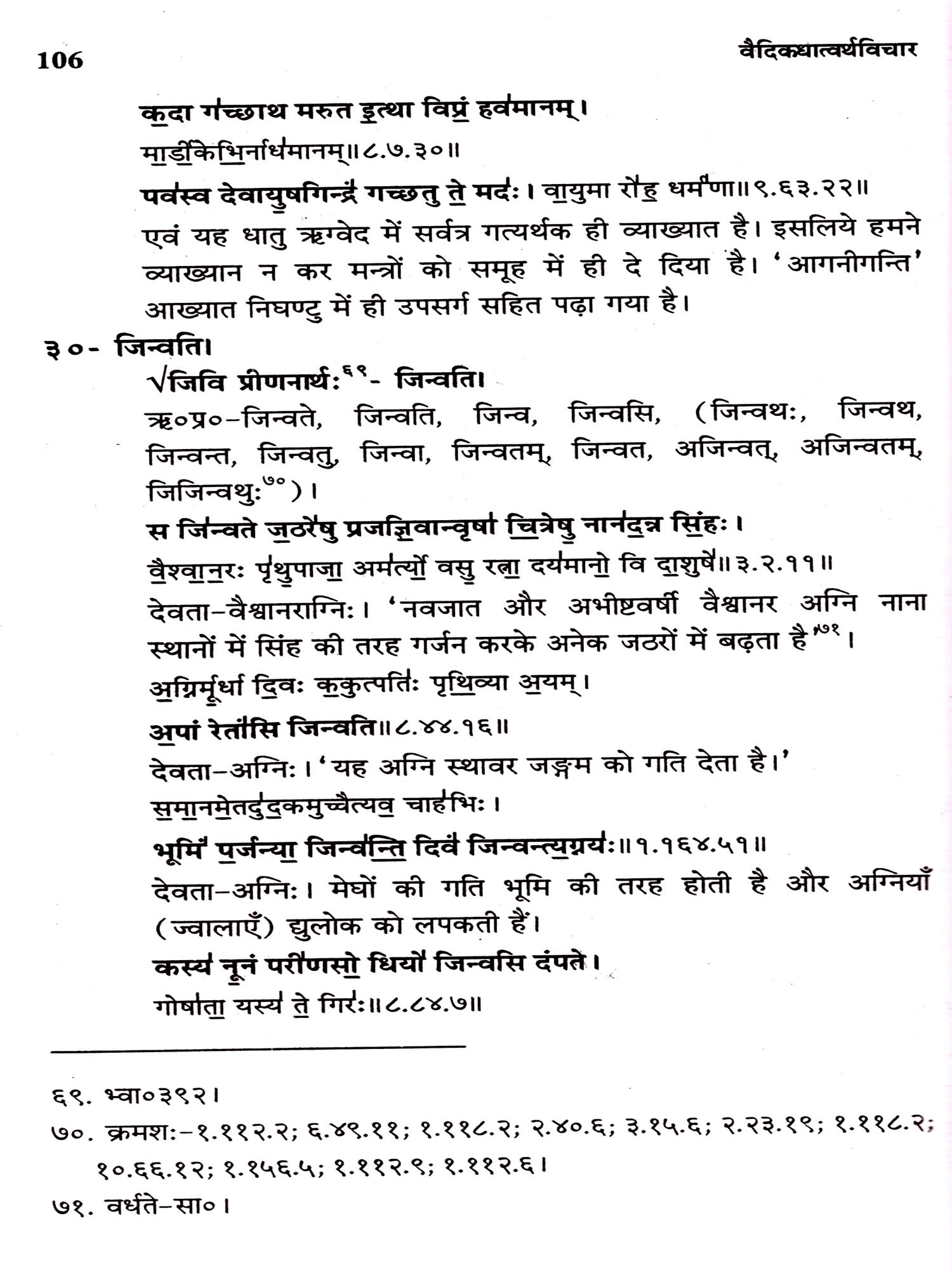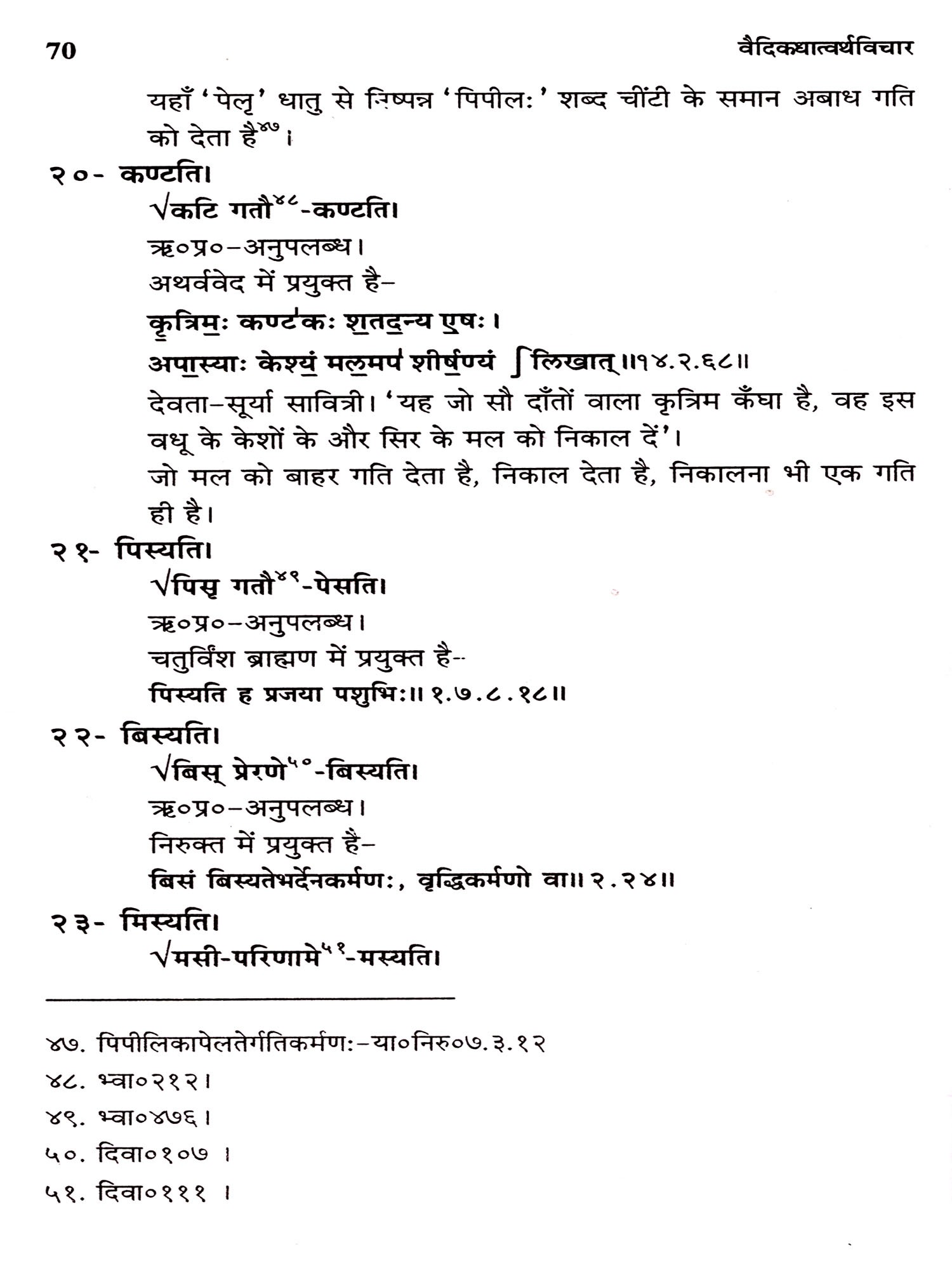 प्रस्तुत 'वैदिकधात्वर्थविचार' नामक ग्रन्थ में वैदिककोश निघण्टु में पठित सभी आख्यातों को आधार बनाकर ऋग्वेद के मन्त्रों के माध्यम से उनका अर्थदर्शन किया गया है। ग्रन्थ के प्रथम अध्याय में निघण्टु, निरुक्त तथा आख्यात सम्बन्धी विशेष चर्चाएँ हैं और द्वितीय अध्याय से अष्टम अध्याय तक वैदिक कोष निघण्टु में पठित ३१५ आख्यातों का ऋग्वेद में प्रयोग देखा गया है। जिनका क्रम यह है कि प्रथम आख्यात दर्शाया गया है, पुनः लौकिक धातुपाठ में उसे किस अर्थ में स्वीकार किया गया है, वह धातु तथा उसके अर्थ गृहीत किये गये हैं, इसके लिये मुख्यतः पाणिनीय धातुपाठ का आश्रय लिया है। कतिपय धातुएँ ऐसी भी हैं, जो पाणिनीय धातुपाठ में न होकर काशकृत्स्त्रधातुव्याख्यानम् अथवा अन्य धातुग्रन्थों में ही पठित हैं, वहाँ से वे दिखायी गयी हैं। लोक में वह धातु परस्मैपदी, आत्मनेपदी अथवा उभयपदी है-इस हेतु रूप दिये गये हैं। पुनः निघण्टु के उस आख्यात की ऋग्वेद में क्या स्थिति है, वे रूप हमने दिये हैं। उनमें से दो तीन, चार अथवा पाँच रूपों से सम्बन्धित मन्त्र देकर भाष्यकारों के द्वारा किये गये अर्थ से आख्यातार्थ को देखा है। कतिपय मन्त्रों का भाष्यकारों ने व्याकरणानुसार अर्थ कर दिया है, वहाँ हमें निरुक्त परम्परा का आश्रय लेकर अर्थ करना पड़ा है, जो वेदार्थ में उपयुक्त है।
