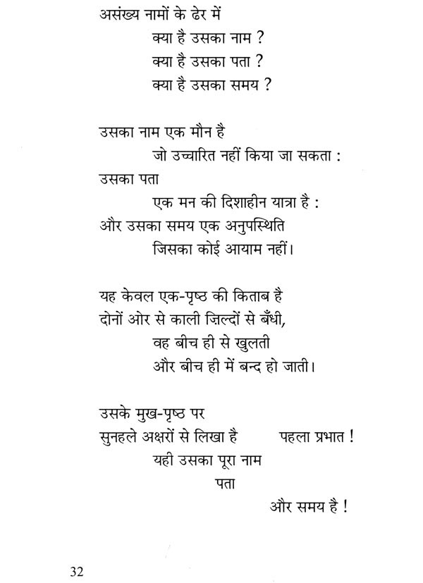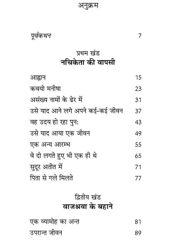 कृति में ऋग्वेद की कुछ सूक्तियों- उनकी गूँजों और अनुगूँजों-विशेषतः 'कः', 'हिरण्यगर्भ', 'पुरुष', 'नासदीय', 'सृष्टि', 'उषस्' आदि की स्पष्ट अस्पष्ट ध्वनियों को आसानी से पहचाना जा सकेगा। पहले भाग 'नचिकेता की वापसी' में जीवन के आह्वान और उदय को देखा गया है। दूसरे भाग 'वाजश्रवा के बहाने' में एक विदग्ध जीवन का सायंकाल है।