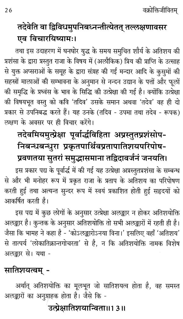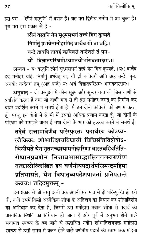 पूर्व में प्रकाशित वक्रोक्तिजीवित के प्रथम तथा द्वितीय उन्मेष के सम्पादन का कार्य गुरुवर आचार्य ओम नाथ बिमली ने किया था। अतः इससे निस्सन्देह कार्य की प्रतिष्ठा तथा उपयोगिता में वृद्धि हुई थी। आचार्य बिमली की गणना वर्तमान संस्कृत जगत् में व्याकरणशास्त्र तथा दर्शन के अग्रणी विद्वानों में की जाती है। वक्रोक्तिजीवित के प्रथम तथा द्वितीय उन्मेष के सम्पादन के पश्चात् आचार्य बिमली को वक्रोक्ति सिद्धान्त के विद्वान् के रूप में भी प्रतिष्ठा प्राप्त हुई है, ऐसा गत वर्षों में हमारा अनुभव रहा है। इस बार विभागाध्यक्ष होने से अत्यधिक व्यस्तता के कारण सम्पादक के रूप में मुझे प्रत्यक्ष आशीर्वाद भले ही न मिला हो, परन्तु निरन्तर उनका दिशानिर्देश मुझे इस कार्य में भी प्राप्त होता रहा है। अतः यह पुस्तक मैं आचार्य ओम नाथ बिमली के करकमलों में समर्पित करता हूँ। मुझे आशा है कि यह पुस्तक विशेष रूप से संस्कृत काव्यशास्त्र के जिज्ञासुओं तथा विद्यार्थियों के लिए अत्यन्त उपयोगी सिद्ध होगी। समय-समय पर मार्गदर्शन के लिए आचार्य गिरीश चन्द्र पन्त, आचार्य जगदीशप्रसाद सेमवाल, आचार्य ओम नाथ बिमली, आचार्य भारतेन्दु पाण्डेय, आचार्या मीरा द्विवेदी, डॉ० साधना कंसल तथा डॉ० सारिका वाष्र्णेय का हृदय के अन्तस्तल से आभार।