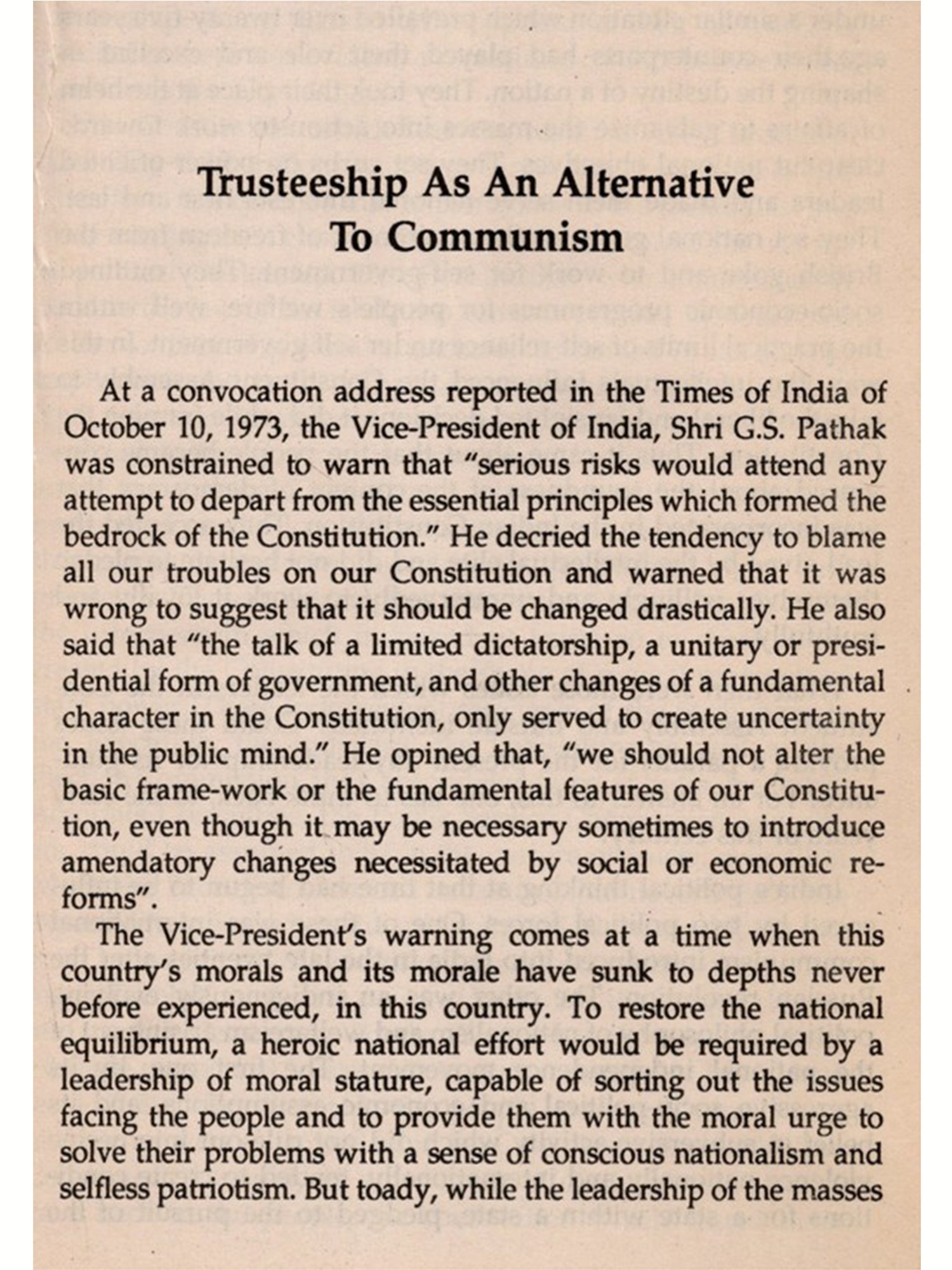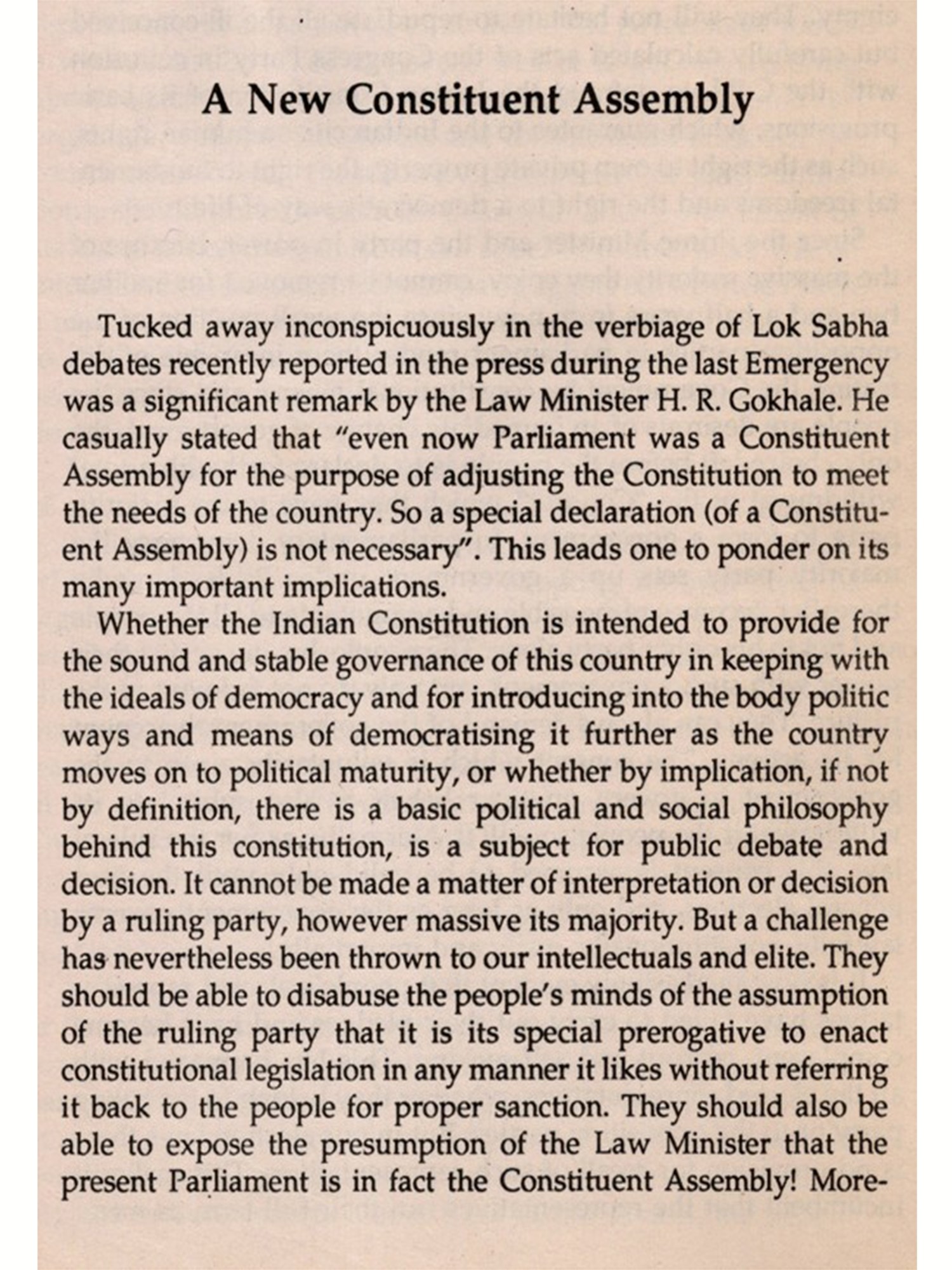 An apology is needed for the publication and distribution of this little pamphlet. For, the material contained in it, is not anything fresh or new. It is based on the author's contributions published over the years, through the Emergency resting with 1981. Most of them have appeared in the Radical Humanist of which Justice Tarkunde was the then Editor, while the rest of them are from the author's own book "A Political Dissenter's Diary" published in 1978. During those years the author had occasion to collaborate with Justice Tarkunde in the then Human Rights and Civil Liberties Movement to set up the Citizens for Democracy and People's Union of Civil Liberties organisations in Madras and Pune respectively. It was the intention of the author to bring out this pamphlet much earlier. But the hectic events of almost a year delayed its printing. The author however feels that the thoughts and ideas are still not outdated and can have relevancy, in the present changed situation in which this country finds itself. Also, the author feels that the youth of today might find the contents useful to help to clear their minds on many of the political happenings of late. Perhaps, in the public debate that is presently going on in the media on the Constitution, the Constituent Assembly and Parliamentary Democracy, the contents in this pamphlet may make some useful contribution.
