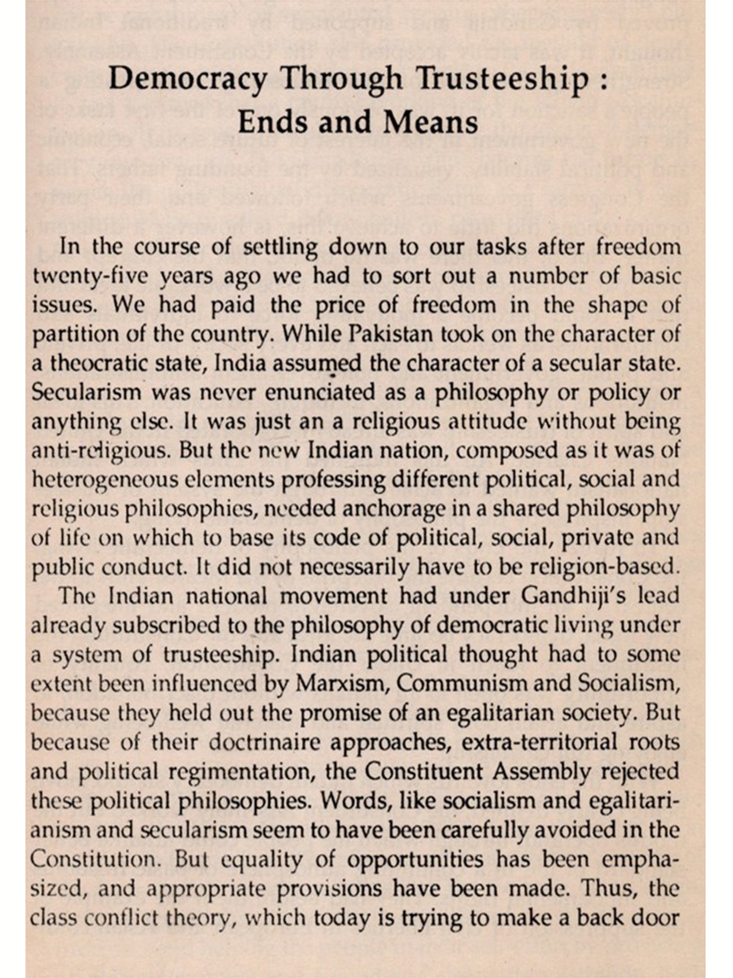 4. What is forgotten by all those concerned in all these political manoeuvring is, that the Indian Constitution so ably drafted by its authors, is a self-contained document ensuring guiding and helping to build a welfare State. It has no parallel to it in any of the world's democracies-east or west. It cannot be improved upon by off and on nibbling at it. This Constitution is there for India, for all her peoples, for all time. After kingship ended, the Constitution became King. But sad to state, that in the process of the recent political manoeuvring in the race for power and personalised politics, the major political parties have failed to project in their manifestos, how they propose to realise the national goals defined in the Constitution and how they will educate the new generation of young voters that it is the Constitution that is supreme and will stand by them to help them overcome the problems arising out of the great changes taking place both nationally and internationally today.