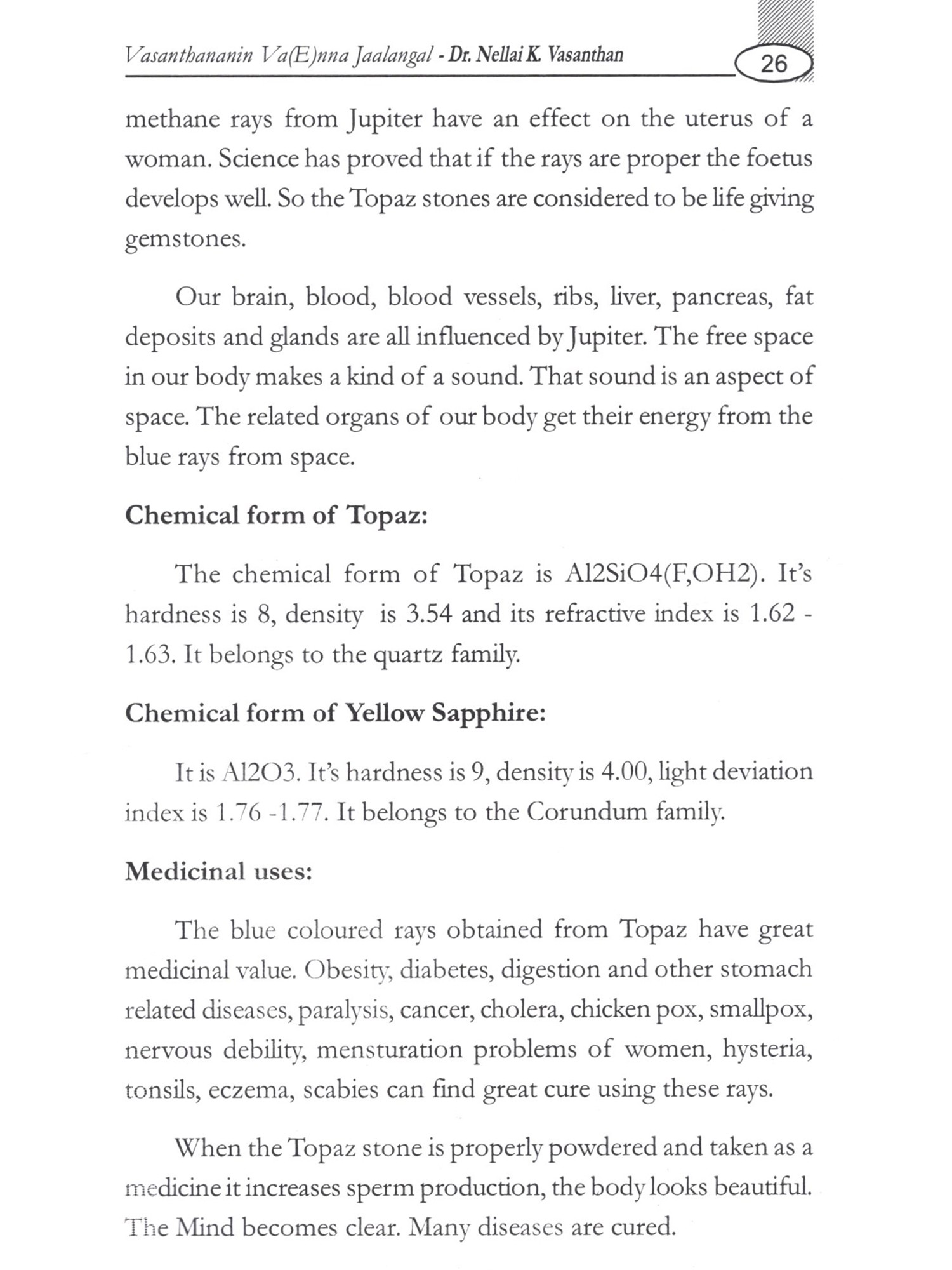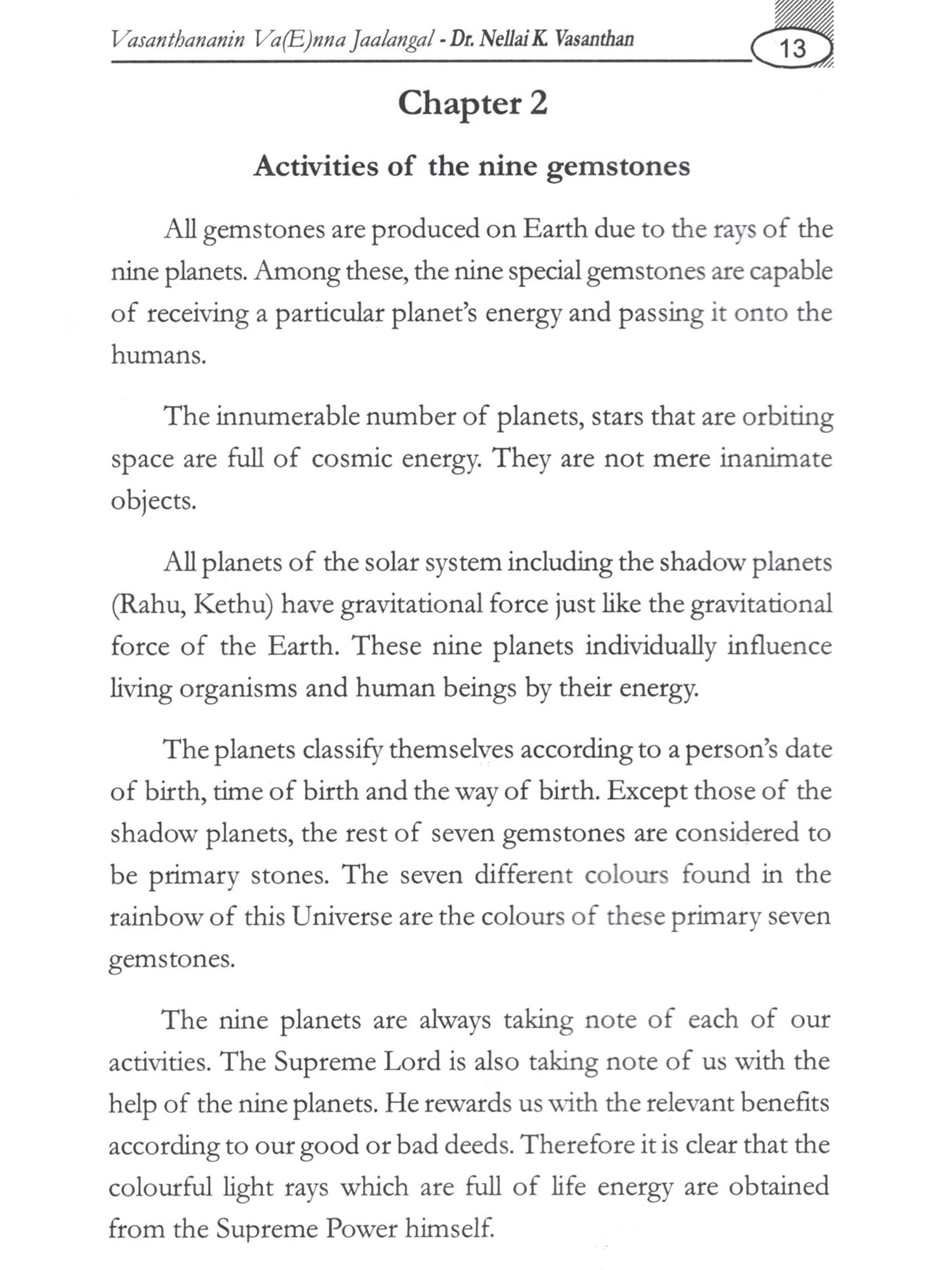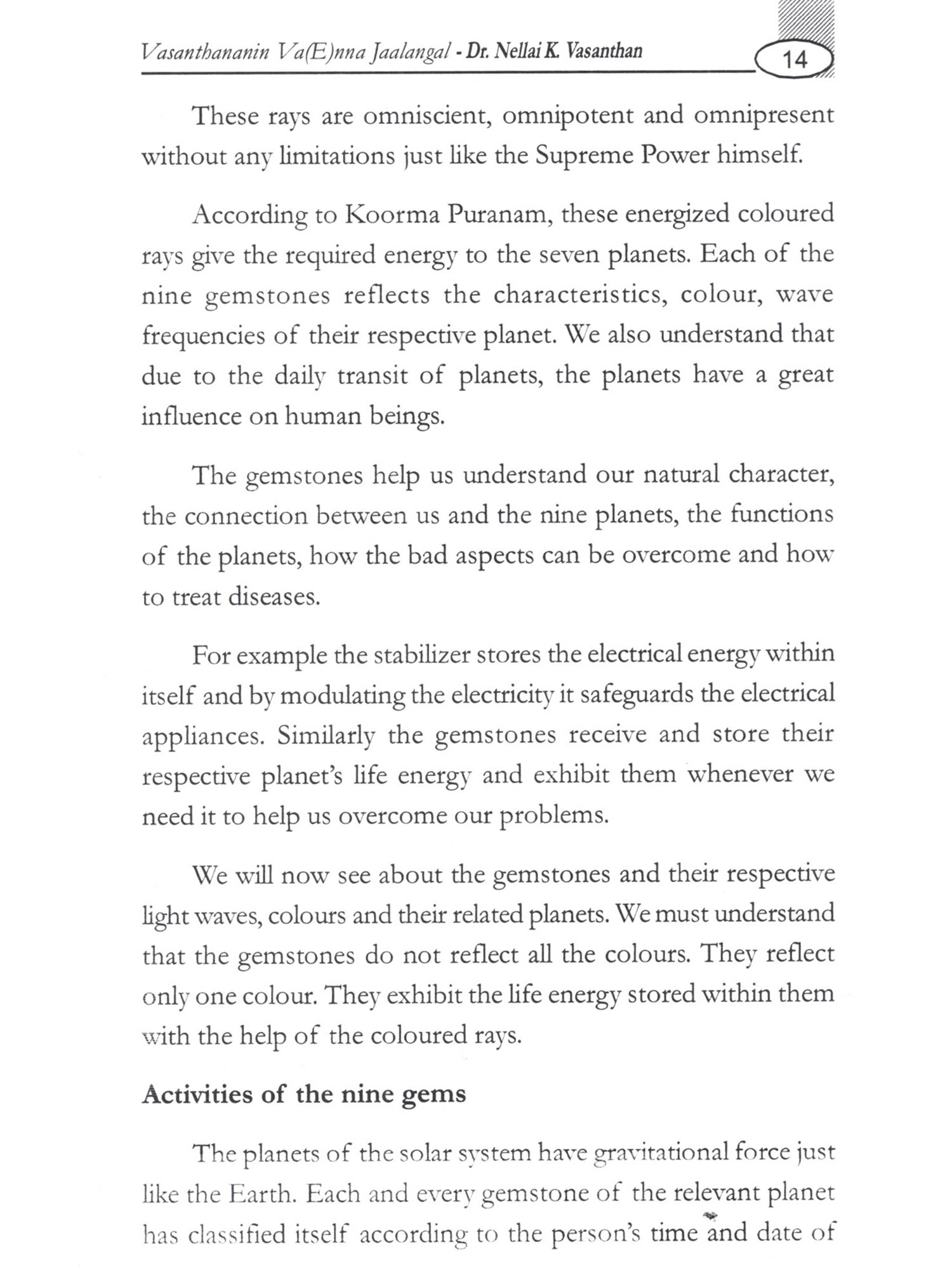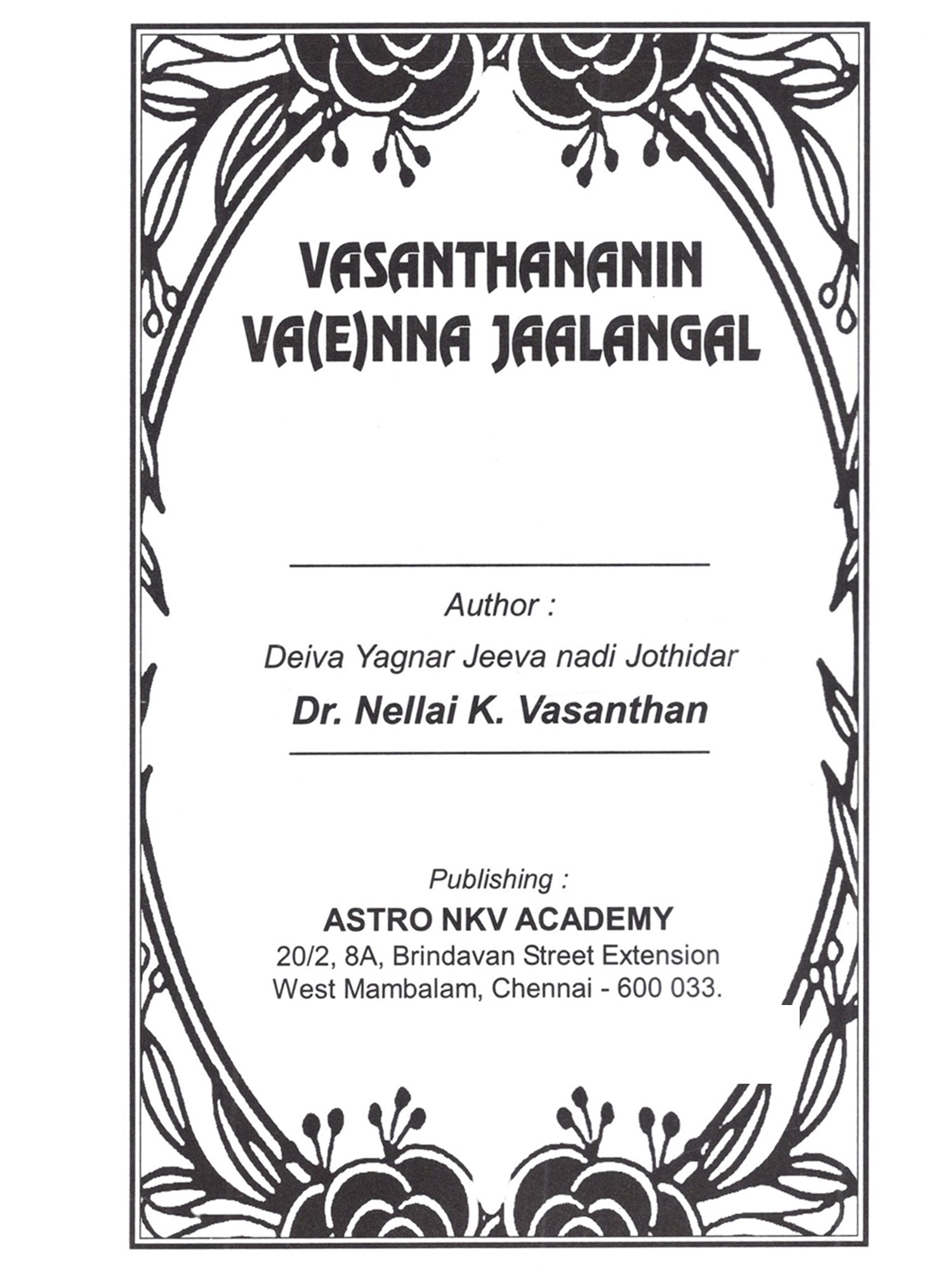 "Jothida Alangaram" Dr. Nellai Vasanthan is known for his unique way of approaching Astrology by saying even gods are controlled by planetary positions. N.K.V System is a modern art of Astrology and research which gives us simple and effective remedies for the welfare of human life. After many years of research, Dr. Nellai K Vasanthan compiled his knowledge and wisdom in the book "Jothida Alangaaram" which includes "To find ones career or business", "To find who can be-come an astrologer", "Planets related to flight accidents" and "To find who have credit card dhosham" "Jothida Alangaaram" is one of the masterpieces of Nellai K Vasanthan. N.K.V System has the most simple and unique way of remedies using ribbon, groceries, bamboo sticks, metals, and meat. This system can also be used to predict the future through Aadhar cards and Cash Prasanam. This system specifies in-name astrology of a particular horoscope of a person and their surroundings.