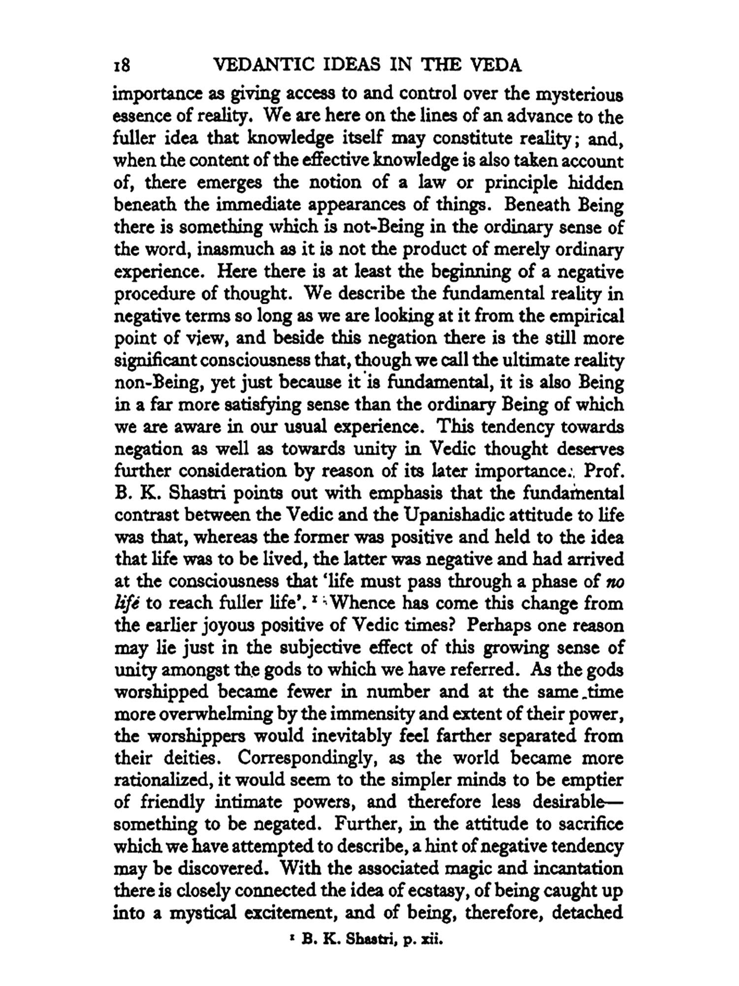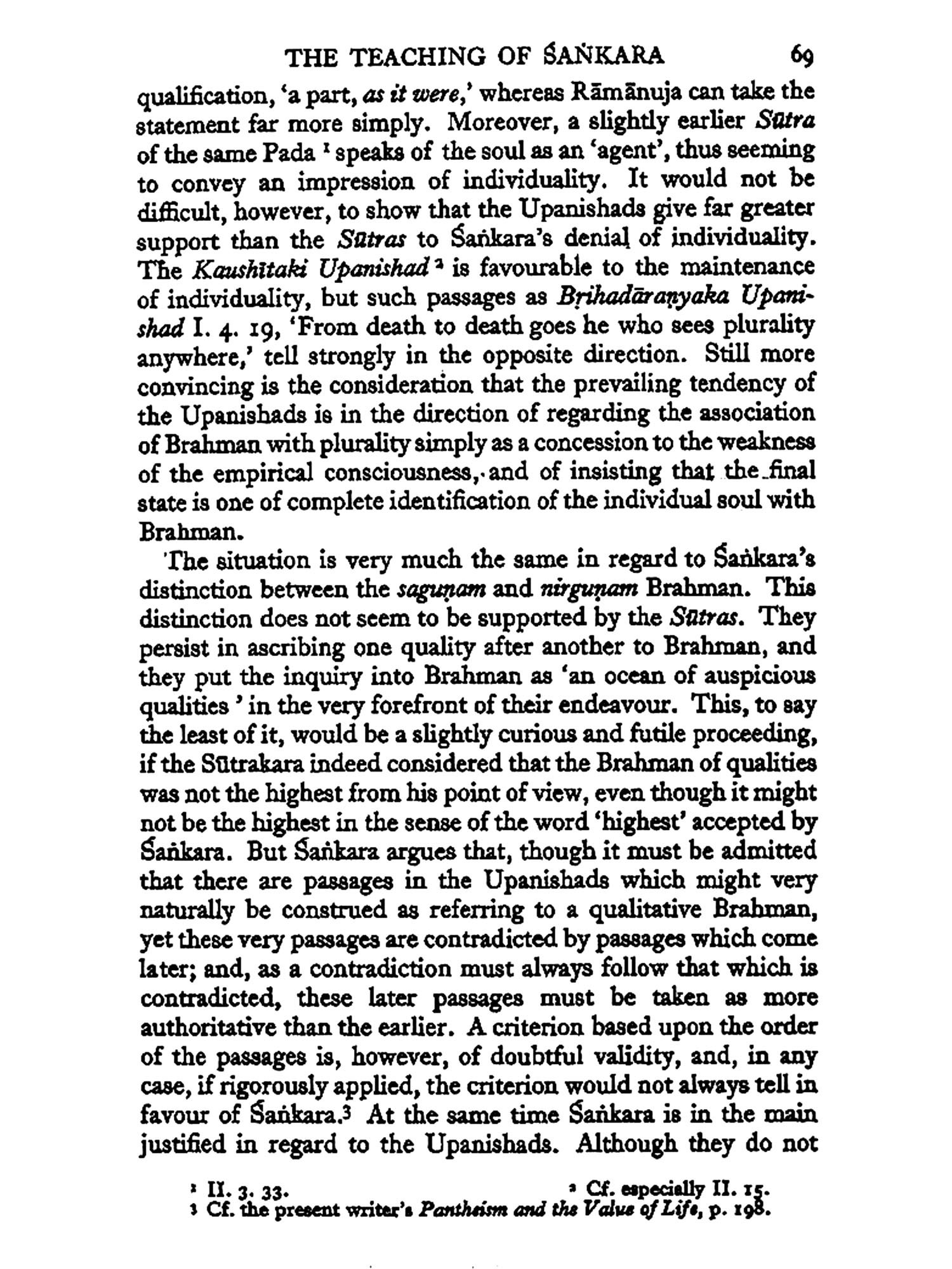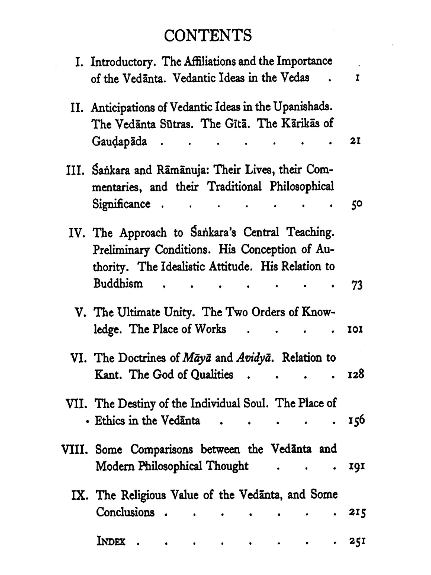 A study of the Vedanta leads to many general reflections on the relations between philosophy and religion, and in particular to the questions how far such a philosophy can satisfy religious needs and how far it can be regarded as a preparation for Christianity. I have tried to set forth some conclusions as to these and allied problems. Sankara has been taken as the typical philosopher of the school, for reasons which appear to me to be satisfactory; and the general trend of opinion amongst Indian writers and thinkers themselves would appear to justify this concentration. It has been my endeavour to carry out my task in a spirit of fairness, and to avoid the mistake of merely working towards a foregone conclusion. And I have no hesitation in saying that such studies as I have been able to make in Indian philosophy have confirmed me in the faith that God has not left Himself without a witness in the characteristic thought of India, that much of it is unconsciously anticipative of Christian thought, and that Jesus Christ will one day be recognized there also as the 'light which lighteth every man that cometh into the world'.
