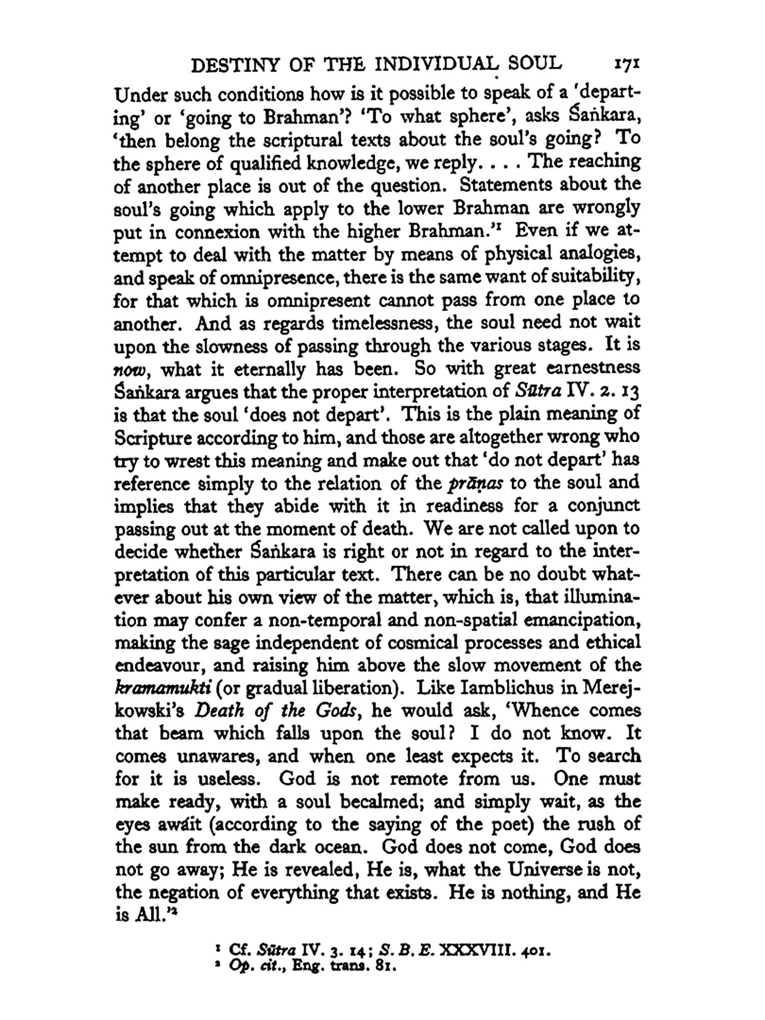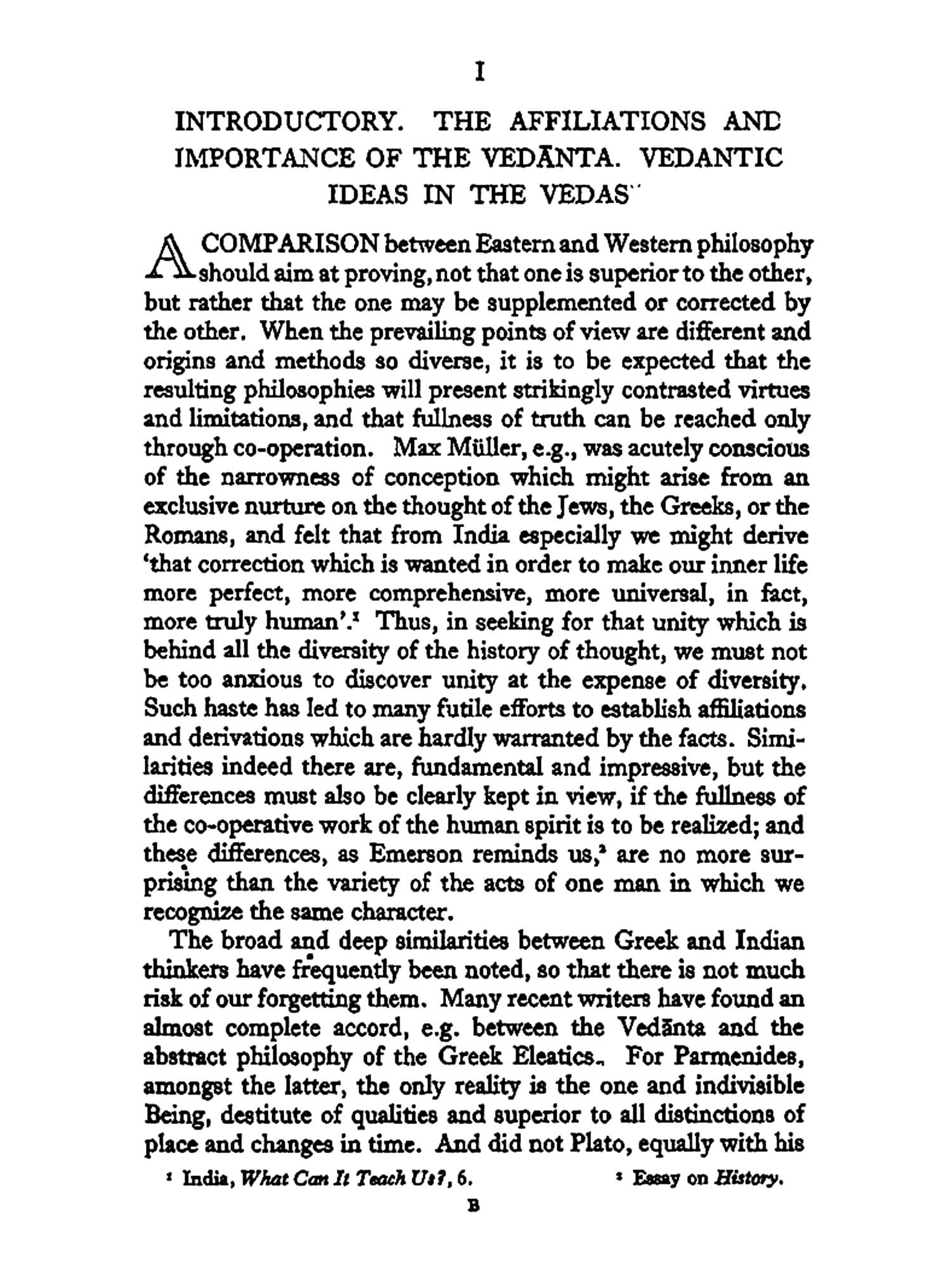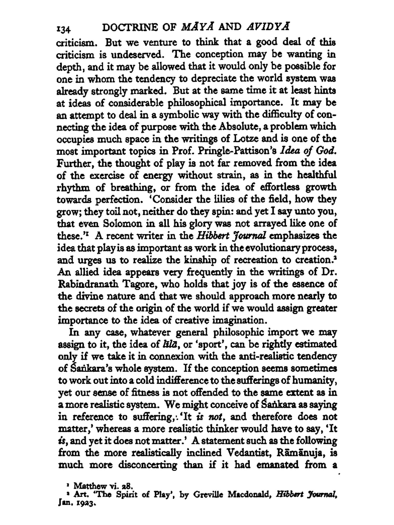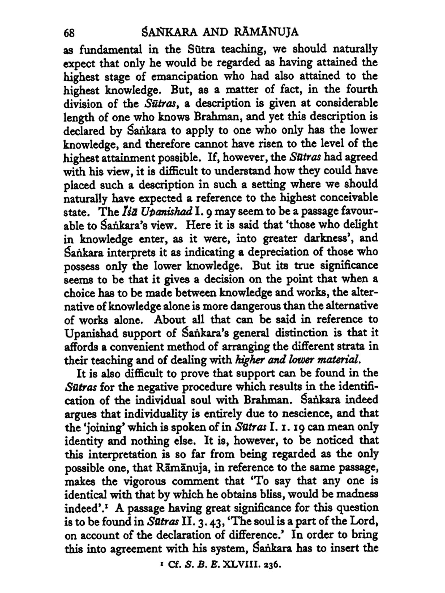 A study of the Vedanta leads to many general reflections on the relations between philosophy and religion, and in particular to the questions how far such a philosophy can satisfy religious needs and how far it can be regarded as a preparation for Christianity. I have tried to set forth some conclusions as to these and allied problems. Sankara has been taken as the typical philosopher of the school, for reasons which appear to me to be satisfactory; and the general trend of opinion amongst Indian writers and thinkers themselves would appear to justify this concentration. It has been my endeavour to carry out my task in a spirit of fairness, and to avoid the mistake of merely working towards a foregone conclusion. And I have no hesitation in saying that such studies as I have been able to make in Indian philosophy have confirmed me in the faith that God has not left Himself without a witness in the characteristic thought of India, that much of it is unconsciously anticipative of Christian thought, and that Jesus Christ will one day be recognized there also as the 'light which lighteth every man that cometh into the world'.