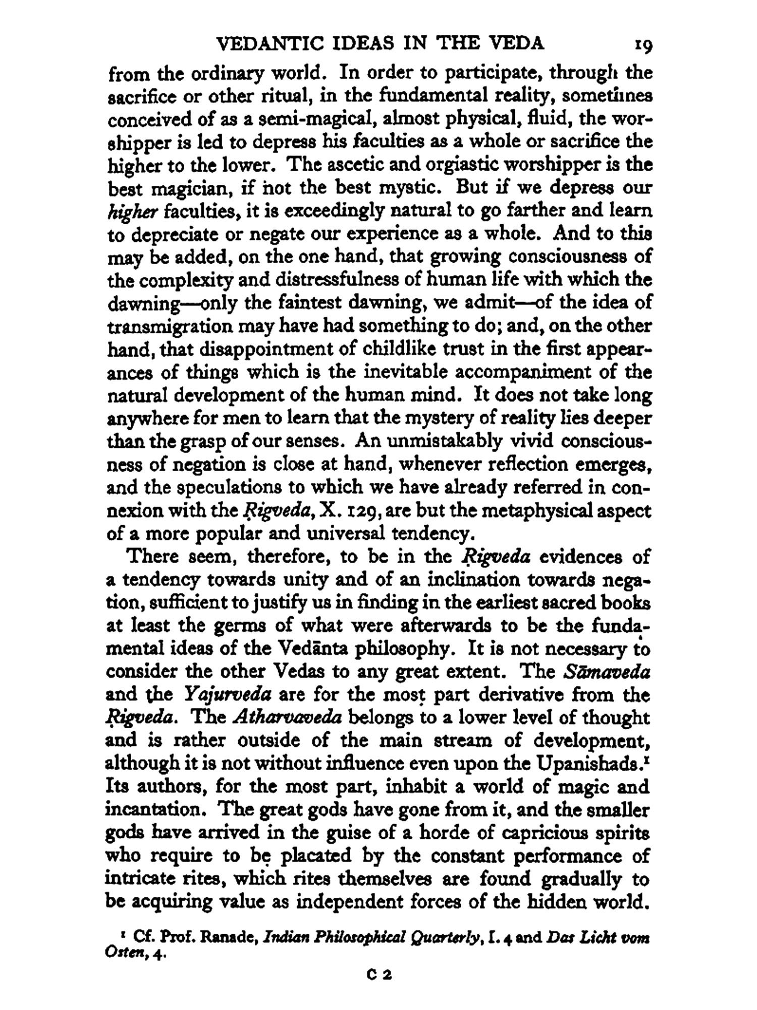 It cannot certainly be contended that in the course of the world's history India has been responsible for the only philosophical thought worthy of the name, but it may be argued with a considerable amount of justification that, at a very early period in intellectual development, the greater philosophical problems had presented themselves to the Indian consciousness and had received penetrating and illuminating treatment. India has had, and still has, a most important contribution to make to the thought of the world, and is well qualified to make this contribution by the intensity with which throughout the centuries she has devoted herself to her philosophical and philosophic religious task. Rarely has metaphysical speculation afforded to any people so absorbing an interest. As Prof. Radhakrishnan says: 'In many other countries reflection on the nature of existence is a luxury of life. The serious moments are given to action, while the pursuit of philosophy comes up as a parenthesis. In ancient India philosophy was not an auxiliary to any other science or art, but always held a prominent position of independence.'