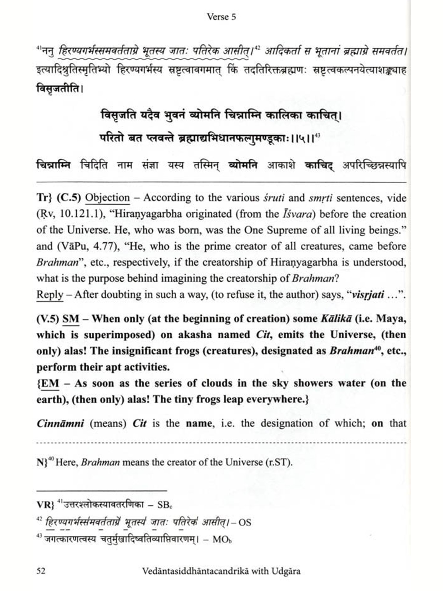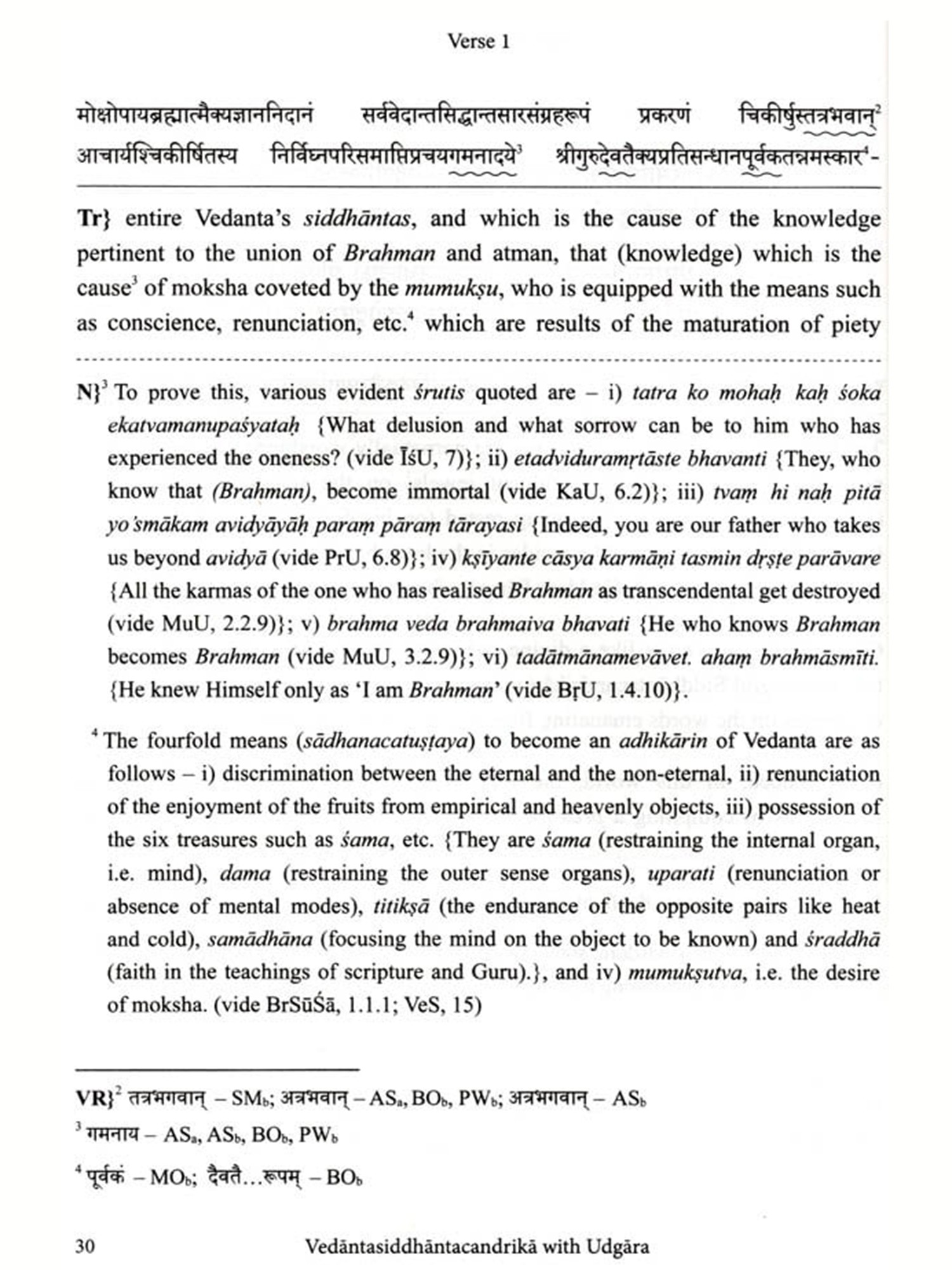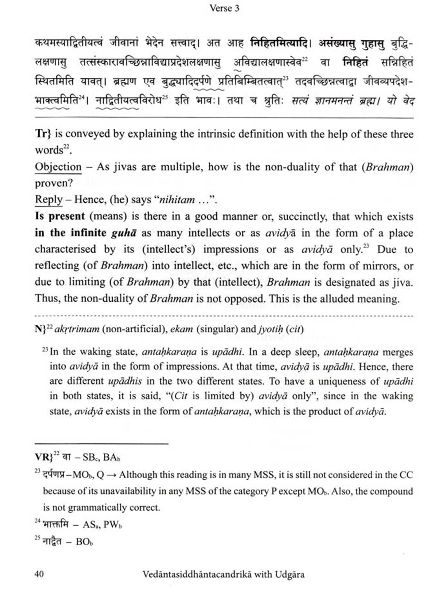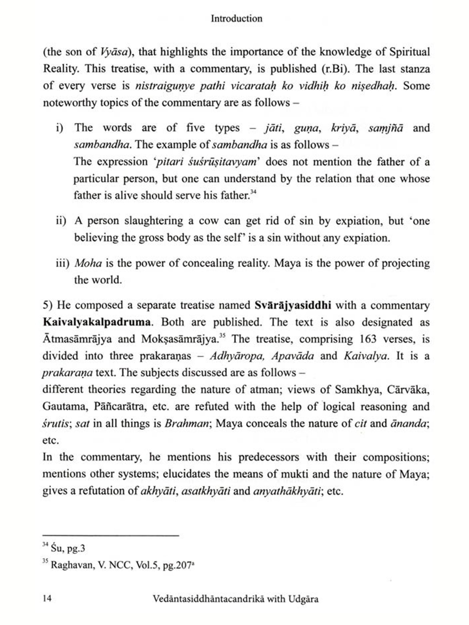 I am delighted to write Vedäntasiddhäntacandrikä with the commentary Udgara, critically edited with an few words about the present work English translation and notes by Dr Rohan Achyut Kulkarni The text. Vedantasiddhäntacandrika, also known as Siddhäntacandrika, is a product of the rich Advaita Vedanta tradition, composed by Rämänandasarasvati or Rämänandayati (r. colophon) in the 17 C.E. Gangadharendrasarasvati, the 38° Sankaracharya (from 1648 to 1653 C.E.) of Swarnavalli Matha (one of the Upapithas of Sankaracharya's tradition), Sonda, Sirsi, Karnataka, added his insights to this text through his commentary Udgara. The commentator was a disciple of Rämacandrasarasvati, the 36 Sankaracharya (from 1620 to 1642 C.E.) of Swarnavalli Matha, which is evident from the colophon (iti srimat-paramahamsa-parivrajakācārya-śrīmad-rămacandra-sarasvati-pūjyapada-sisya-śrī-gangadhara sarasvati-viracitaḥ siddhāntacandrikodgārah sampürnah).